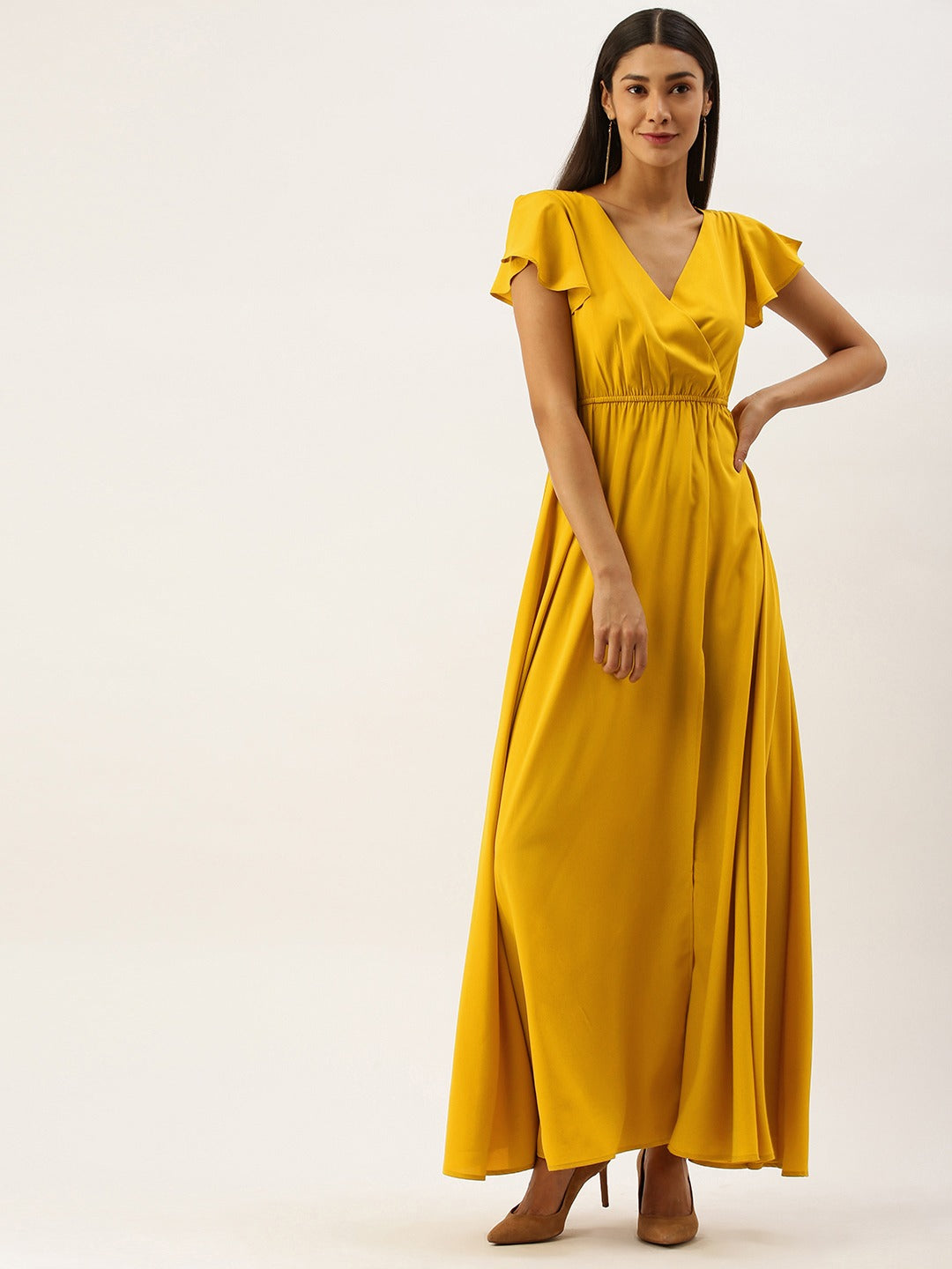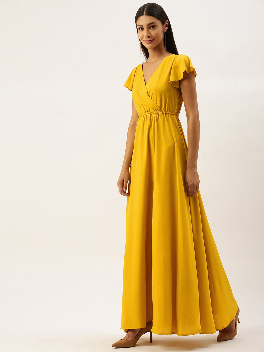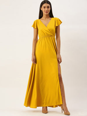 Never go out of style with this Berrylush Solid Yellow V-Neck Short Sleeve Maxi Dress. This elegant maxi dress is tailored with polyester fabric to keep you comfortable all day long. The short flared sleeves with flared hemline fall gracefully to give you a chic appearance. The hem also has slit detailing for a fashionable appeal. The V-neckline of this dress highlights your collar bones. Its cinched waist beautifully wraps around your body for a figure-flattering look. This stylish yet elegant maxi dress is perfect for casual gatherings or special evenings. Complete your look by complementing it with your favorite handbag or clutch and cute high heels.