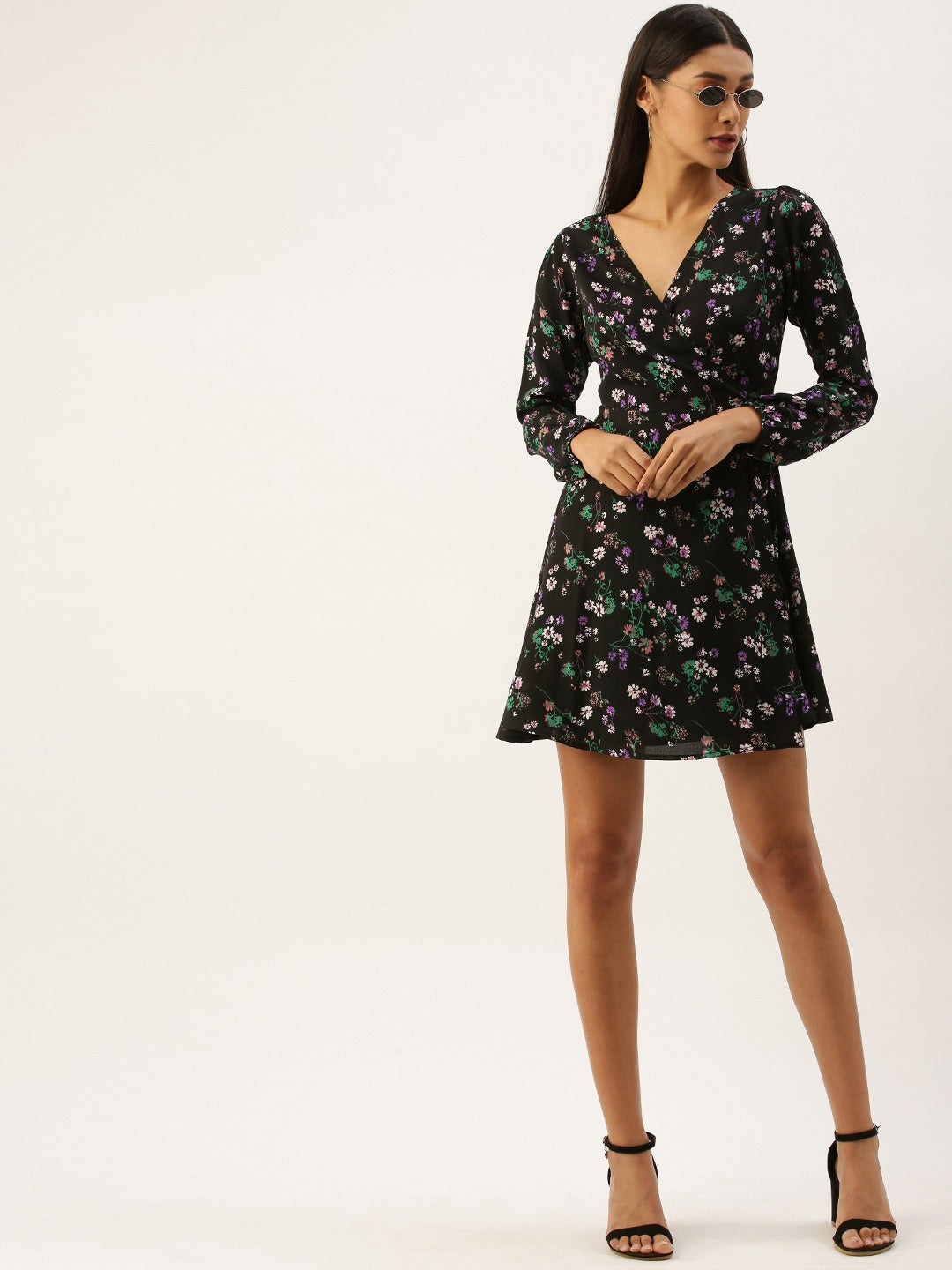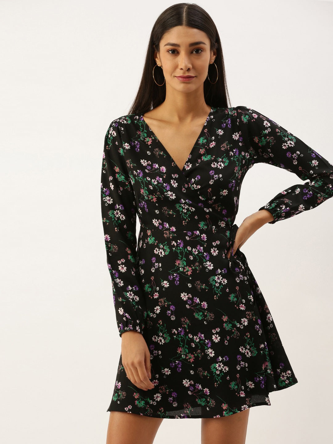 Looking for something that is ideal for all seasons. What to wear for office lunch? Or a dinner at a friend's house? Or even to a blind date! Then this Black Floral Printed V-Neck Wrap Mini Dress by Berrylush is your answer. It has a V-neck for a slender appeal, but what enhances the tenderness more is the wrap-up dress look hence adding a new charm to the attire. Comes with regular long sleeves, the woven piece is a mix of new and basic trends. The allover floral print adds to the vibrant look thus you can carry it at any event. So what are you waiting for sport the dress, grab a cute clutch put on those heels and you are party-ready!