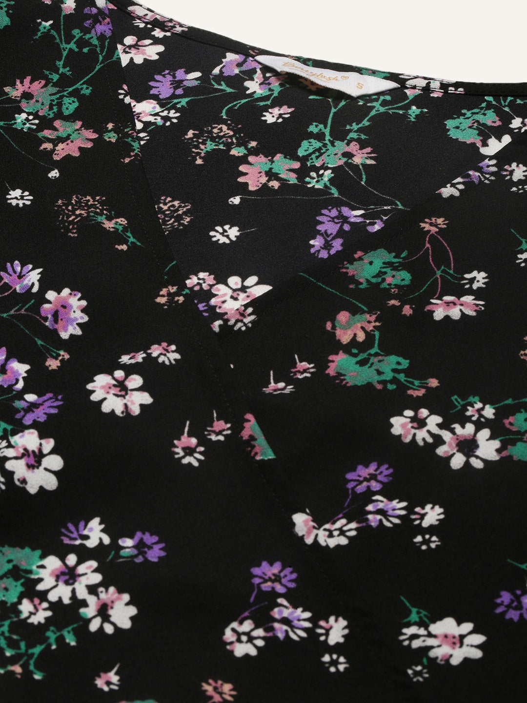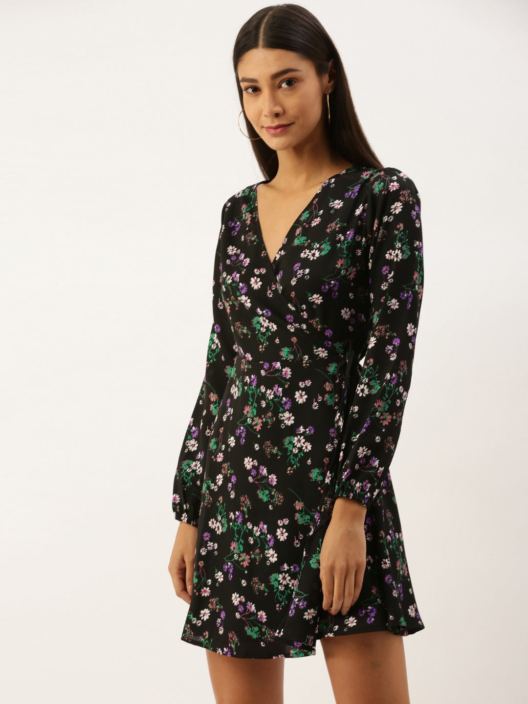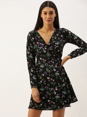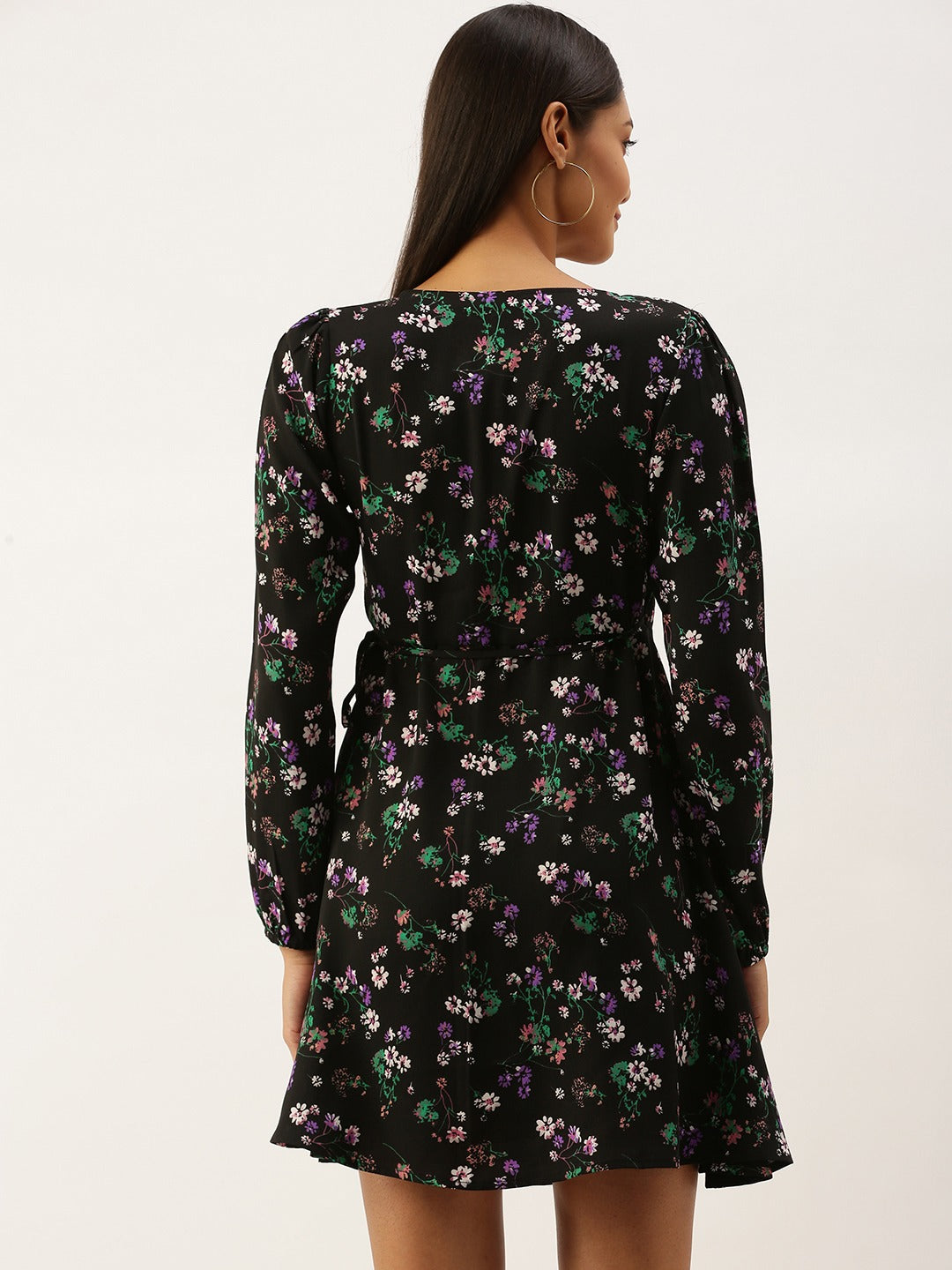 Berrylush Women Black Floral Printed V-Neck Wrap Mini Dress
