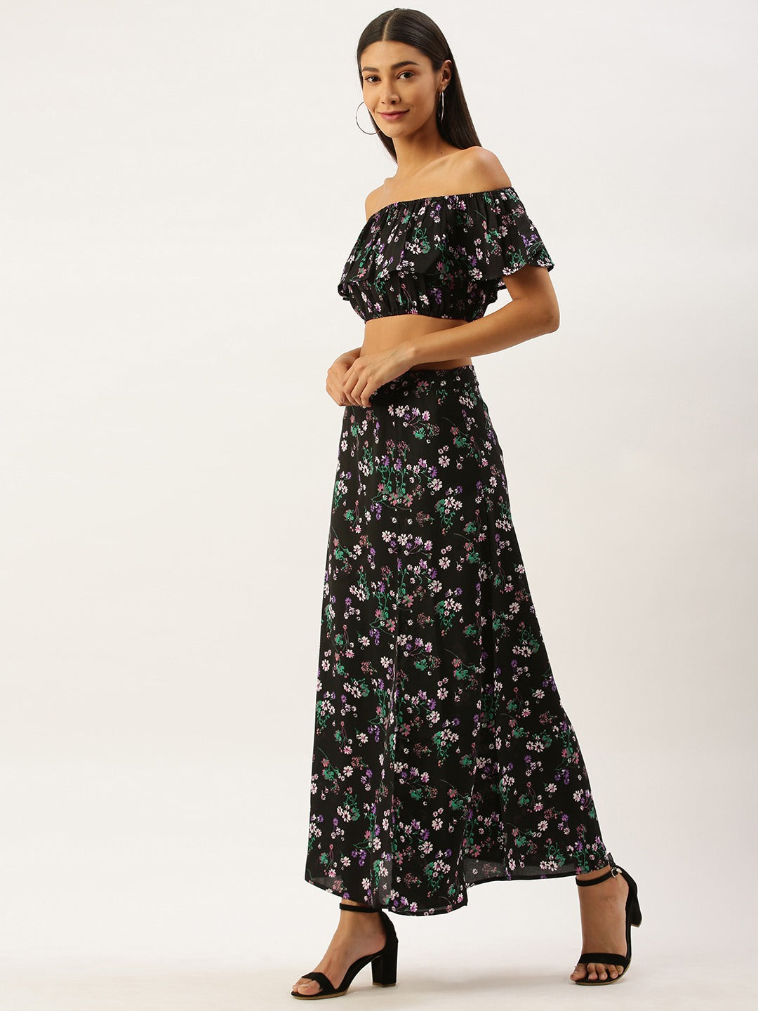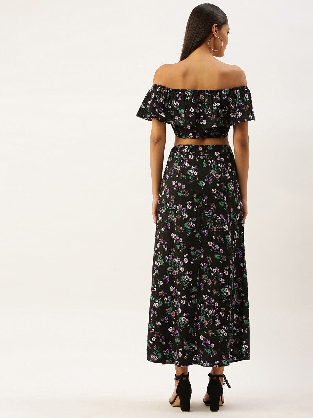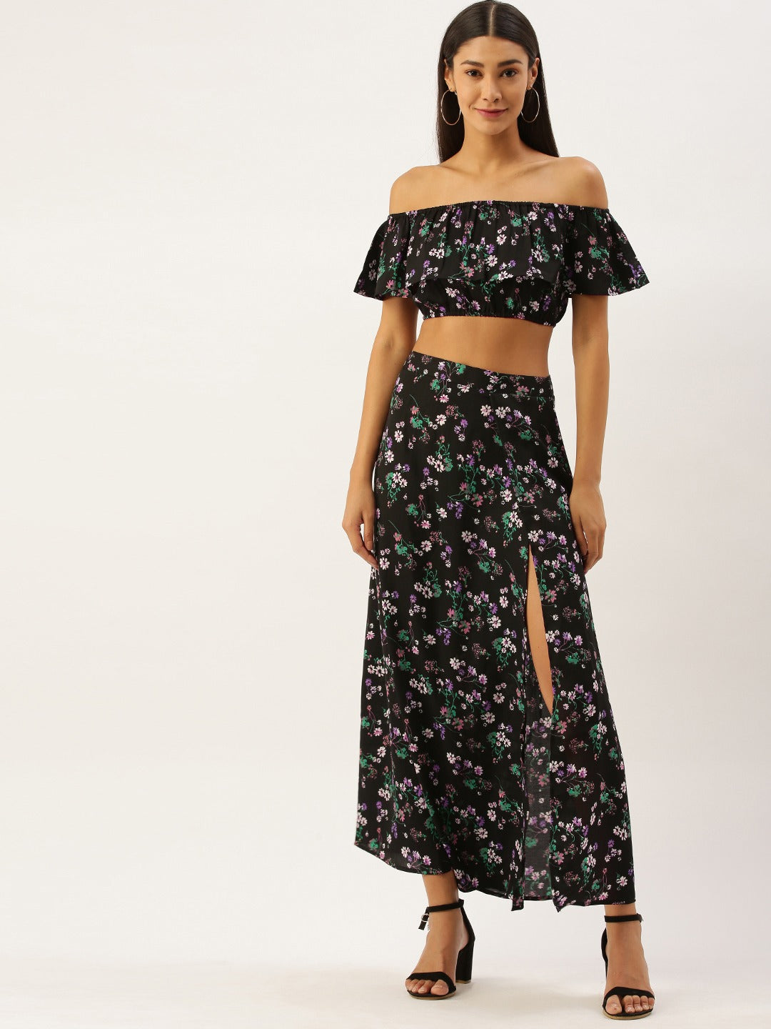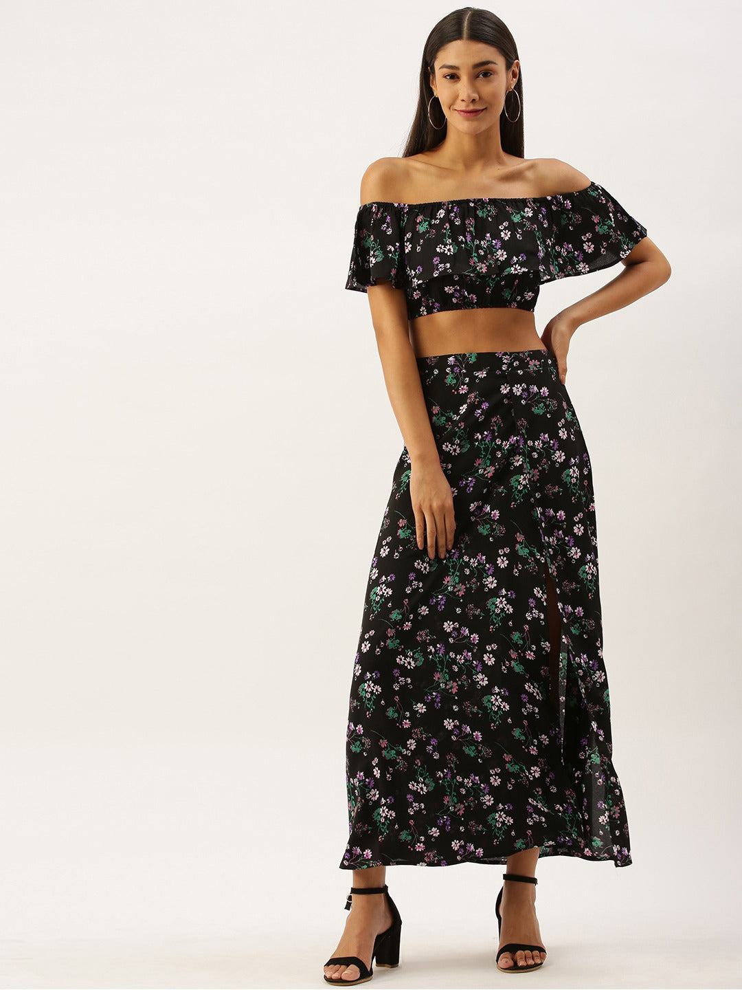 Berrylush Women Black Floral Printed Top And Skirt Set