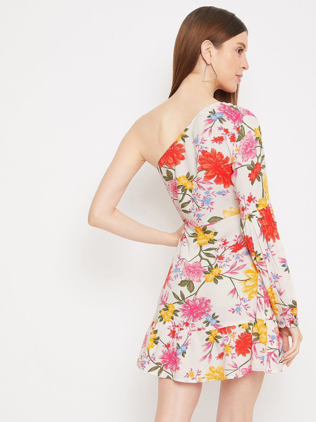Berrylush White Floral Printed Fit & Flare Dress going to be a stunning day beach partywear for sunlit summers! The white cotton plush texture is a fabulous summer wear option. This summer redesign your wardrobe with the latest chic white floral motif ruffled fit & flare dress. The asymmetrical single off-shouldered dress has all the features that a fashionista longing for. On one side is a sleeveless boldness and on the other is a vintage bishop long sleeve, creating a mix of two extreme fashions. Match this serene, candid floral piece with white pumps for a beautiful appearance. Buy this all-in-one floral partywear from Berrylush and spread a style statement that never fades out.
