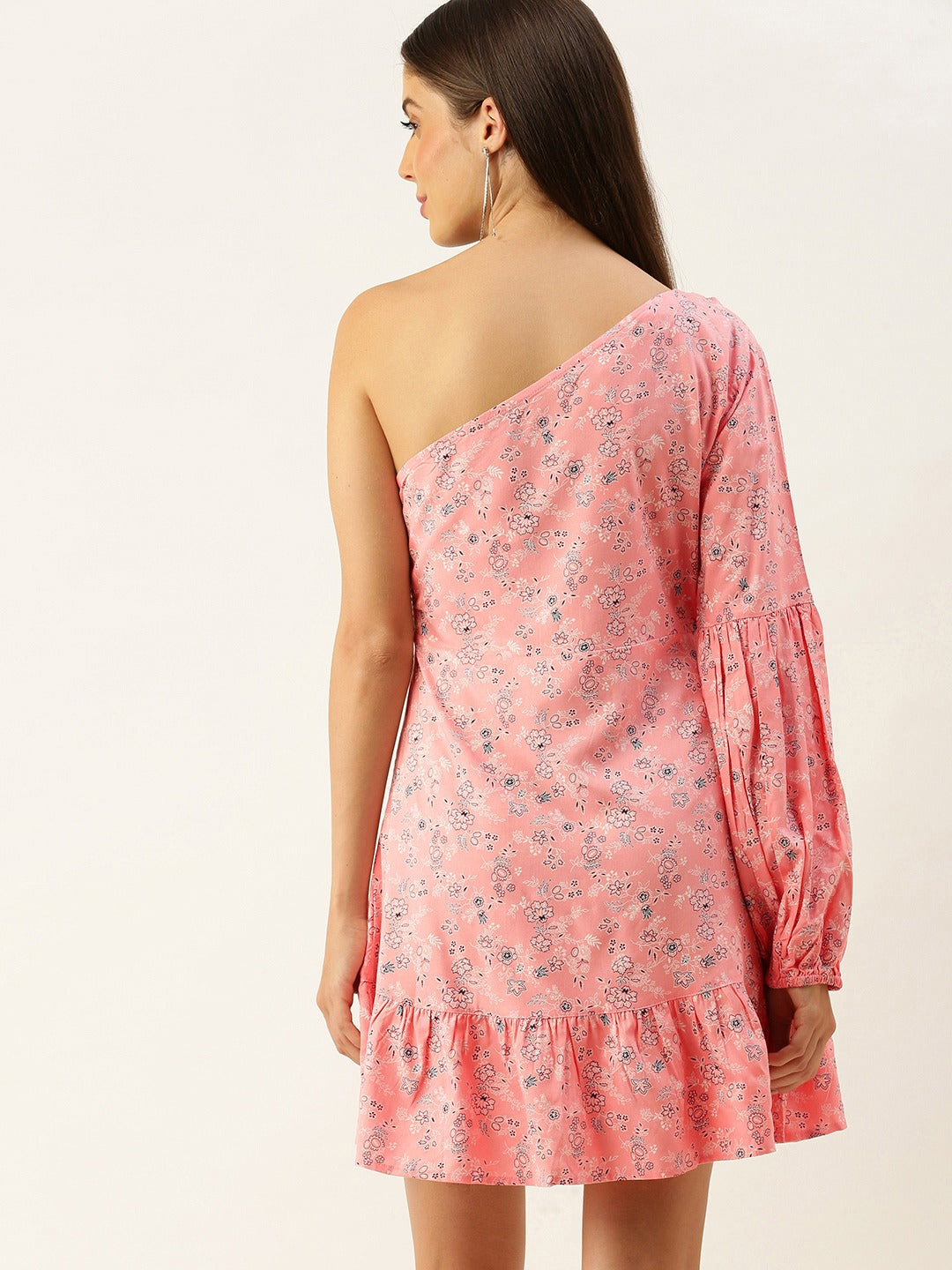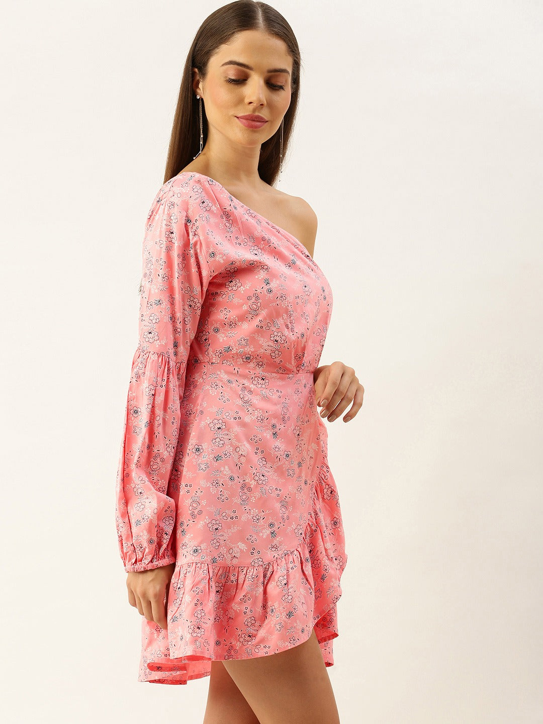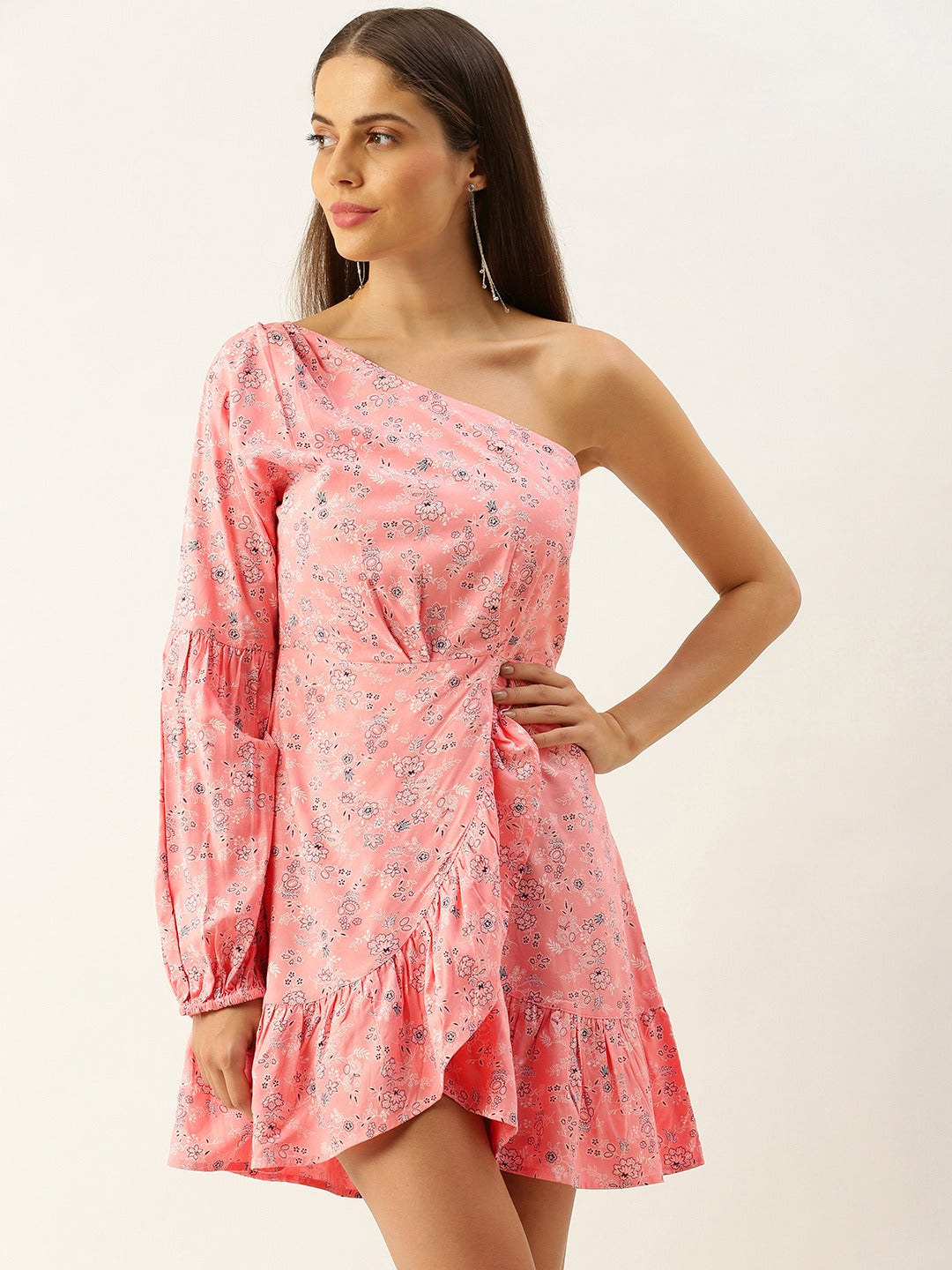 Accentuate your summer outing look with contemporary style just like this pretty Pink Floral Printed One-Shoulder Neck Tulip Hem Fit & Flare Mini Dress from Berrylush. Spun from lightweight polyester fabric that would keep you cool and ventilated throughout the day. The long cuffed sleeve helps to keep your arm warm and the sleeveless design on the other hand provides restricted free movement. Comes with a concealed zip closure that gives a refined sheen to this dress and the above-knee length helps to avoid any kind of discomfort while walking. Leave a remarkable impression on your first date by wearing this chic pink printed dress with a pair of caged heels, a sling bag, and minimalistic silver jewellery.