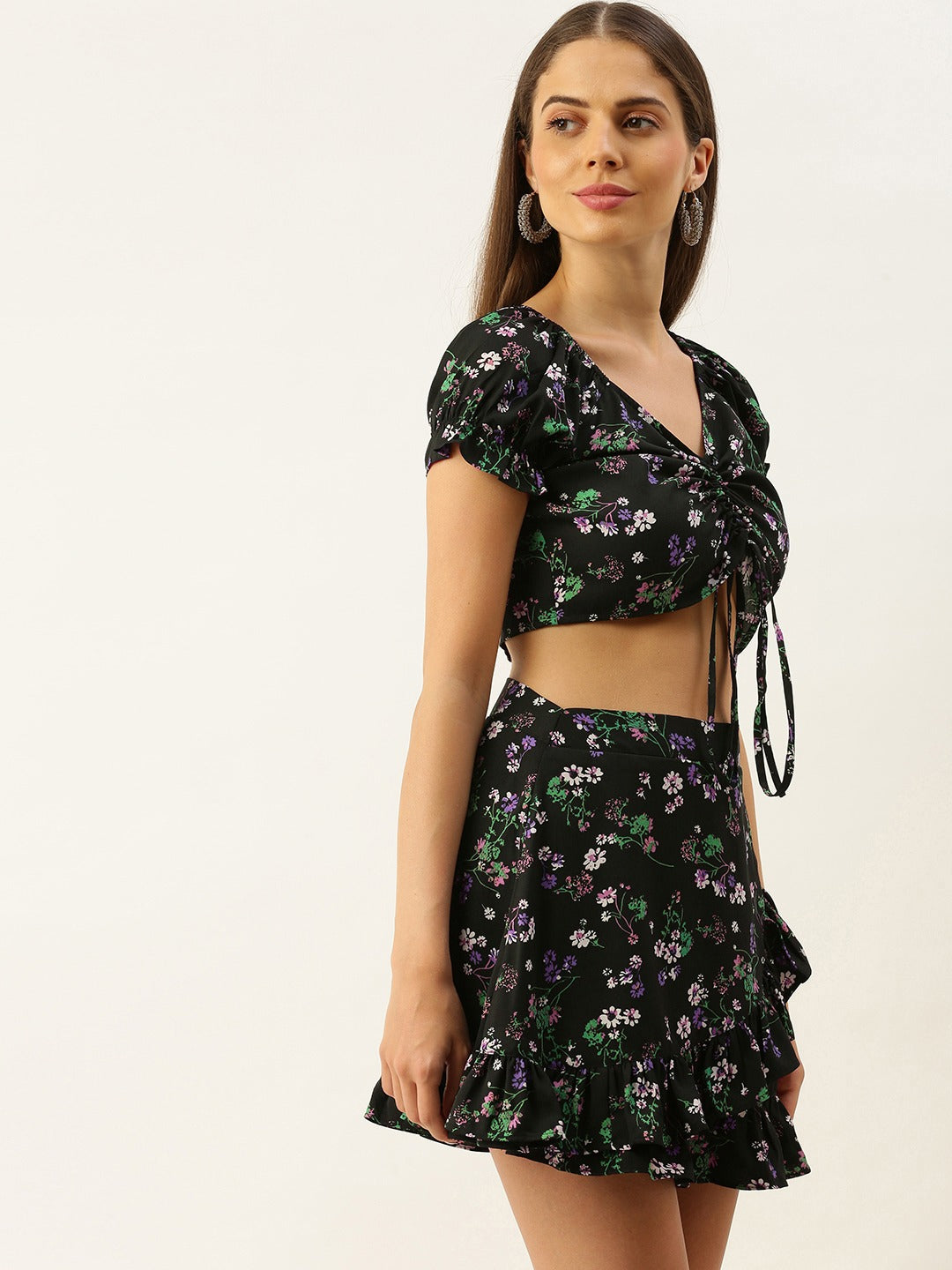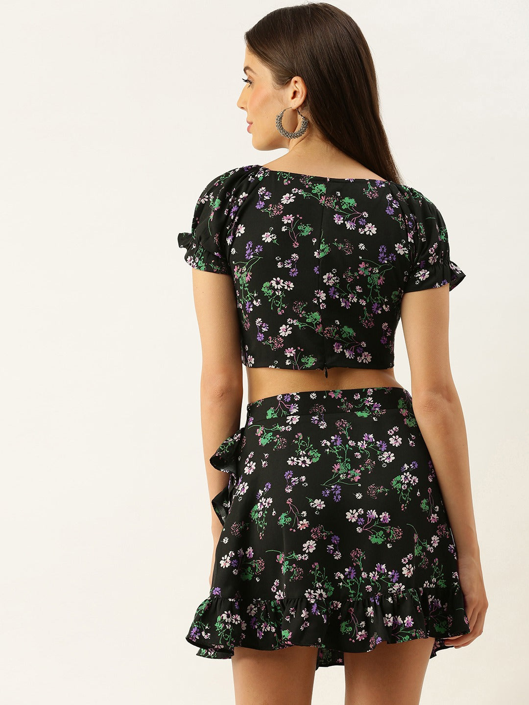 Let the world be smitten by the way you dress in this Black Floral Printed V-Neck Fit & Flare Co-Ordinate Mini Dress from Berrylush. The crop top gives your neckline a sublime look with a V-shaped design. If you're in the mood of flaunting your beautiful arms, then get this crop top which has short puffed sleeves. The torso comes with a flirty essence by the presence of the sharp long drawstring. The alluring floral print going to put a flowery freshness to this springtime evening casual style. Amaze people with the bottom flared mini skirt. The asymmetric ruffled design gives your bottom a flowery and bouncy layout. Match this dazzling co-ord dress set with strappy heels and bring the ultimate opulence with Berrylush.