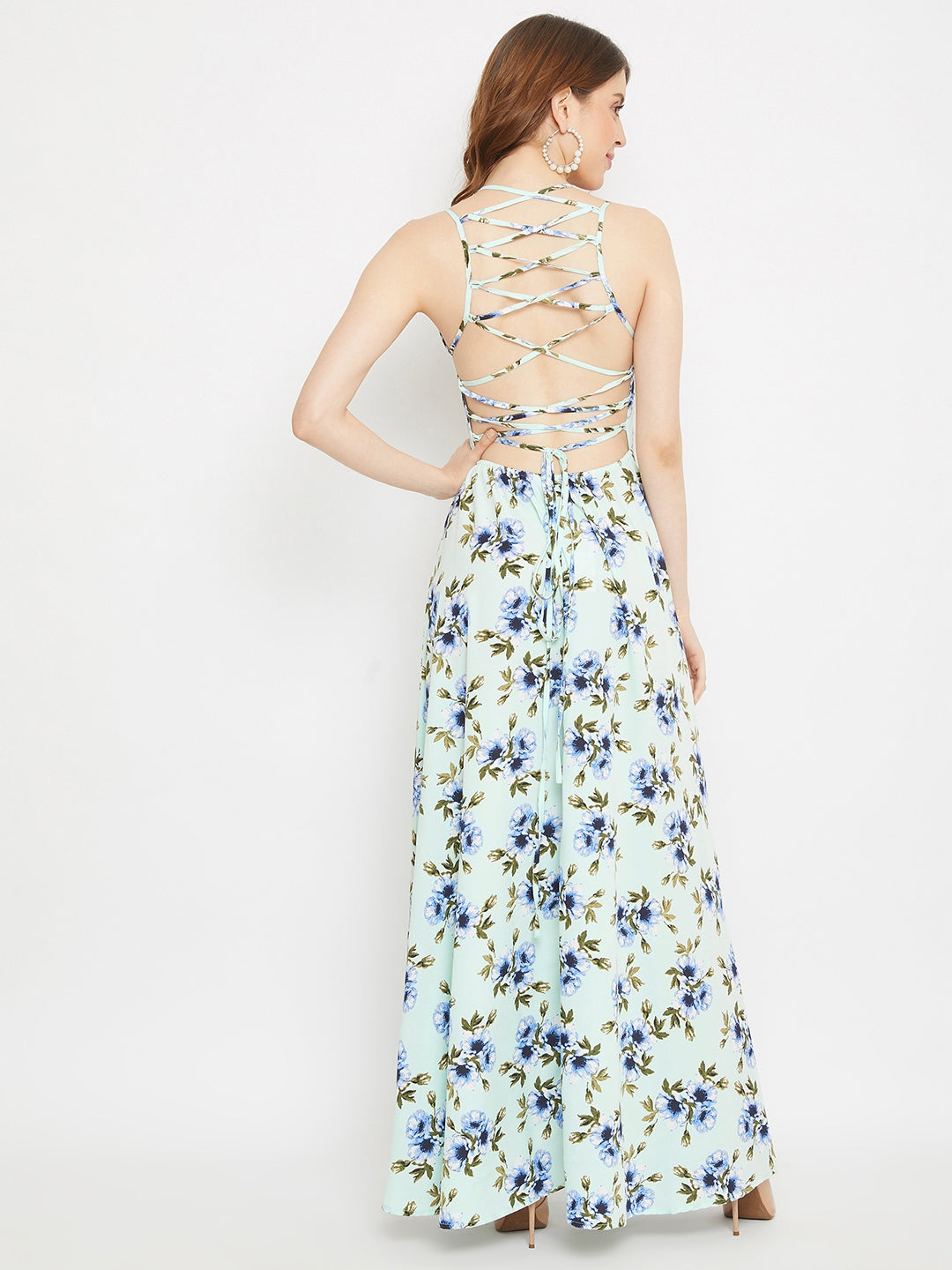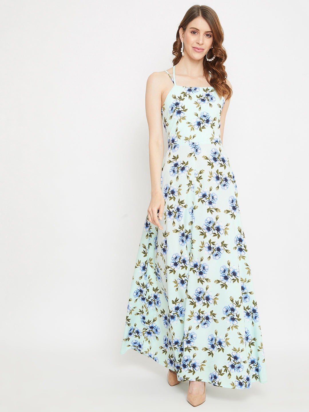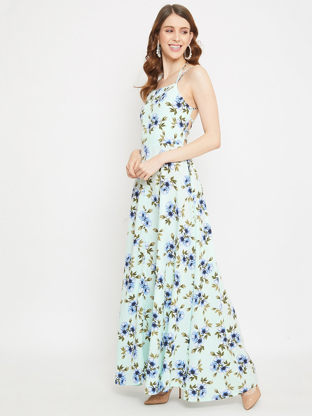 Berrylush Women Green Floral Print Tie-up Maxi Dress