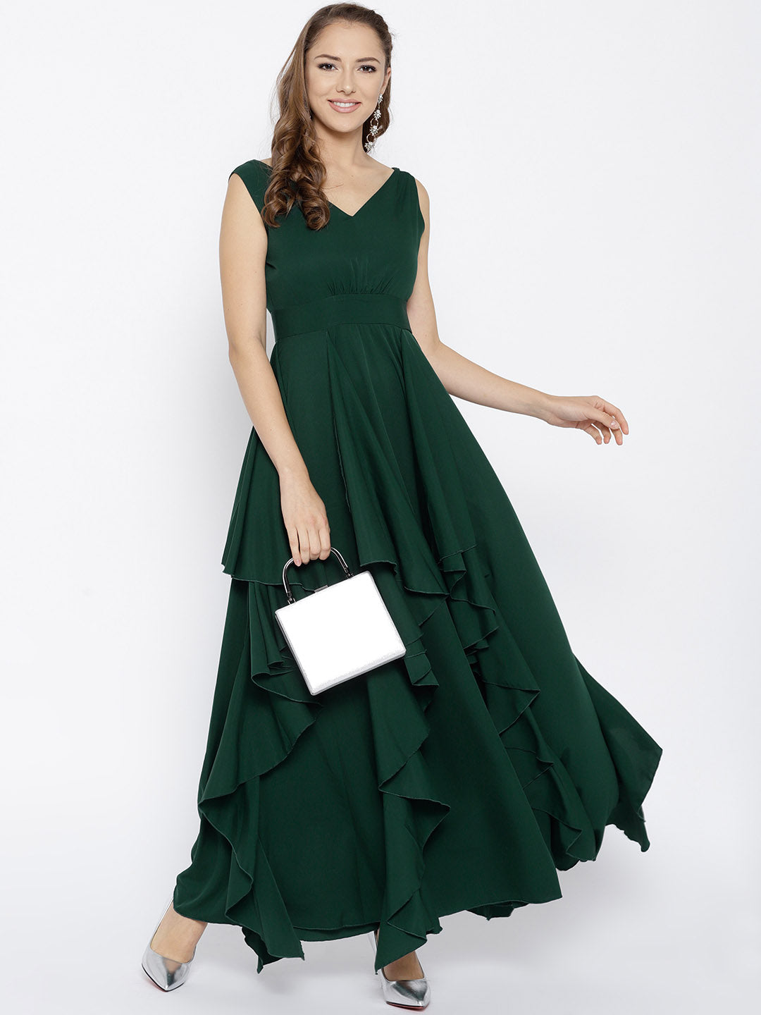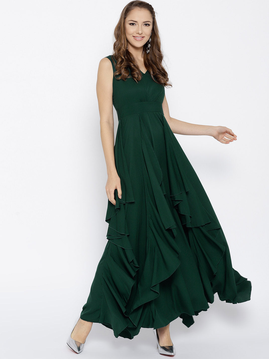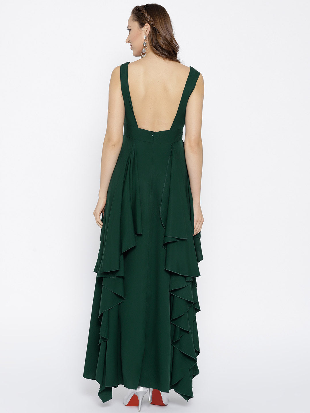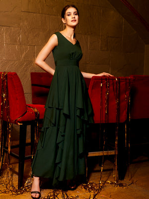 Opt for vintage and vigorous style while heading towards your upcoming party events with this glamourous Solid Green V-Neck Crepe Asymmetrical Hem Ruffled Maxi Dress from the party wear collection introduced by Berrylush. Compromising with asymmetric hemline to add volume and textures sheen to the maxi dress while the V-neck design gives an alluring exposure to your beautiful neckline. The sleeveless feature of the maxi dress lends an eccentric appeal to your arms along with an uninterrupted movement. Complete the look by partnering up this elegant green maxi dress with a pair of high-heels, hoop earrings, and a sling bag to add feminine charm.