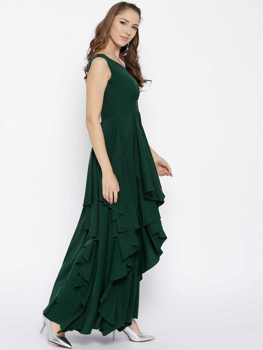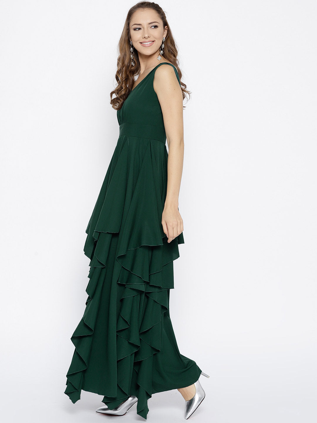 Berrylush Women Solid Green V-Neck Crepe Asymmetrical Hem Ruffled Maxi Dress
