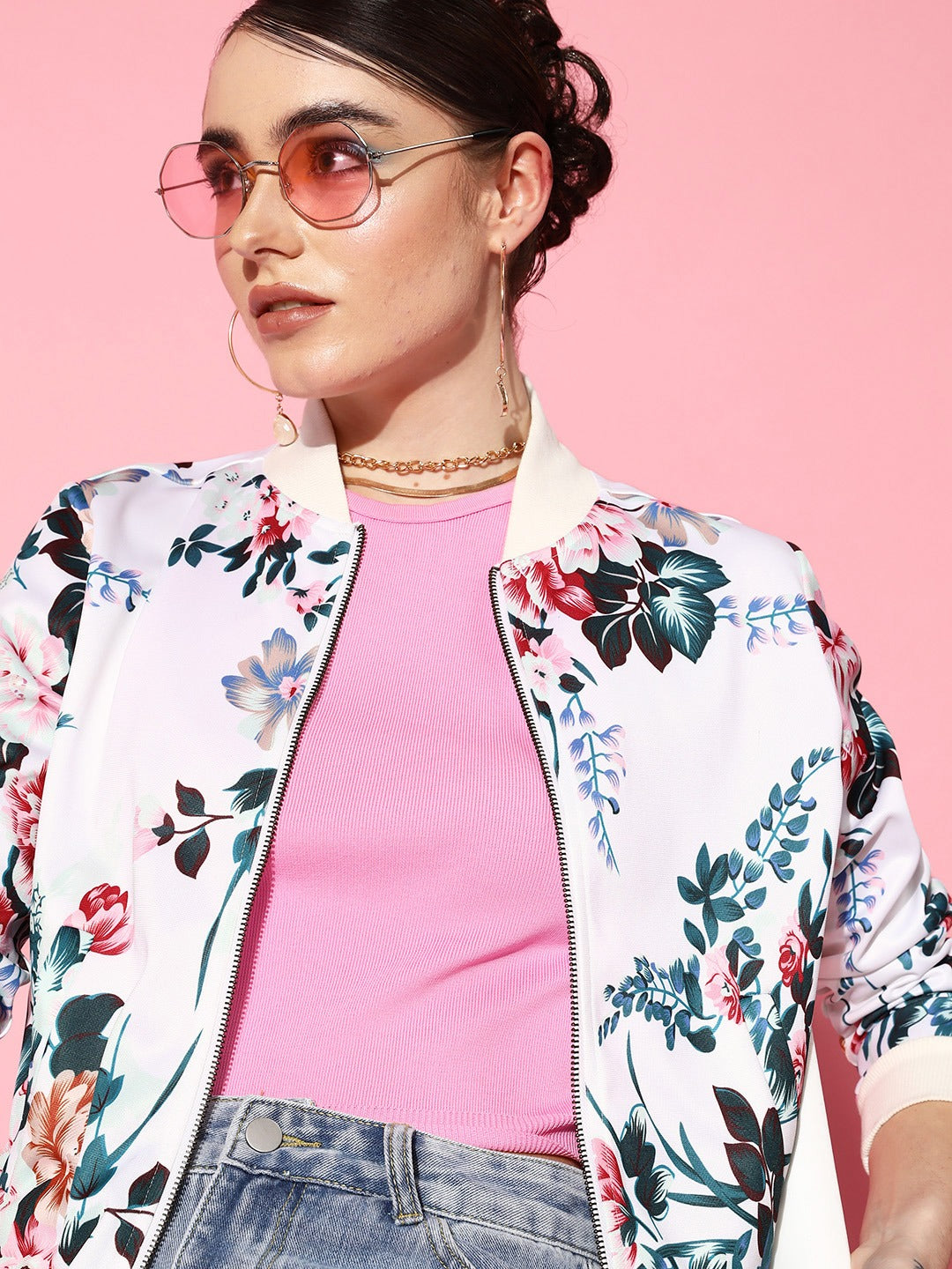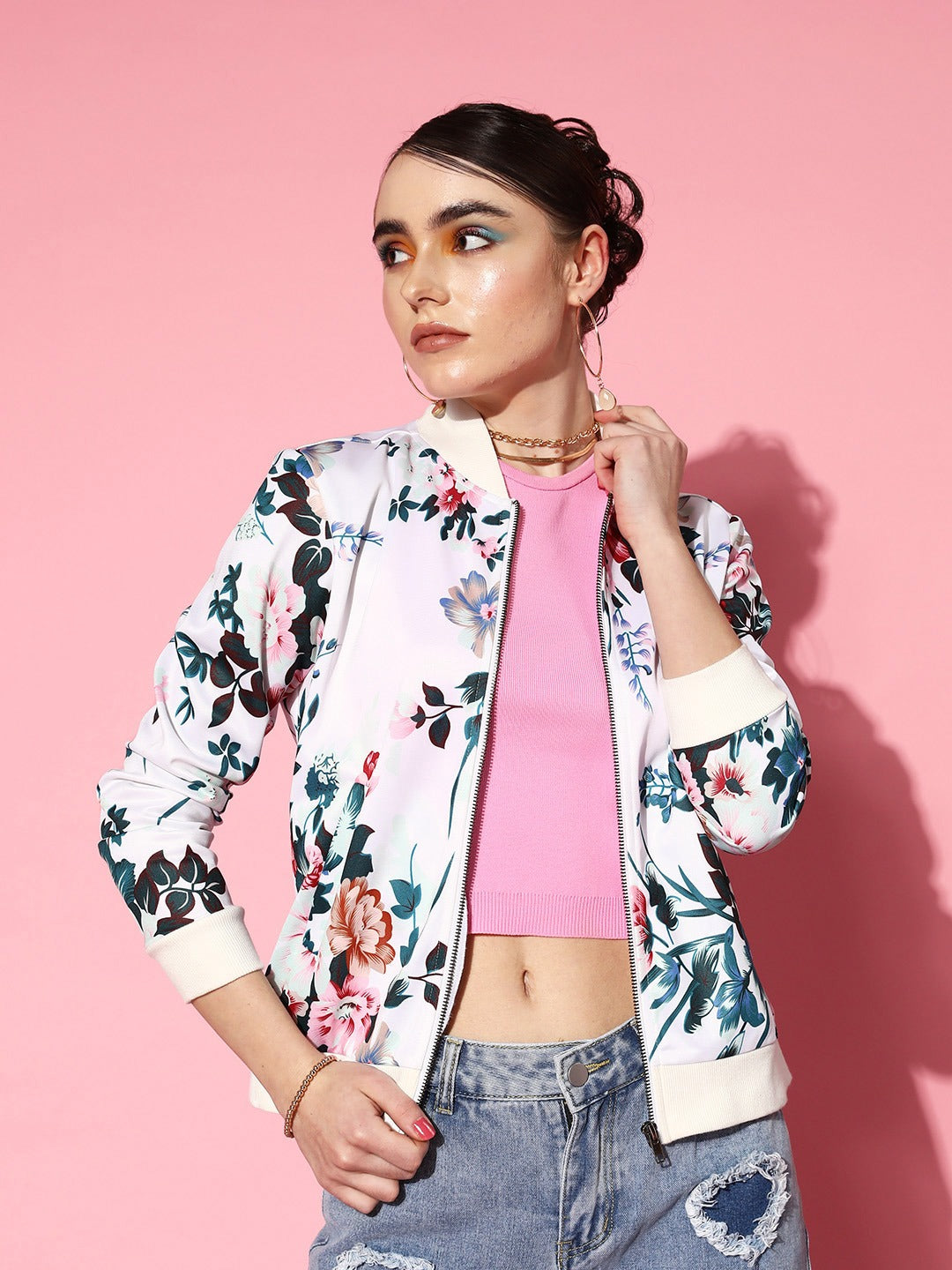 Give your casual attires a chic and fashionable upgrade by adding to your cart this beautiful White Floral Printed Mock Collar Bomber Regular Jacket introduced by Berrylush. Rendered from the finest polyester material that offers this jacket excellent quick-drying feature that keeps your skin moist-free all throughout the day. Presenting long-regular sleeves that lend your arms proper and attractive coverage to keep them protected from harsh cold winds. Moreover, the regular length presents a realistic and practical design of this jacket that keeps your upper body covered and warm. Layer up this jacket over your favourite top, denim jeans, a pair of contrasting heels, floral hoop earrings, and a trendy handbag to get a stunning look for your night-out plans.