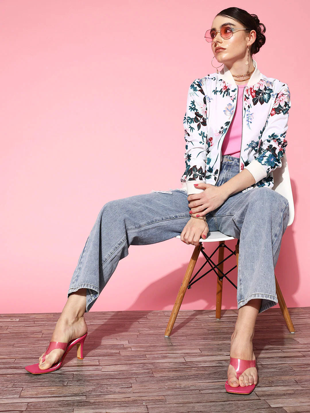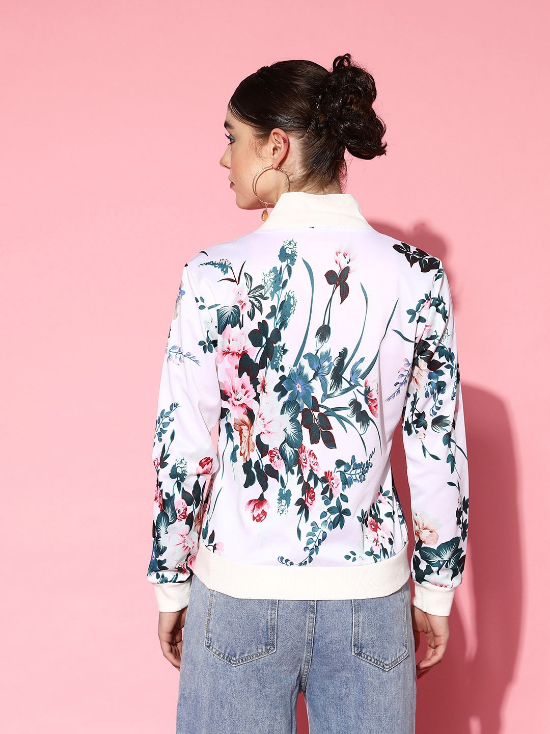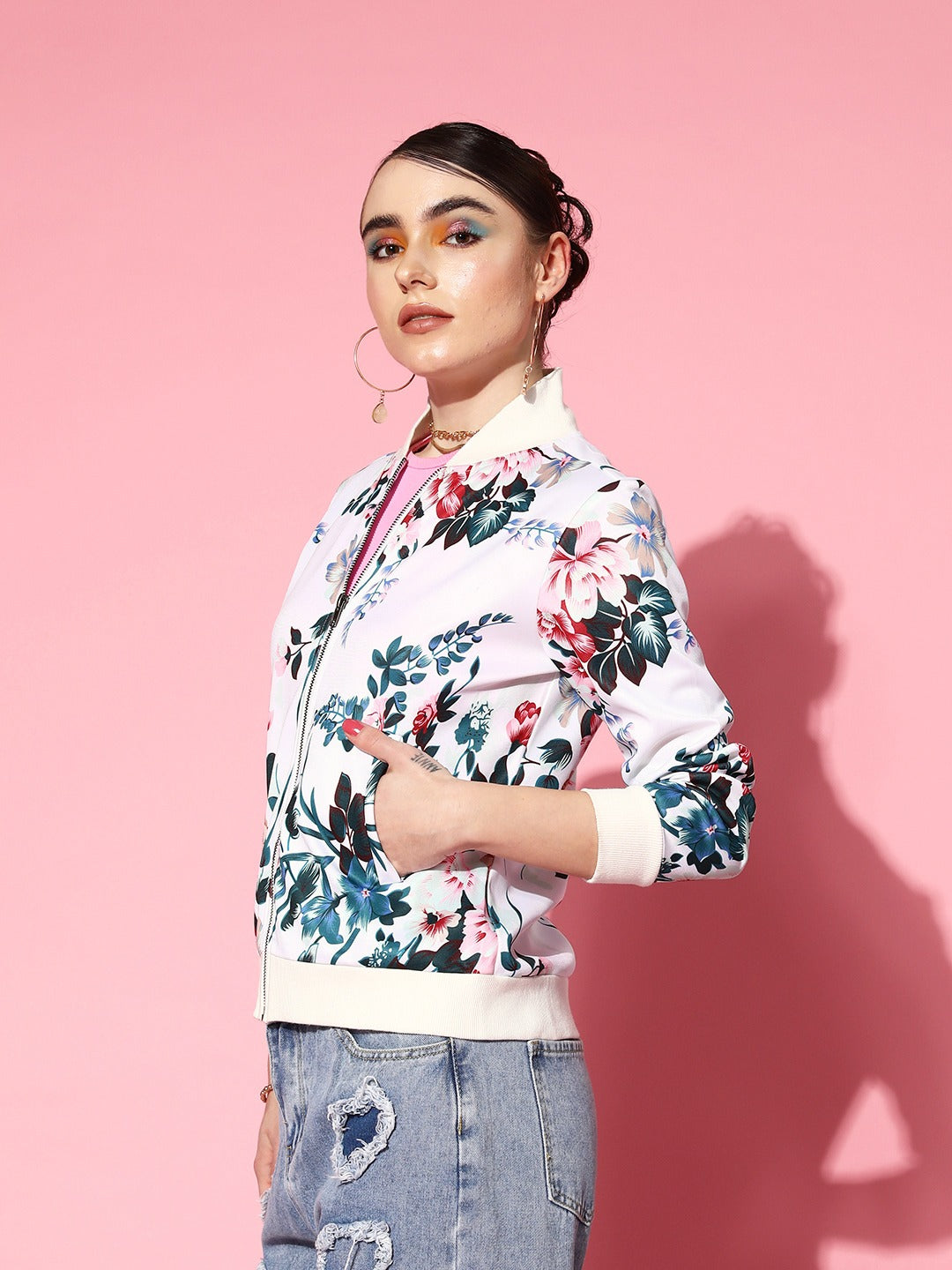 Berrylush Women White & Blue Floral Printed Mock Collar Neck Two-Pocket Straight Hem Bomber Regular Jacket
