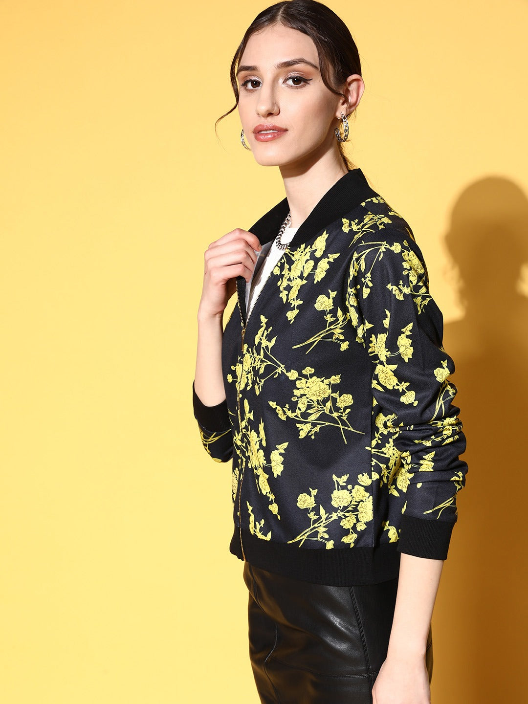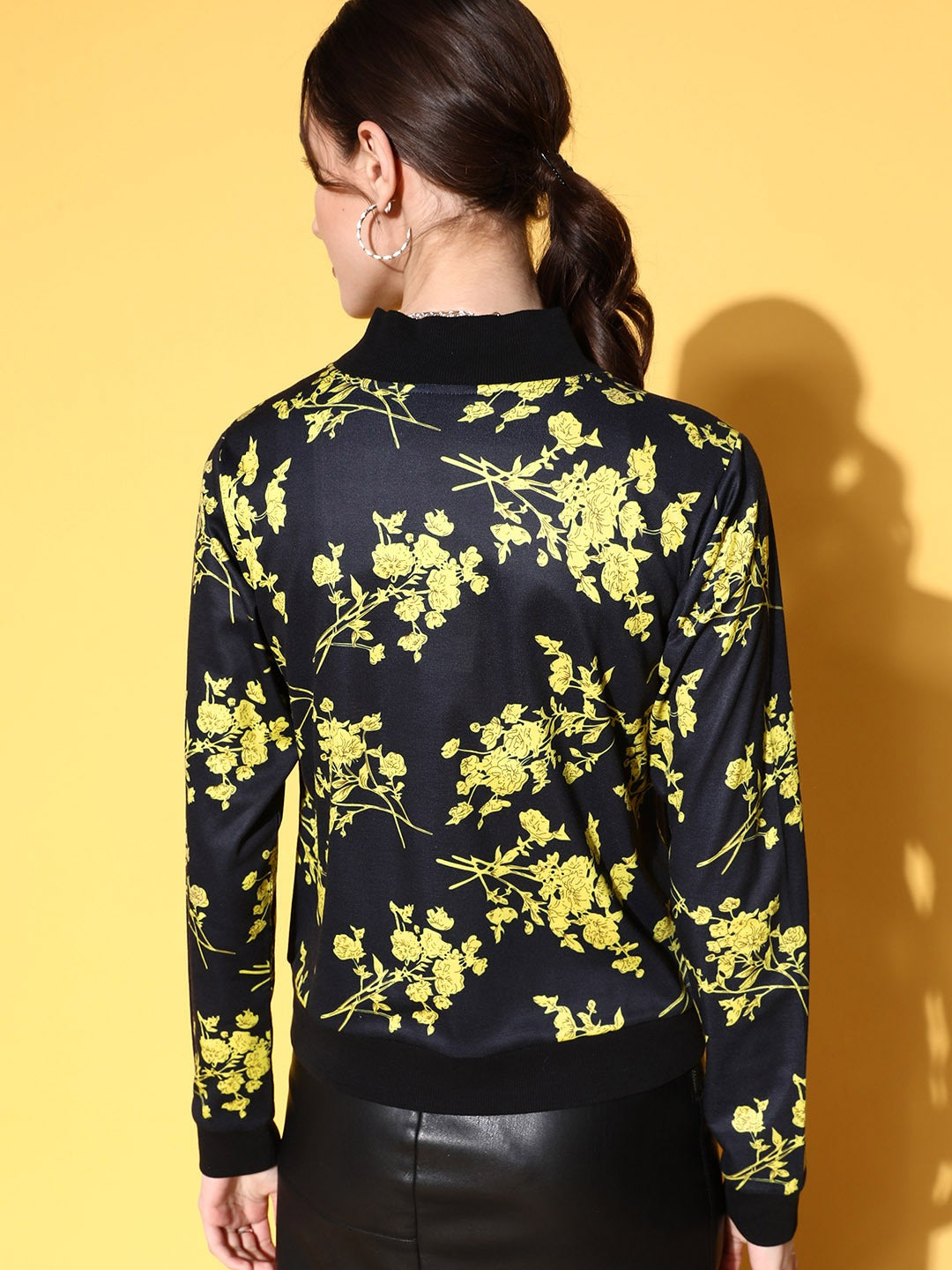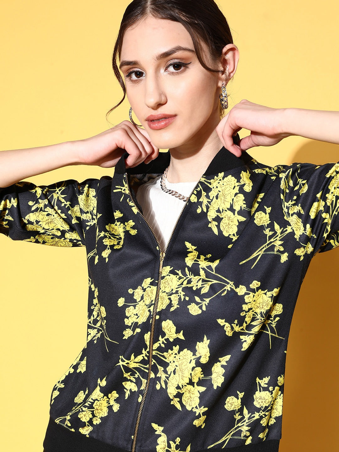Berrylush Women Black & Yellow Floral Printed Mock Collar Neck Straight Hem Regular Bomber Jacket