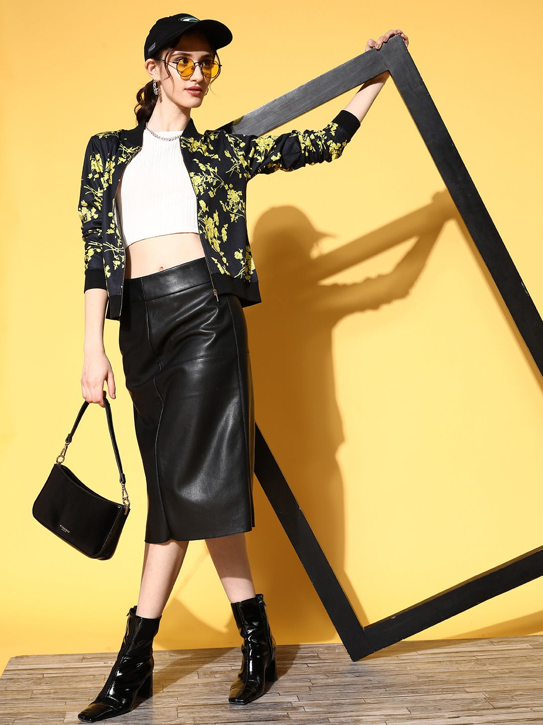 Add a stylish touch to your winter outfits by layering them up with this stunning Black & Yellow Floral Printed Mock Collar Neck Straight Hem Regular Bomber Jacket designed by Berrylush. Featuring a classic mock collar design that lends this jacket an edgy and smart styling note with a sophisticated outline to your beautiful neckline. Comes with a zip closure at the front that presents a practical and functional design of this jacket that simplifies the fastening process. Moreover, the regular length makes this jacket a perfect layering option for any casual events without worrying about the cold weather or running your look. Partner up this bomber jacket over a white crop top, leather skirt, a pair of black boots, and a matching handbag for a dazzling look.