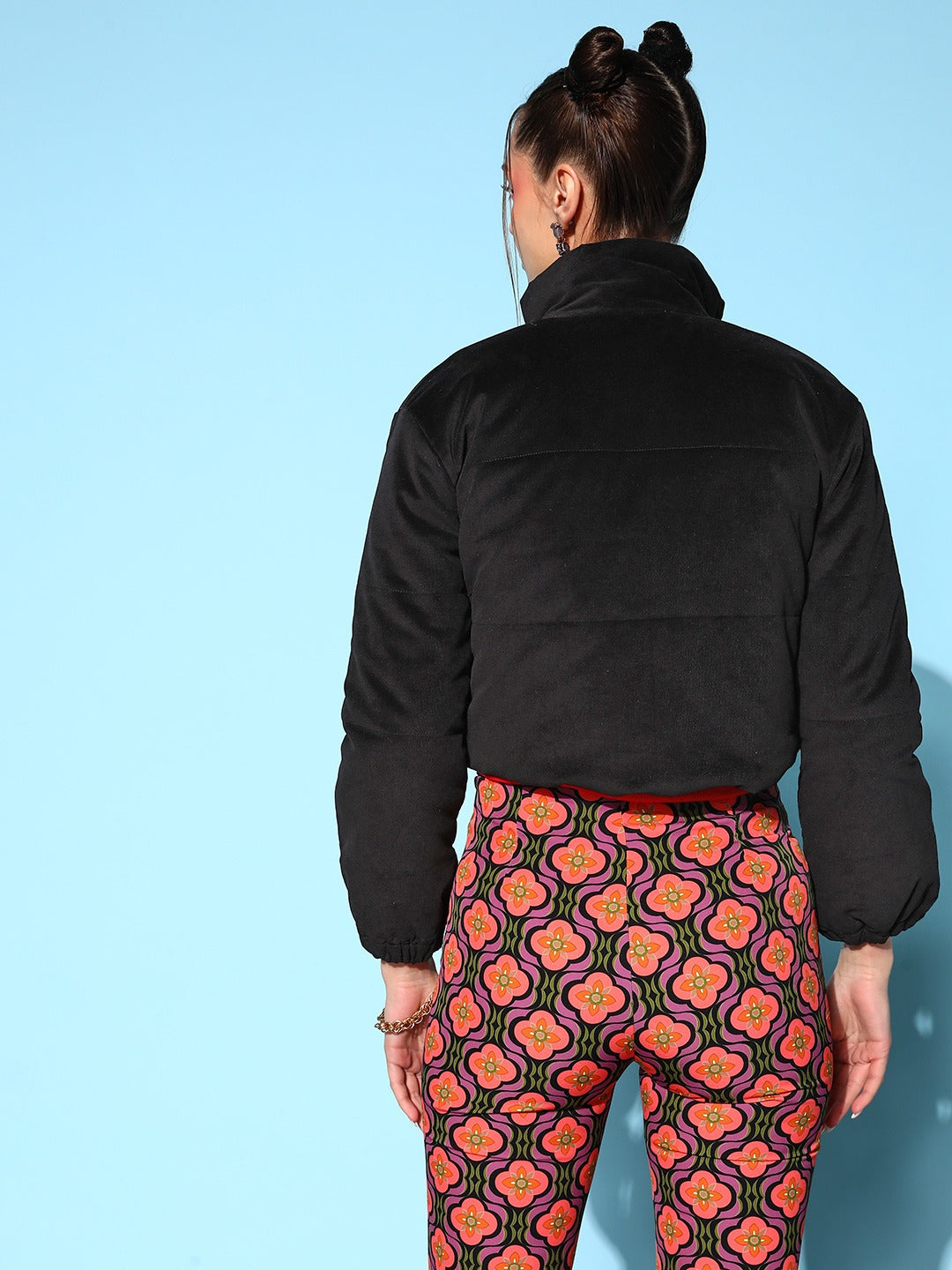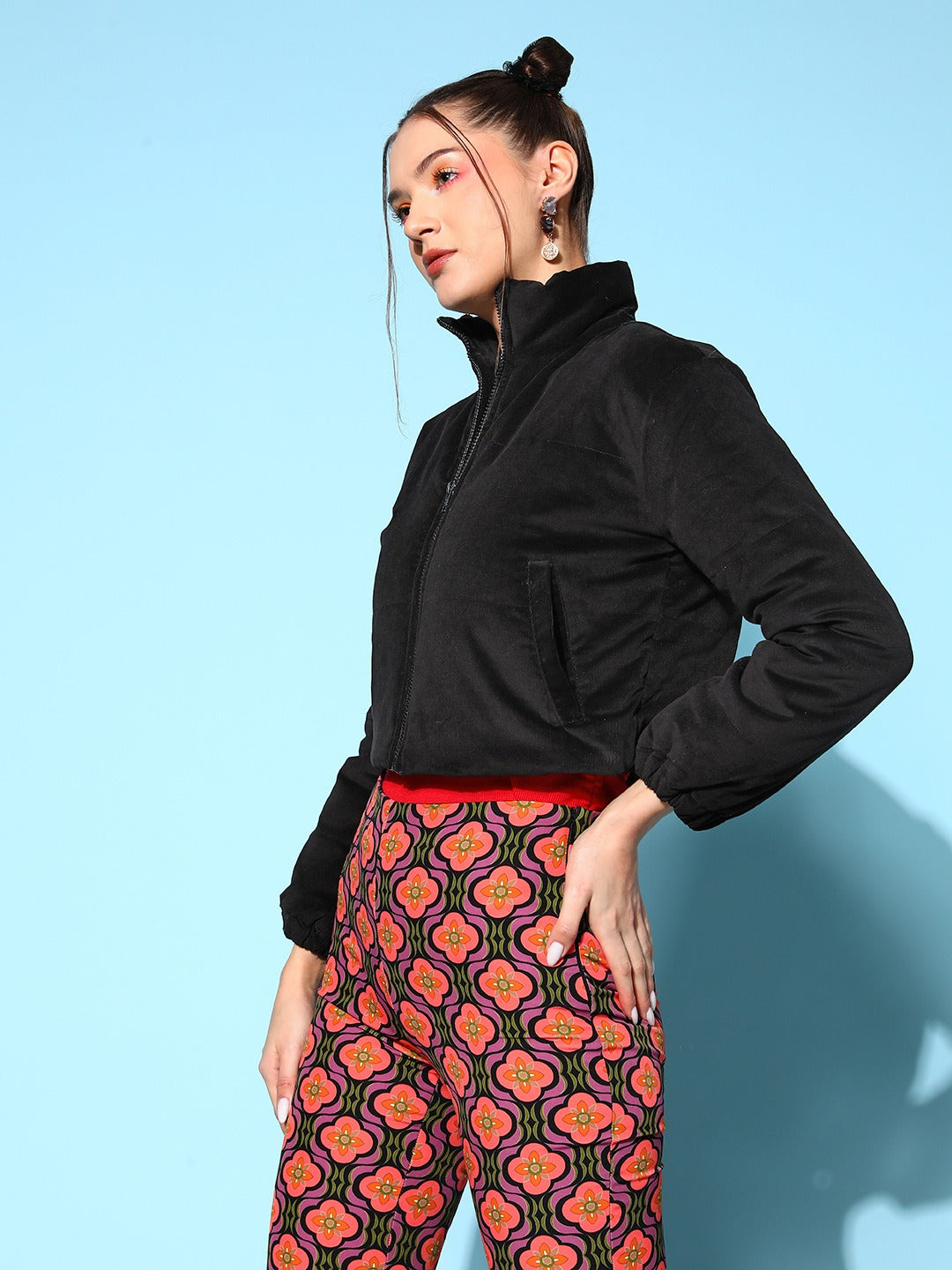 Berrylush Women Solid Black Stand Collar Neck Zipper-Up Cotton Straight Hem Tailored Regular Jacket