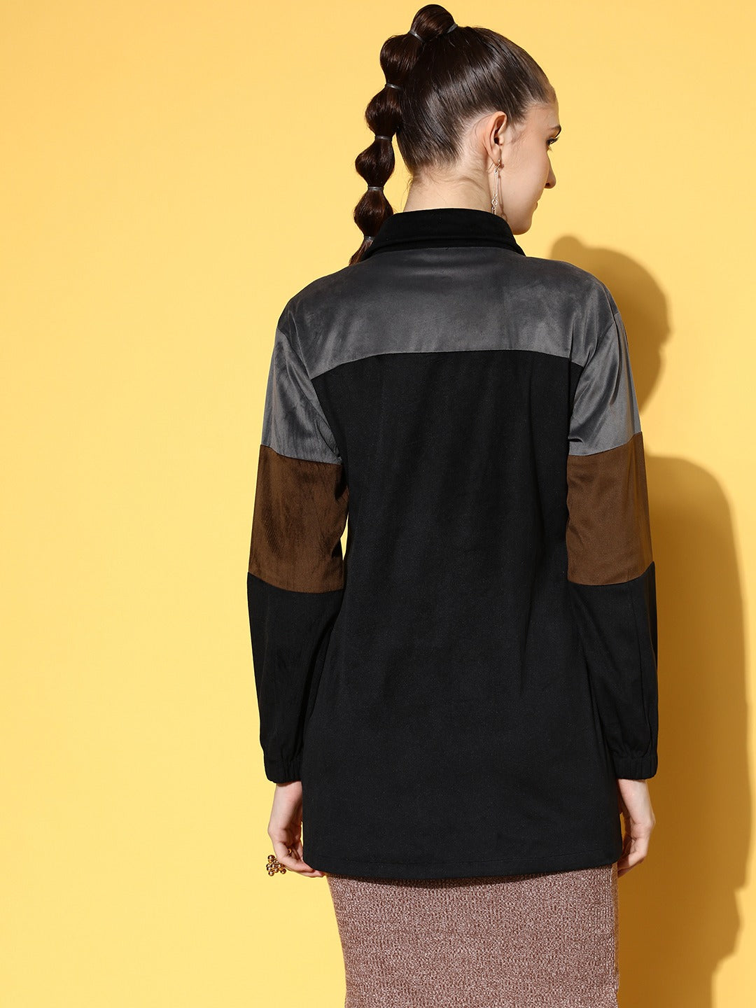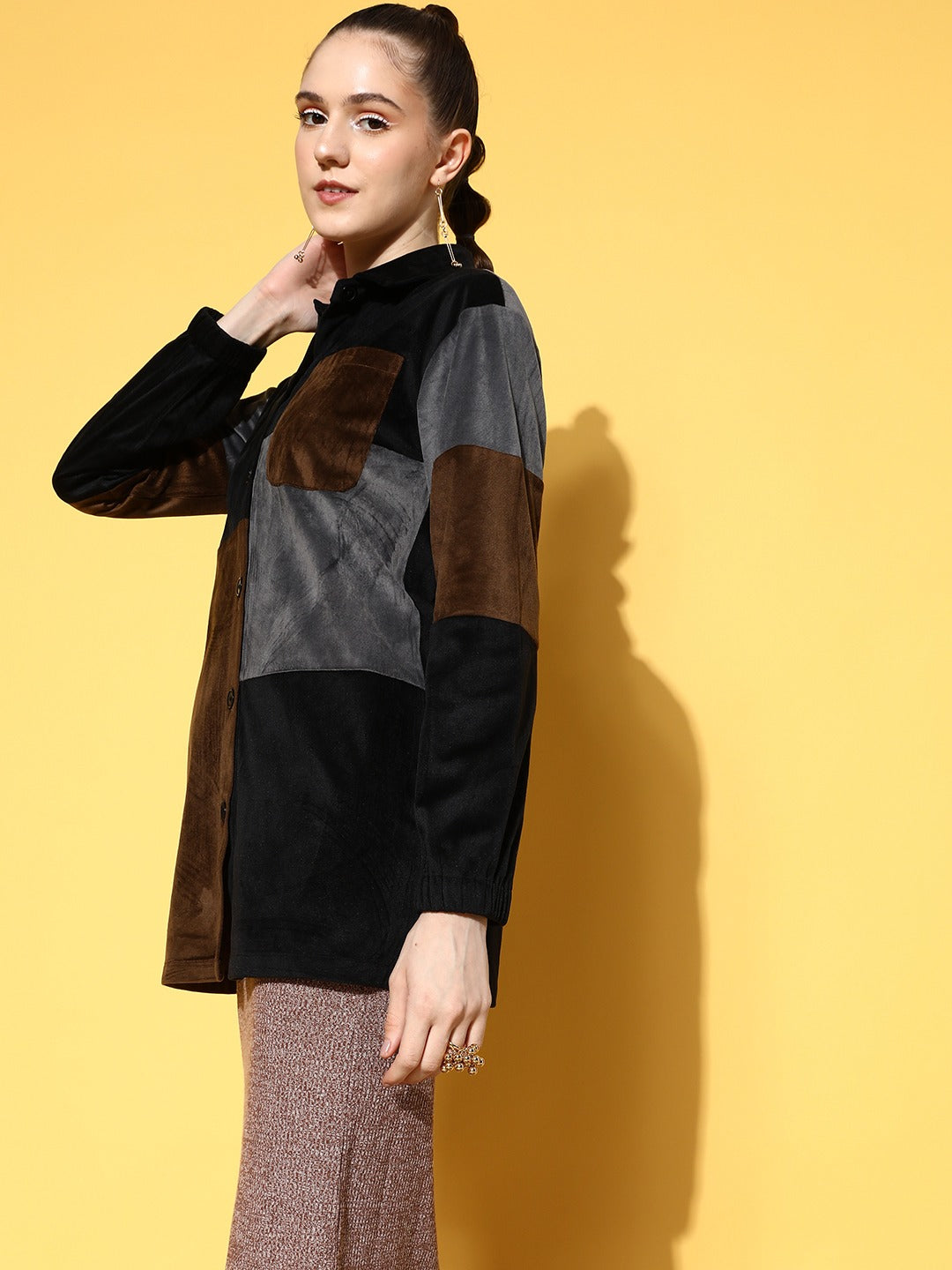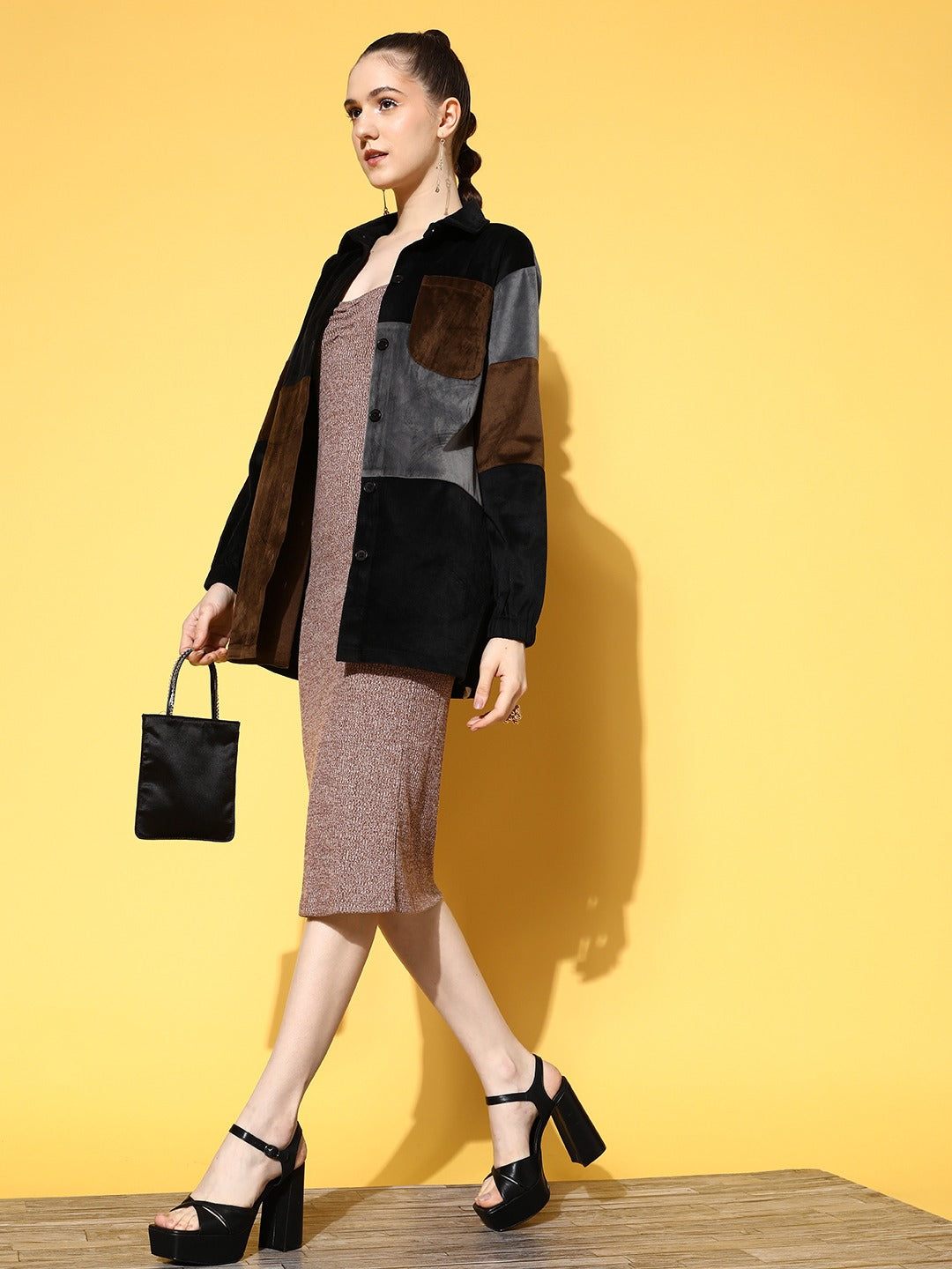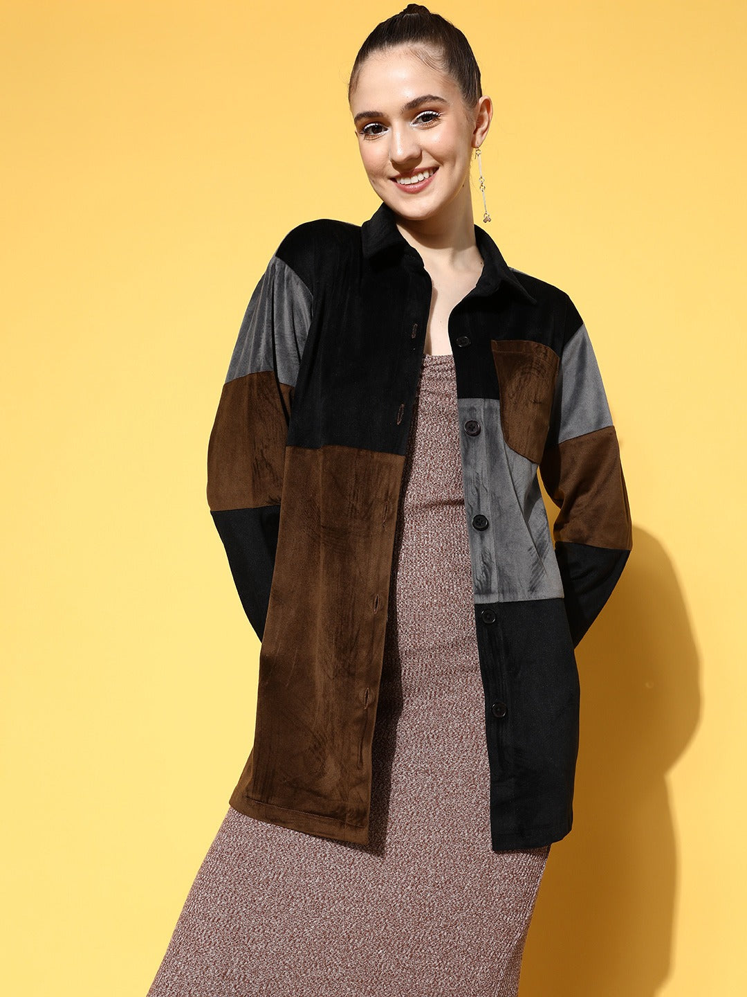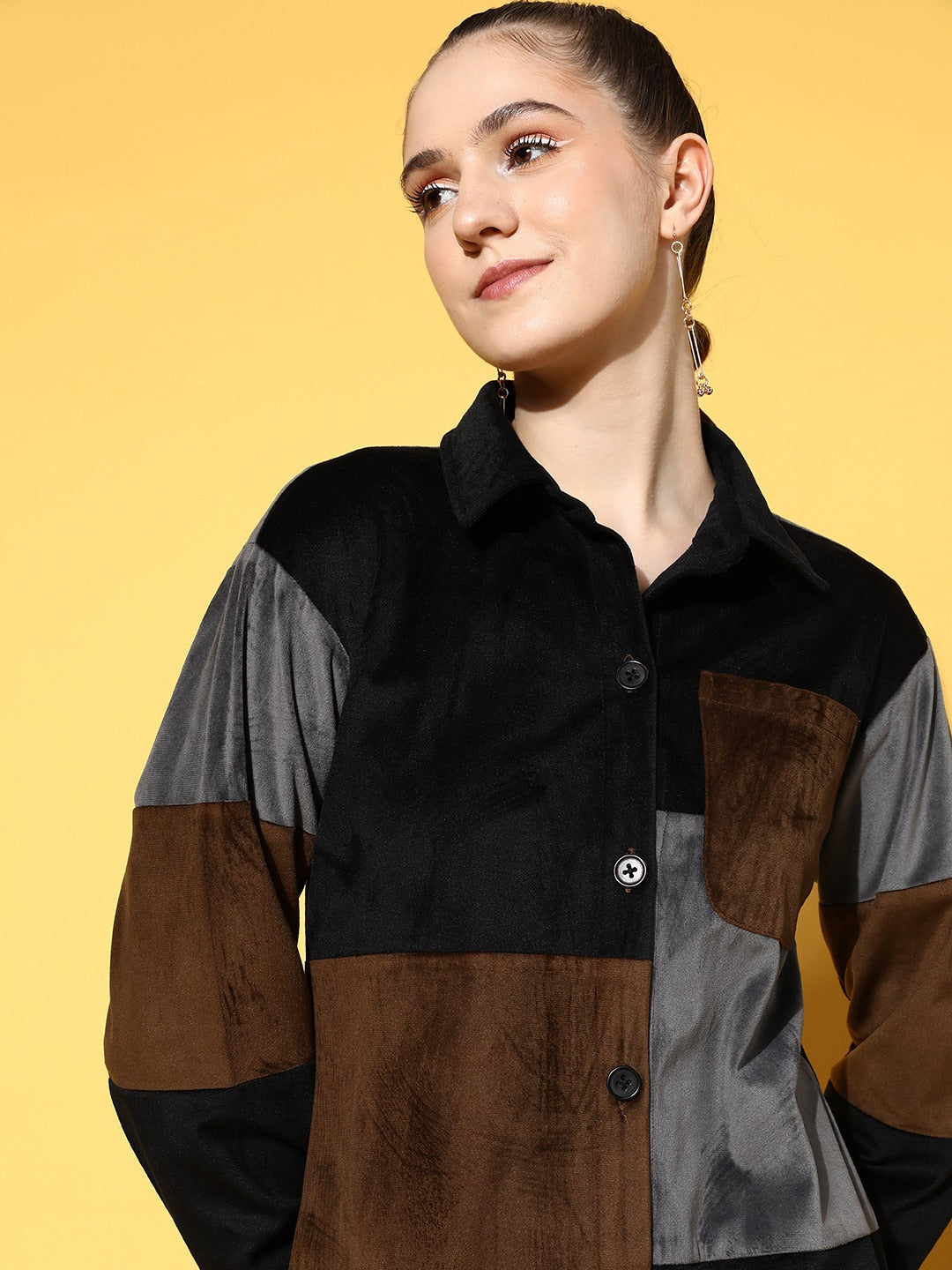 Berrylush Women Brown, Grey, & Black Colourblock Printed Spread Collar Neck Button Front Jacket