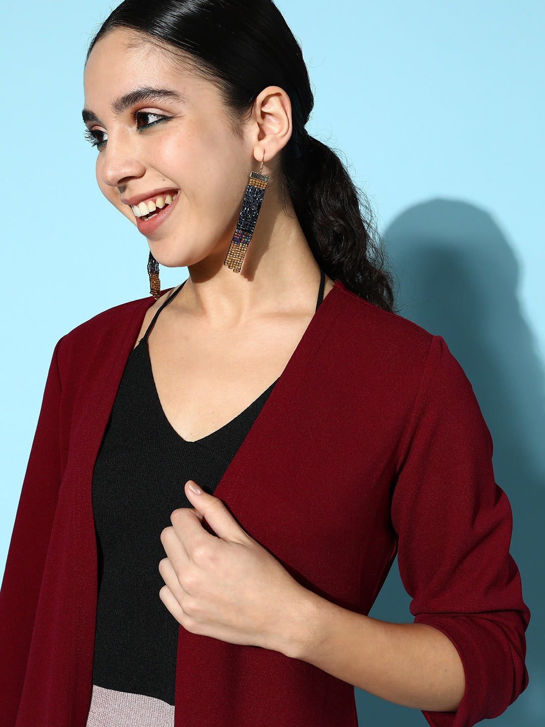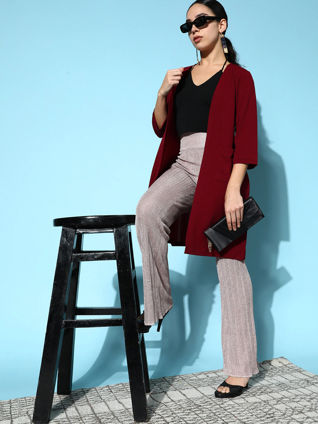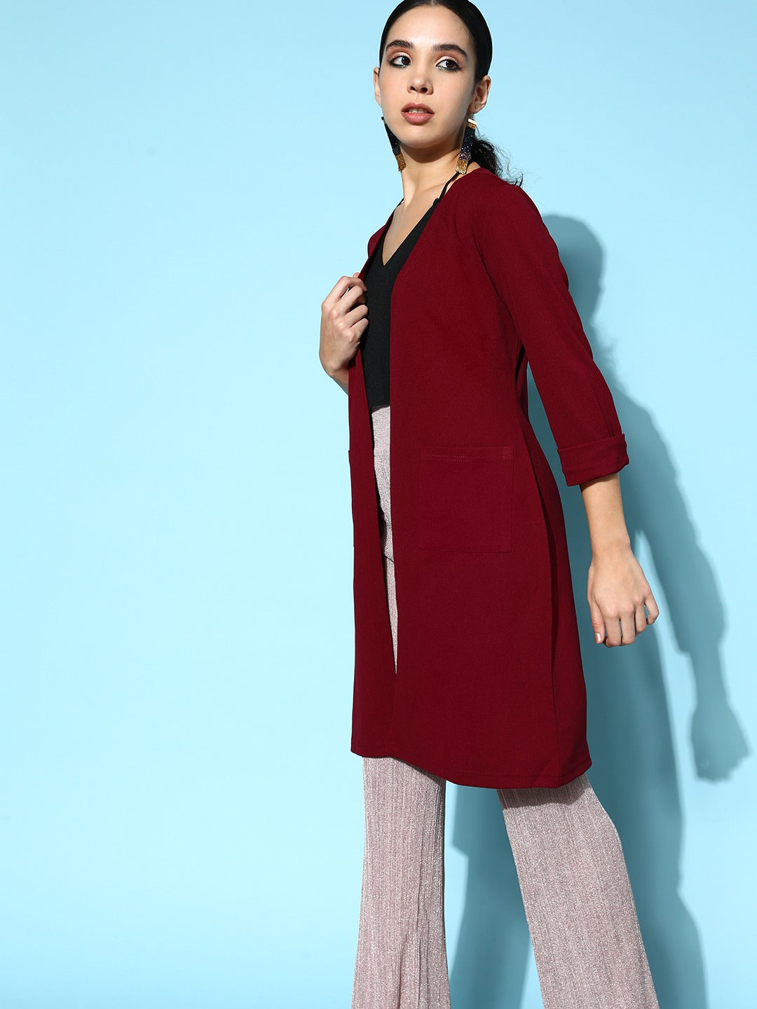 Berrylush Women Solid Maroon Collarless Neck Open-Front Straight Hem Longline Jacket
