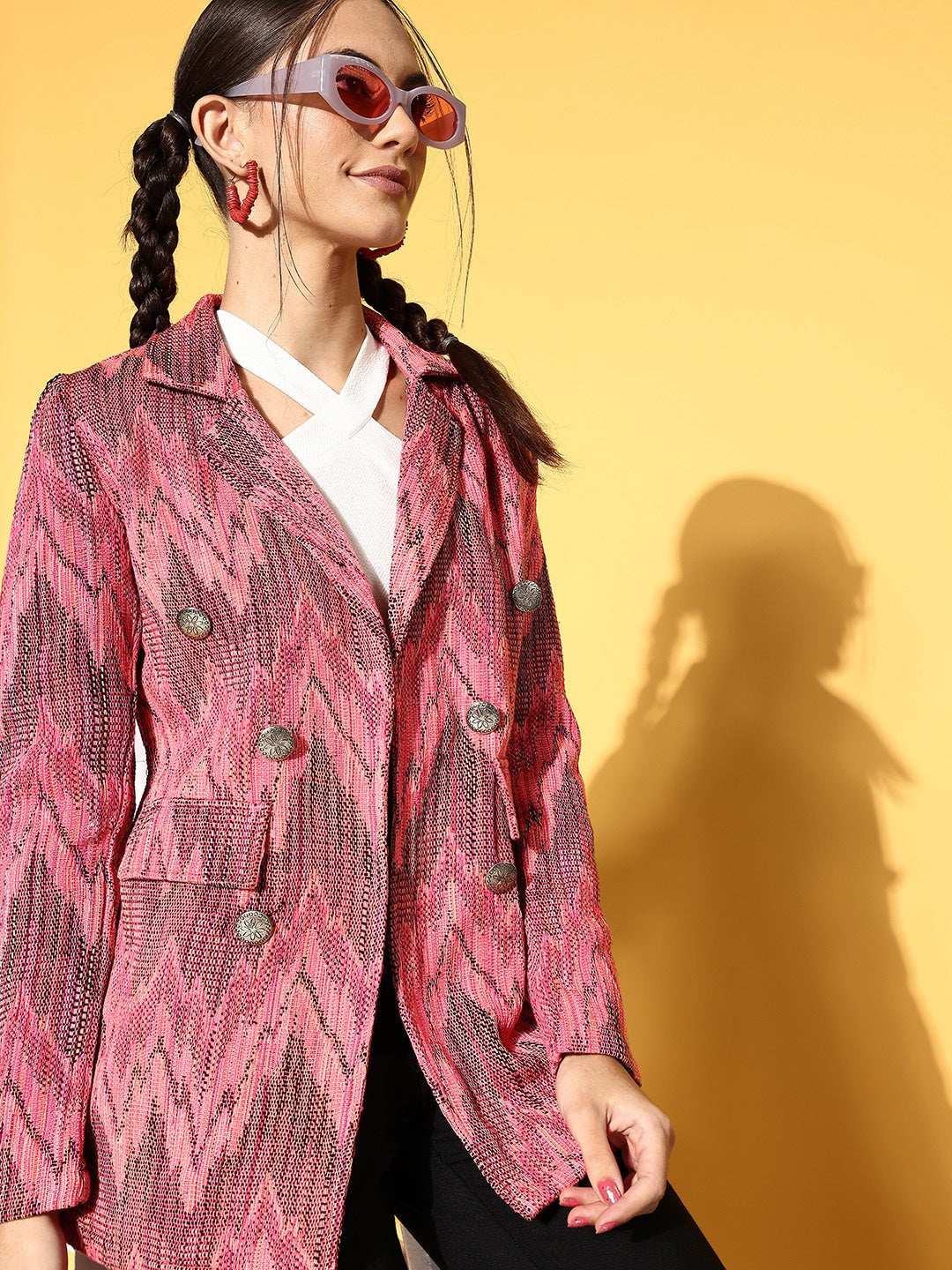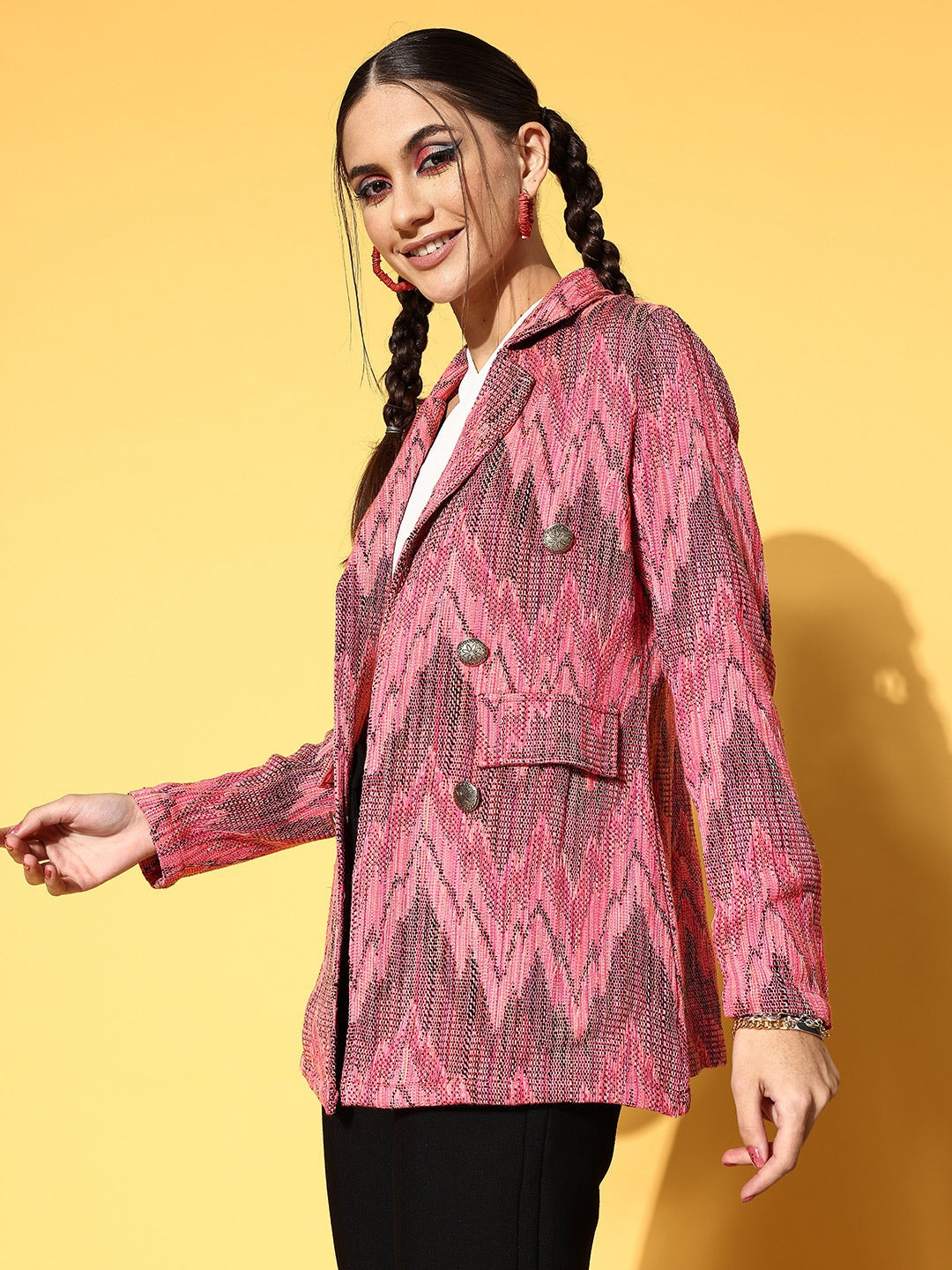 - Pink shade with a chevron pattern lends this jacket a boho-chic look with the royal vibe