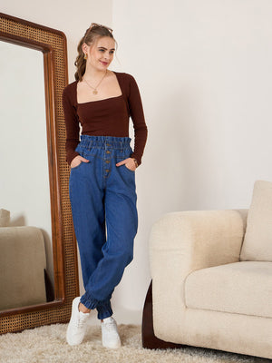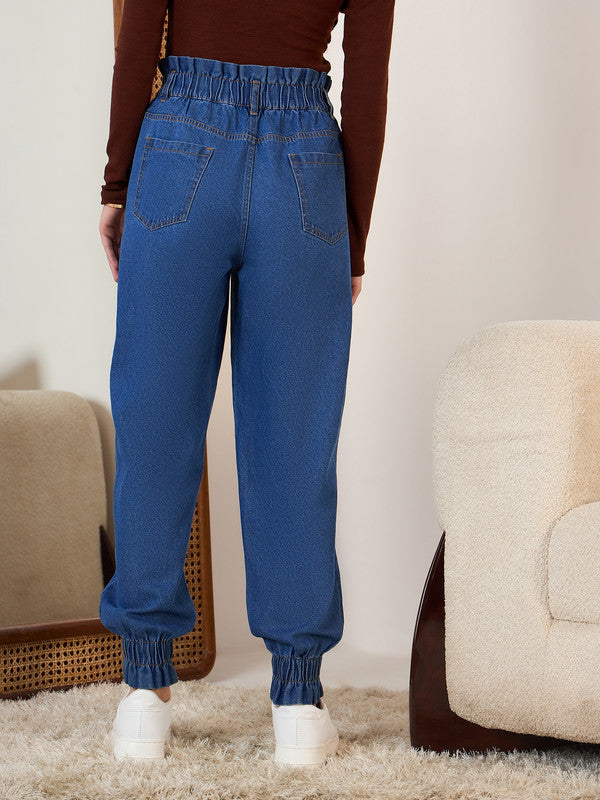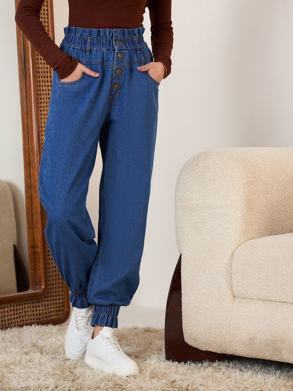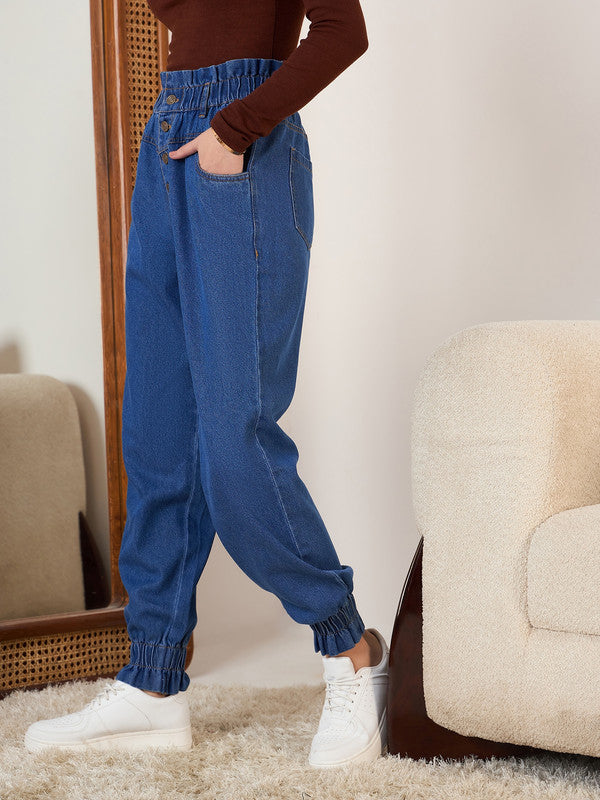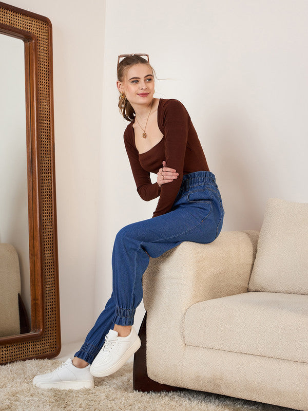Berrylush Women Solid Blue High-Rise Elastic Waist Four-Pocket Cotton Slip-On Knitted Regular Joggers