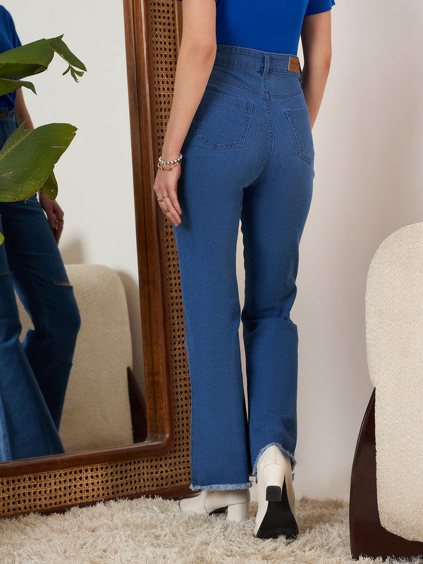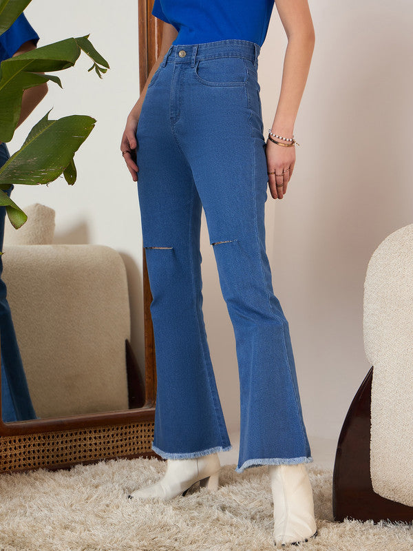 Berrylush Women Solid Blue High-Rise Waist Four-Pocket Cotton Distressed Regular Bootcut Jeans