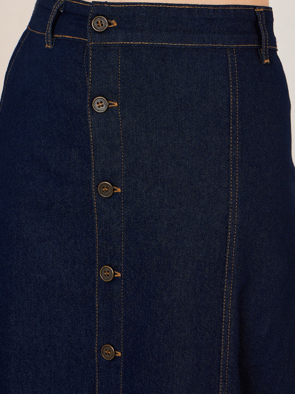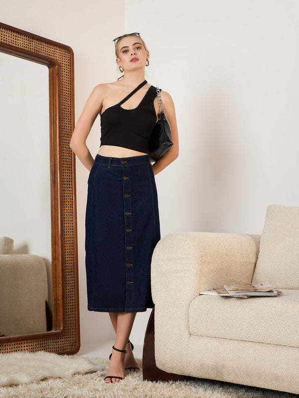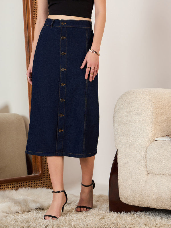 Berrylush Women Solid Navy Blue High-Rise Waist Denim Button-Front Straight Hem Knitted Midi Skirt
