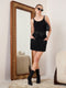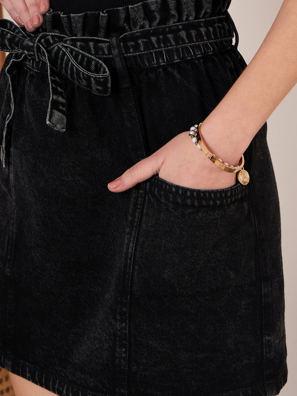 Berrylush Women Solid Black High-Rise Waist Tie-Up Denim Two-Pocket Straight Hem Knitted A-Line Mini Skirt