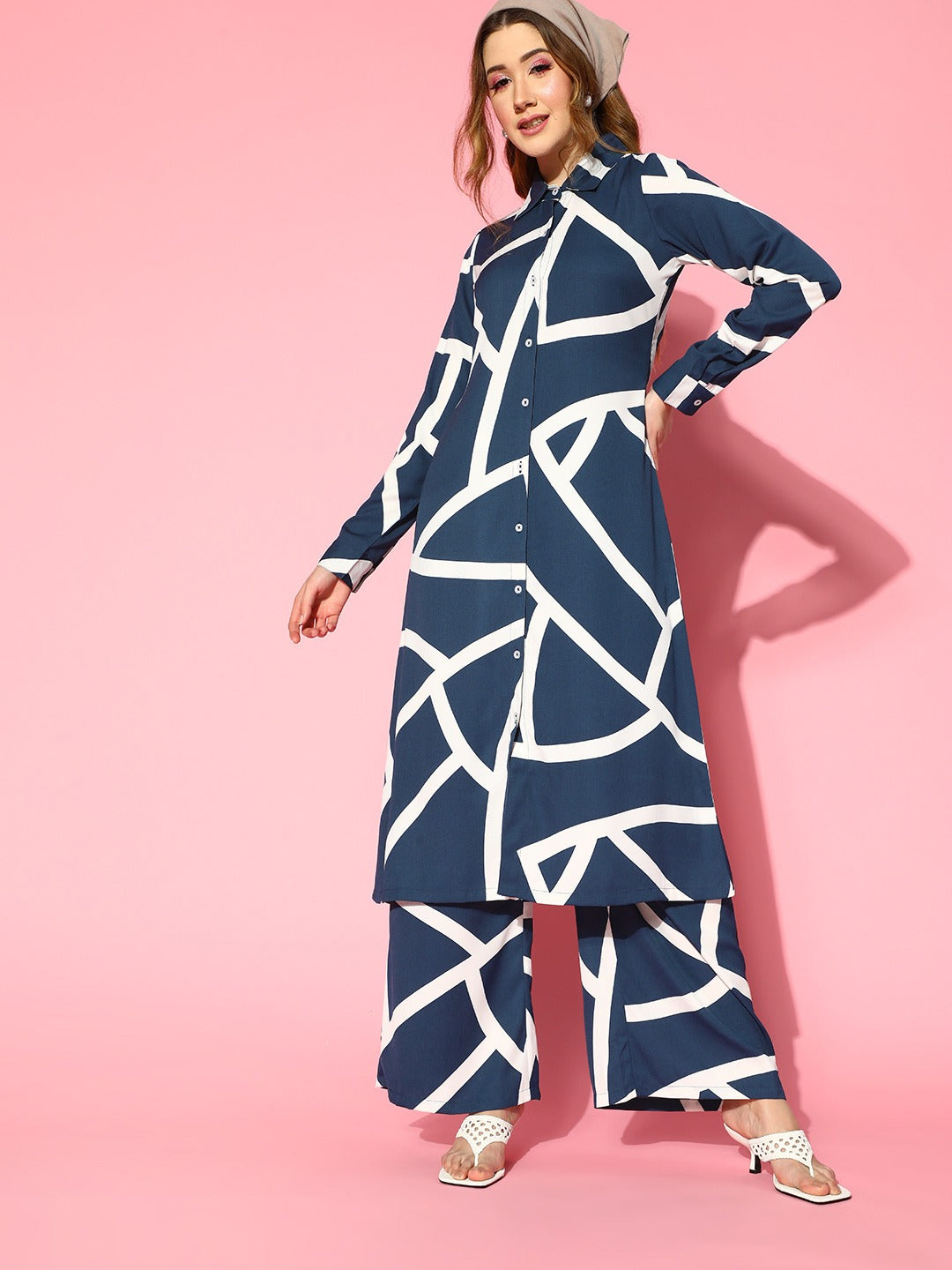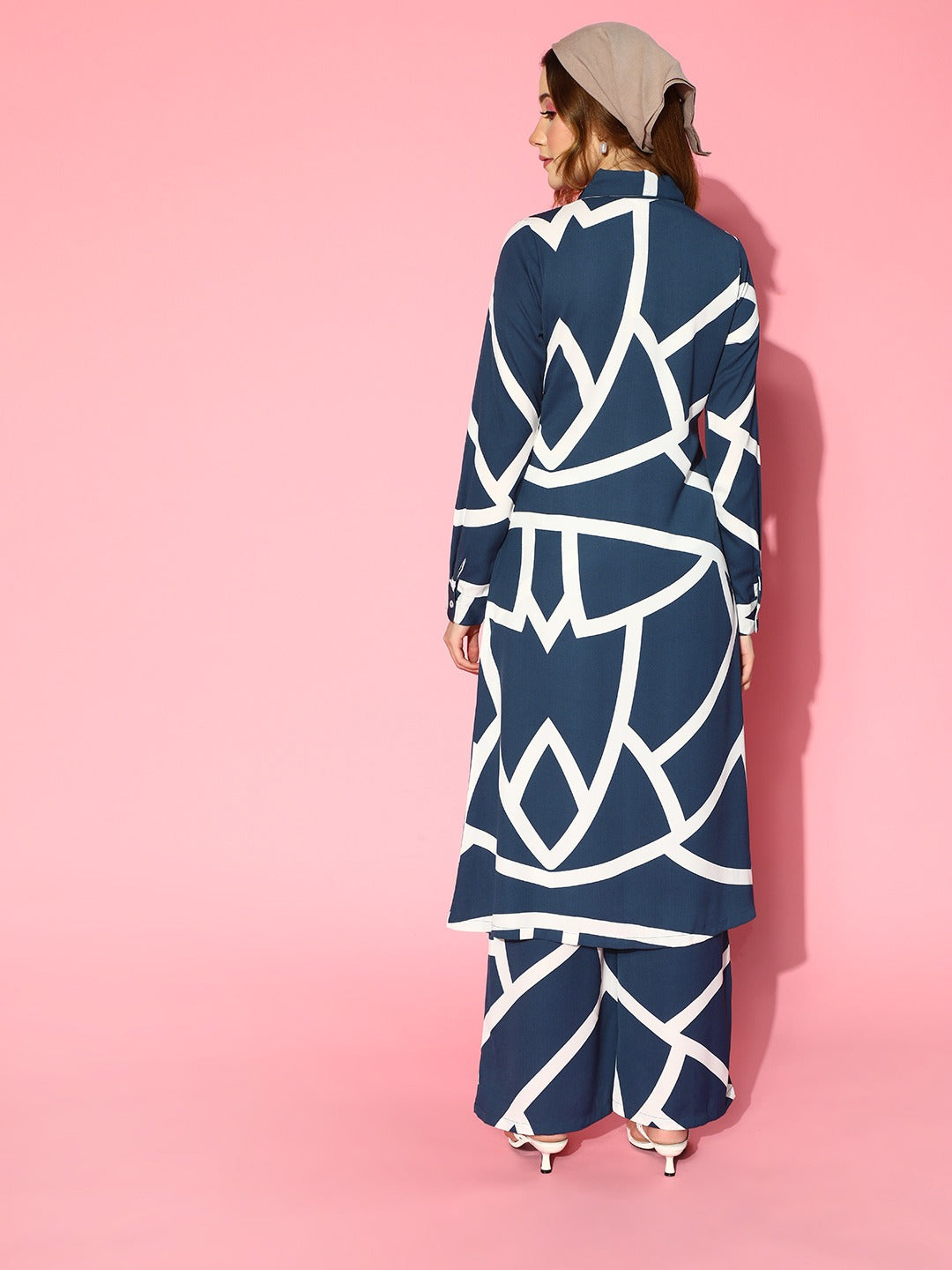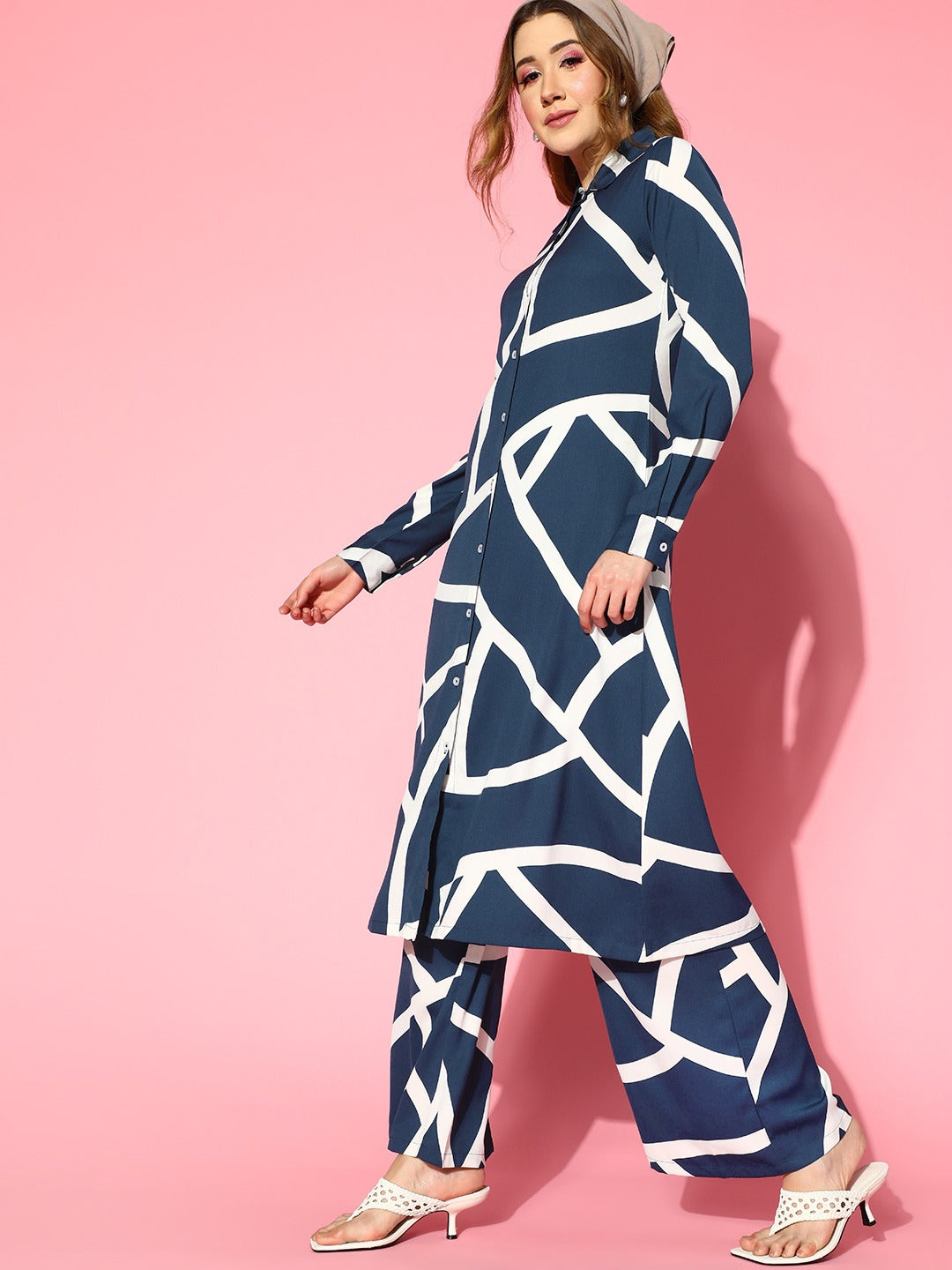 Berrylush Women Navy Blue & White Geometric Printed Shirt Collar Neck Longline Shirt & Trousers Co-Ordinate Set