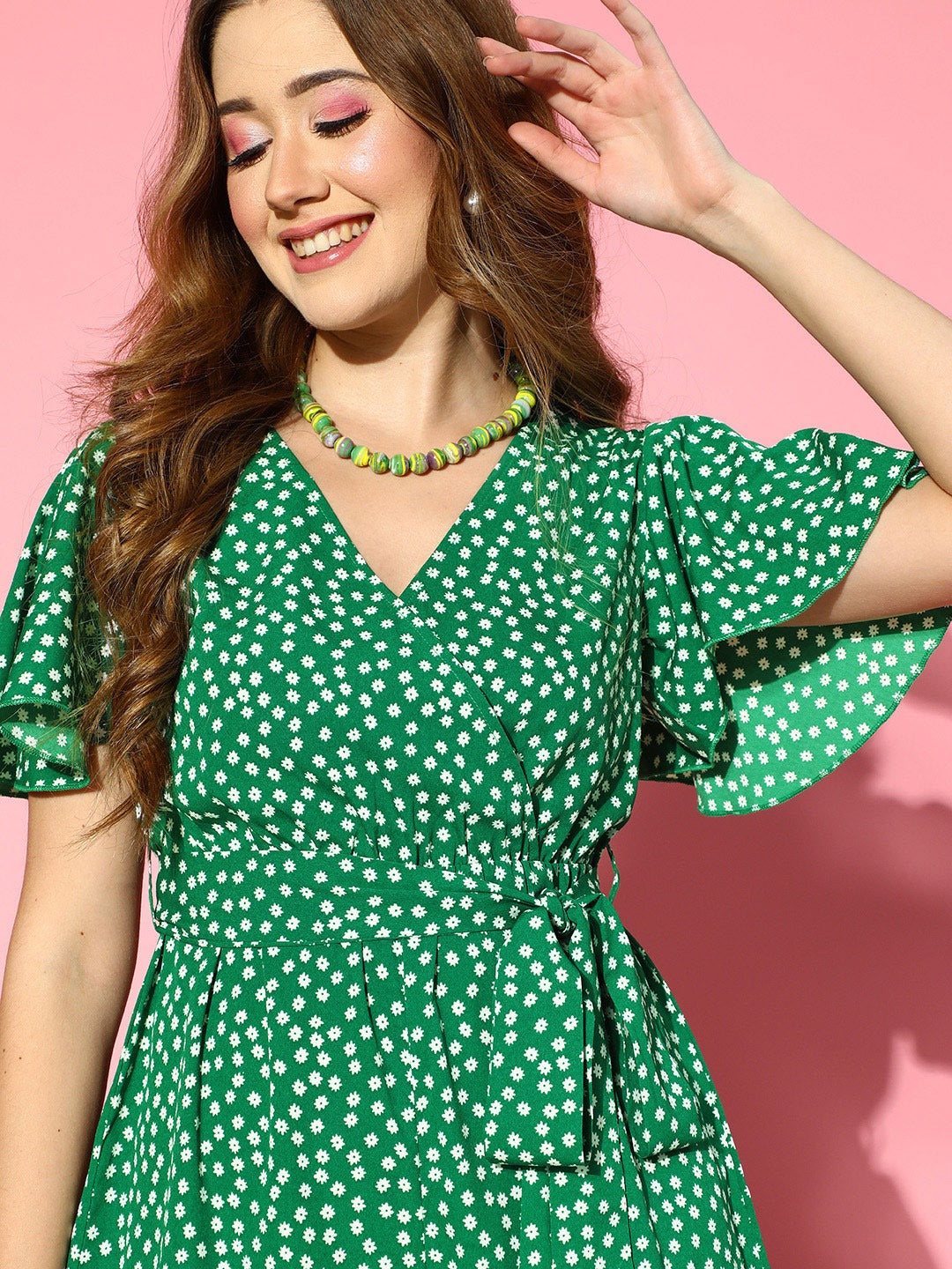 Berrylush Women Green & White Floral Printed V-Neck Waist Tie-Up Wrap Mini Playsuit