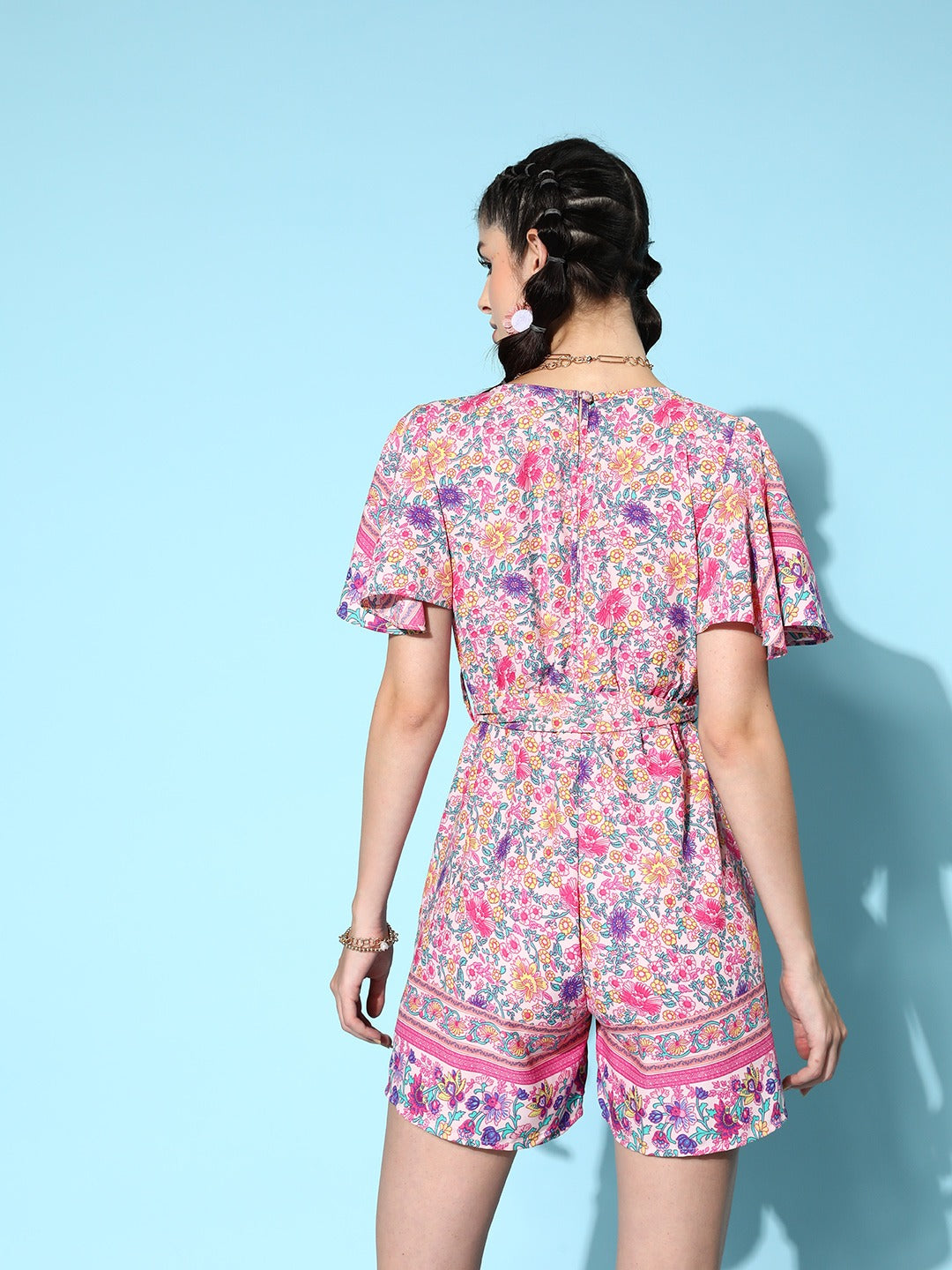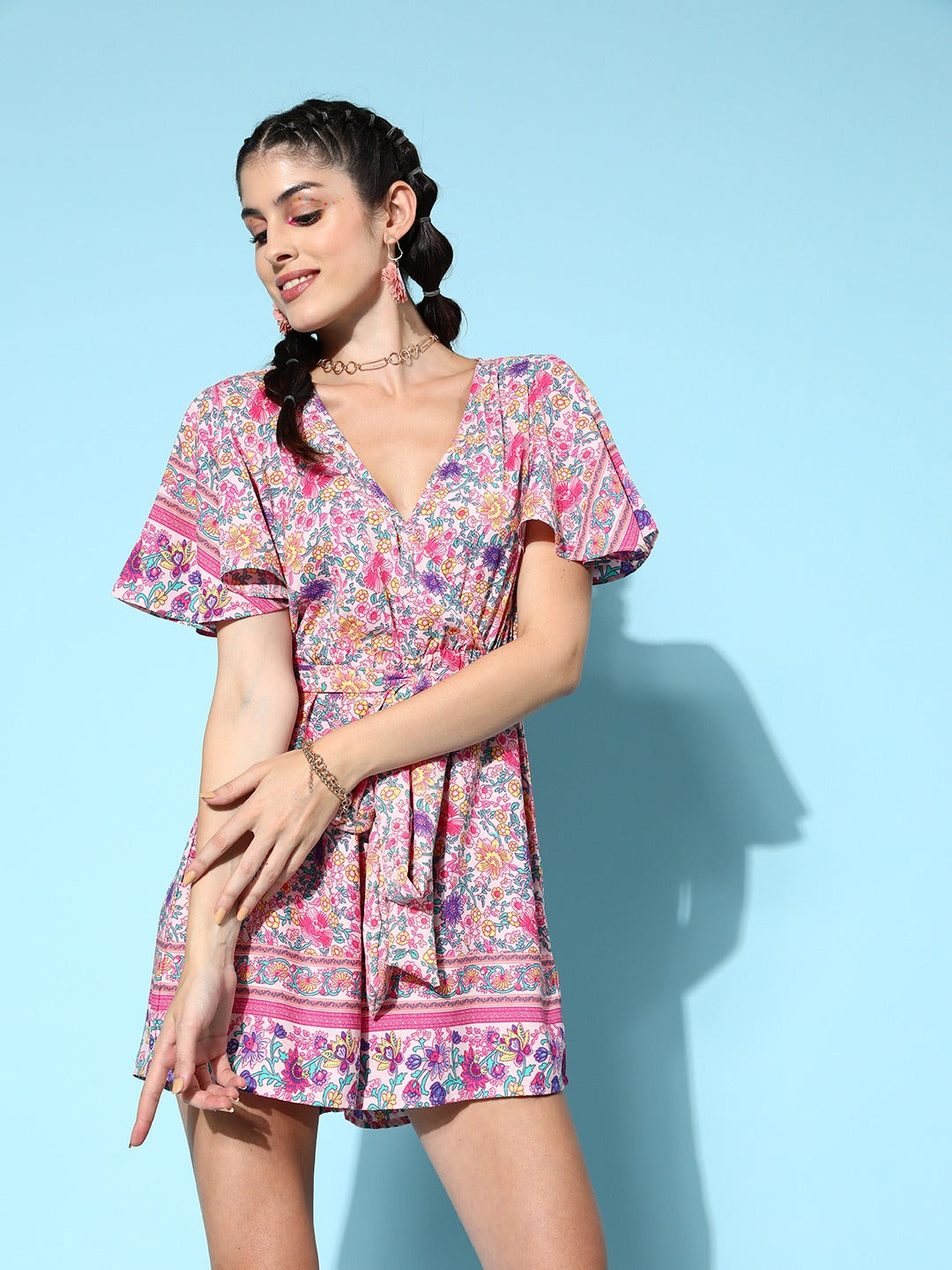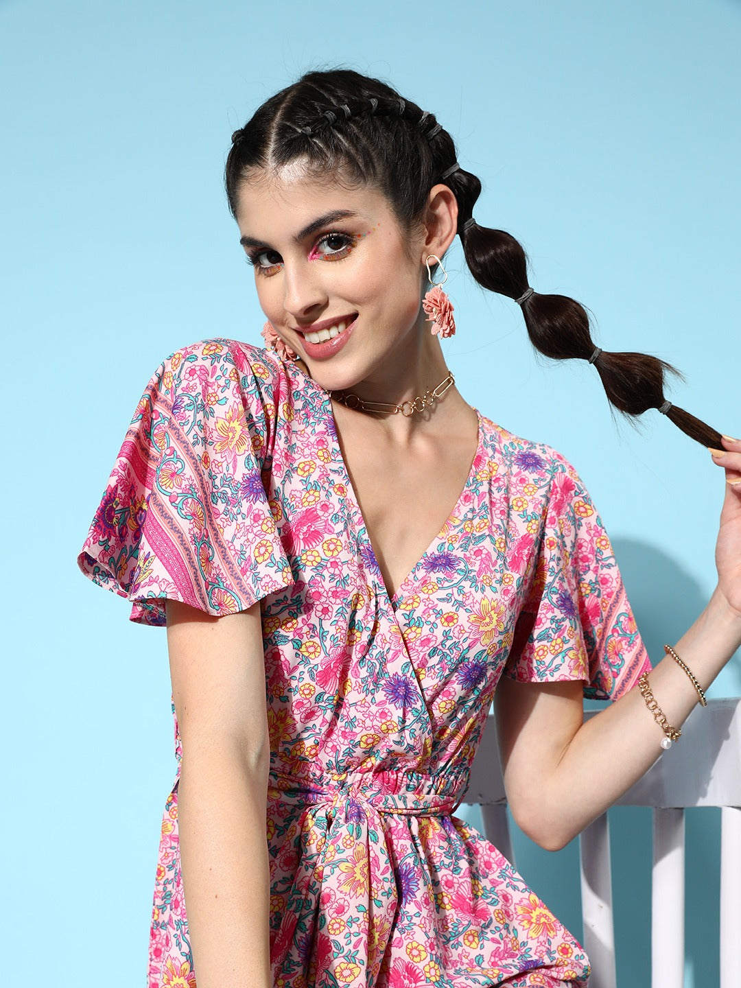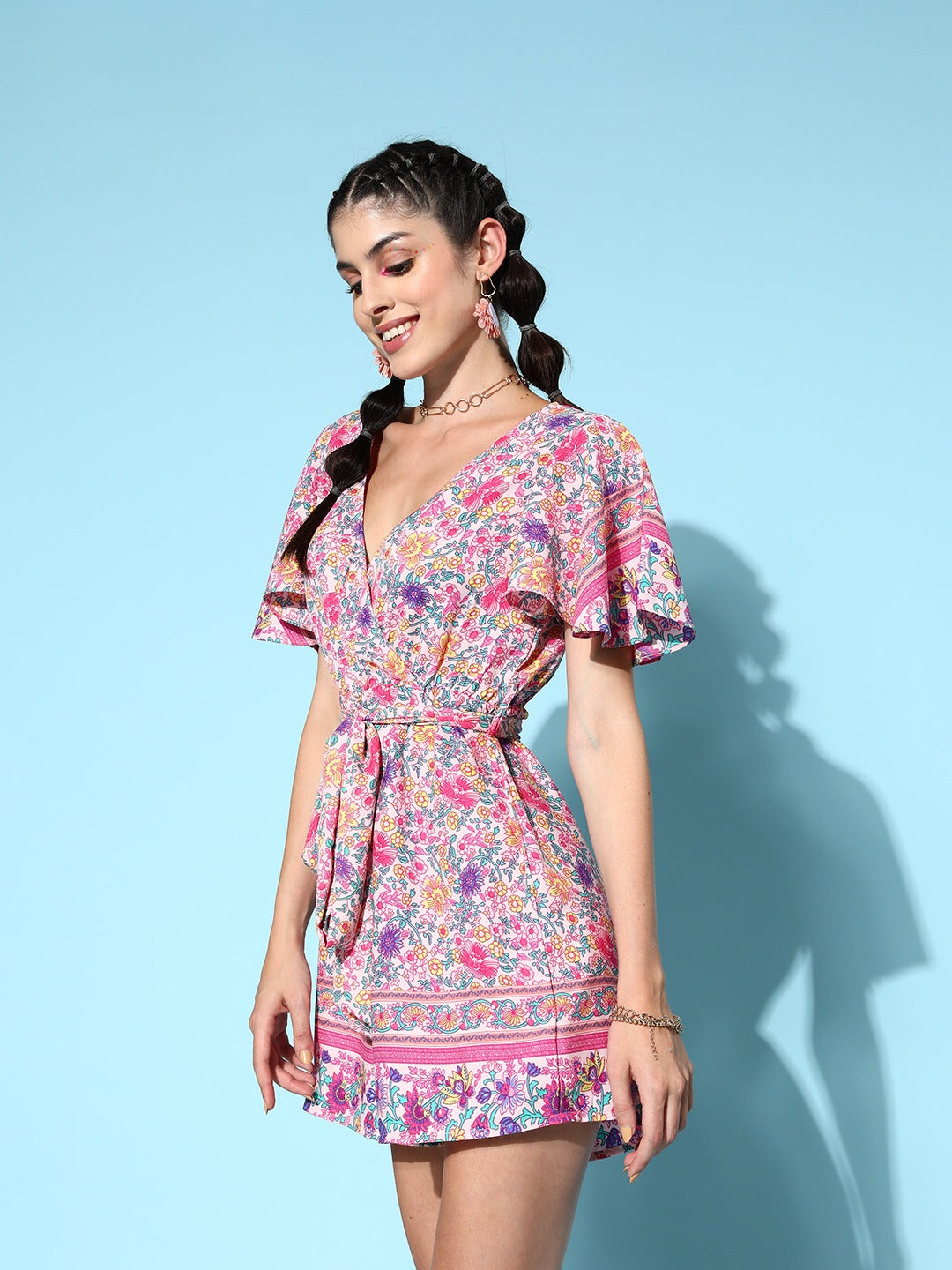 Berrylush Women Pink & Purple Floral Printed V-Neck Flutter Sleeves Waist Tie-Up Wrap Mini Playsuit