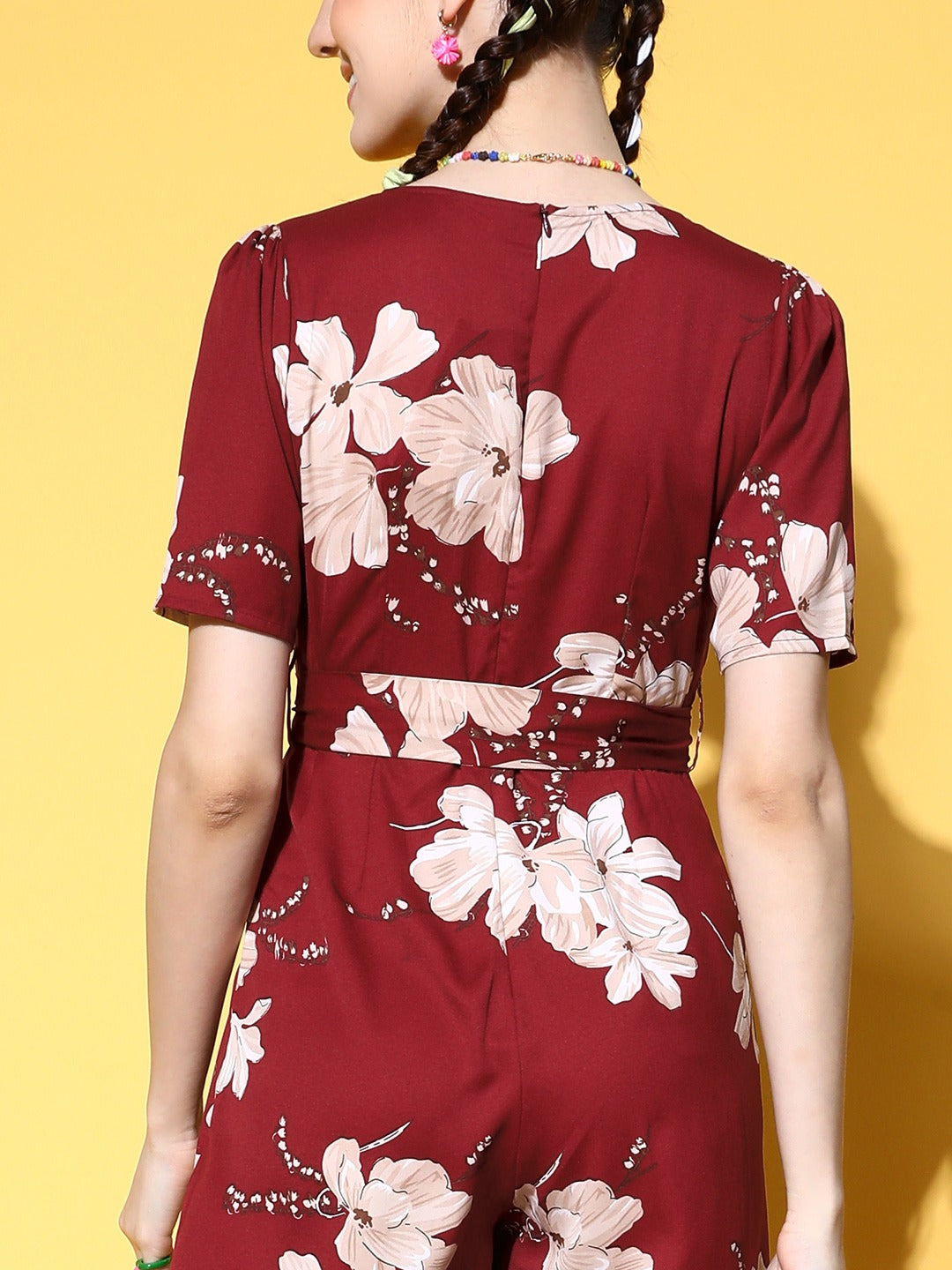 Berrylush Women Maroon & White Floral Printed V-Neck Waist Tie-Up Polyester Basic Jumpsuit