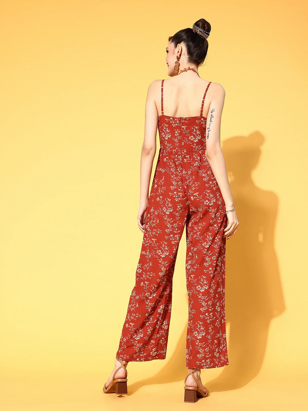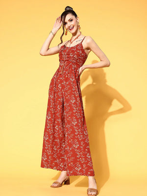 Berrylush Women Red & Off-White Floral Printed Round Neck Sleeveless Gathered Jumpsuit