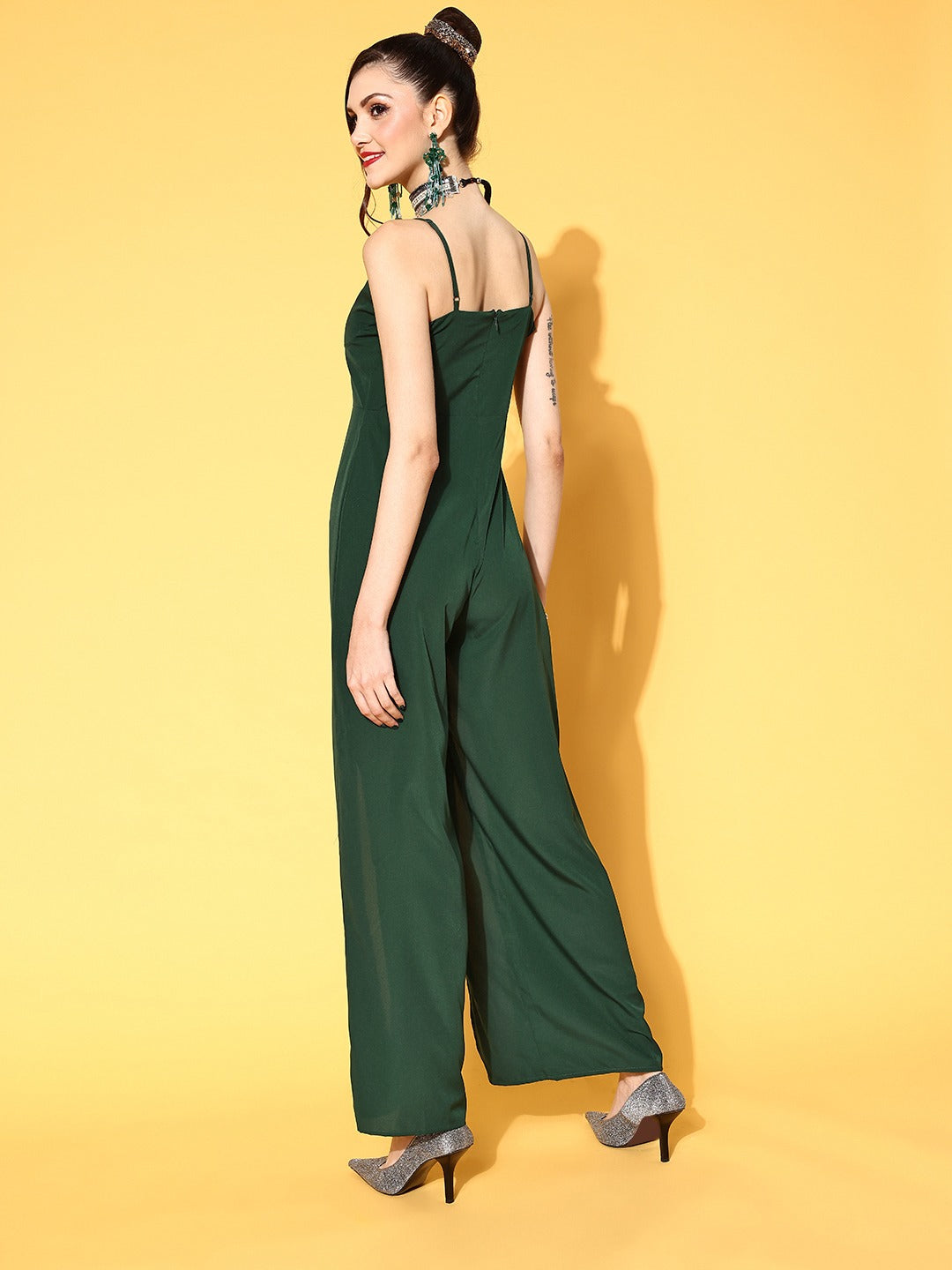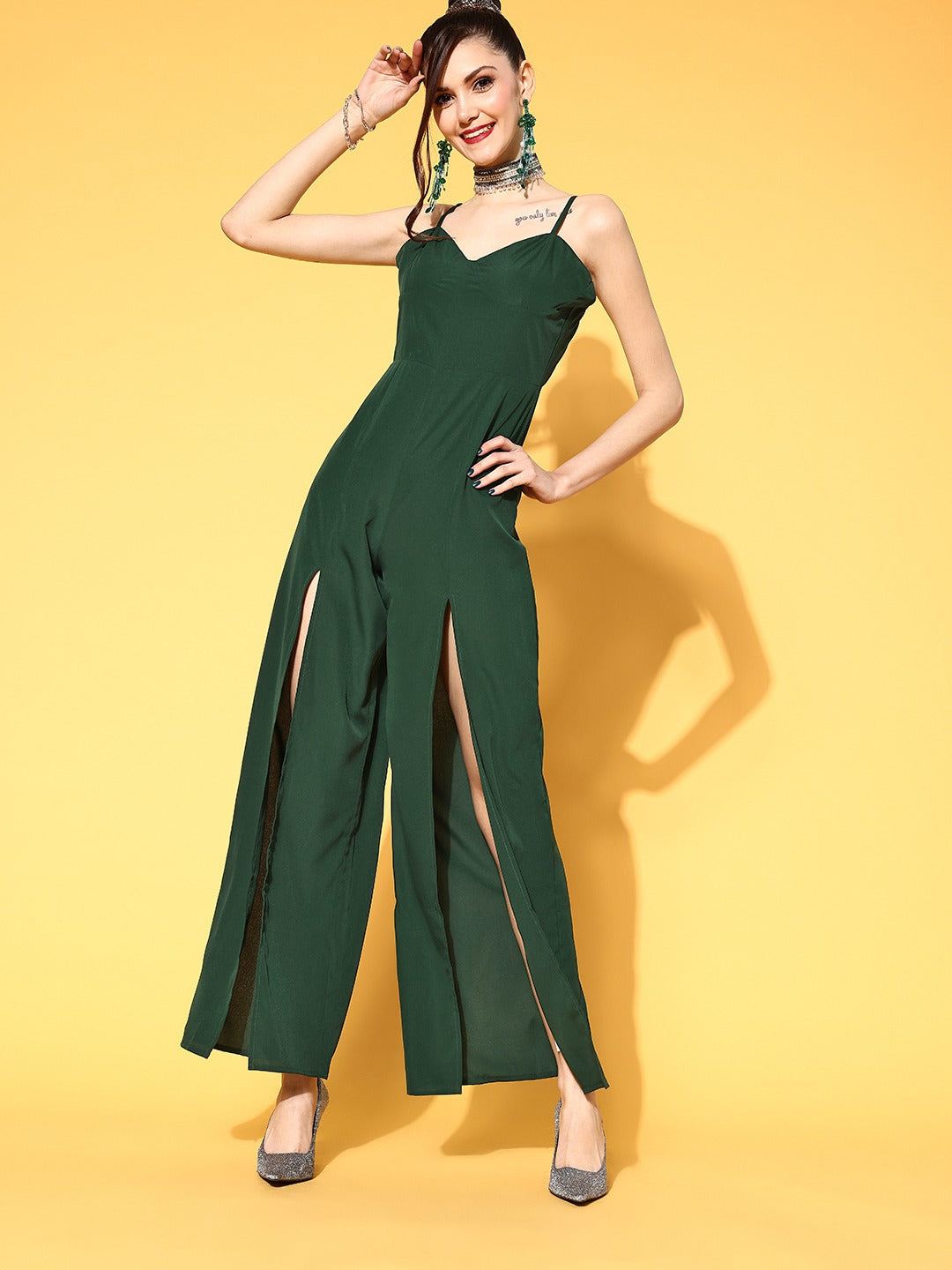 Amplify your party repertoire with the inclusion of distinguished style by selecting this glamourous Solid Green Sweetheart Neck Double-High Slit Culotte Jumpsuit introduced by Berrylush. Designed with a front slit culotte to add an eccentric essence to this jumpsuit for modern appeal. Flaunting a sleeveless feature of this jumpsuit to give your arms an alluring look along with hassle-free movement. That's not all, the adjustable shoulder straps assemble the supportive element of this jumpsuit. Pair this gorgeous jumpsuit with a pair of block heels, minimalistic silver jewellery, and a stylish sling bag for a stunning look.