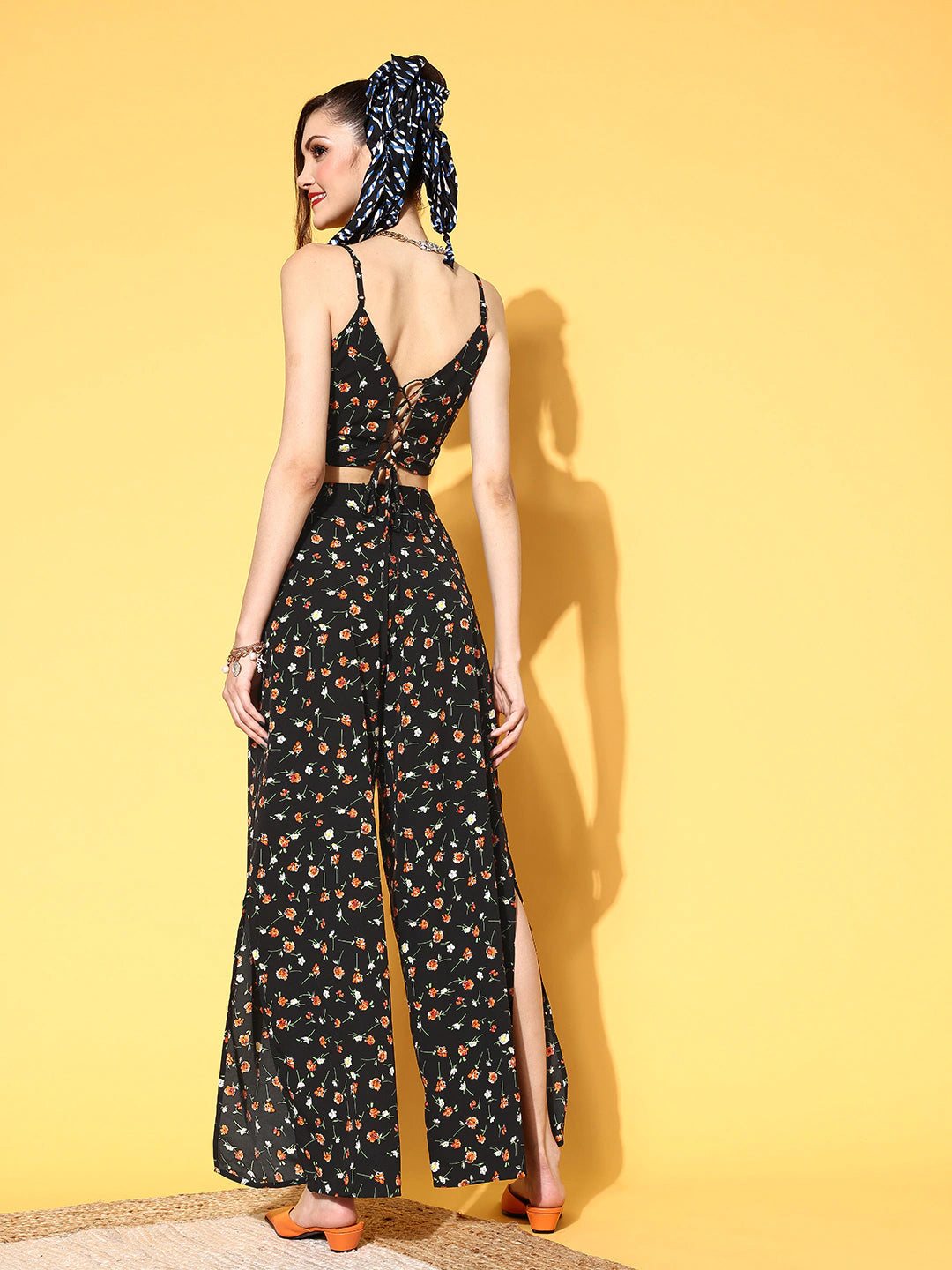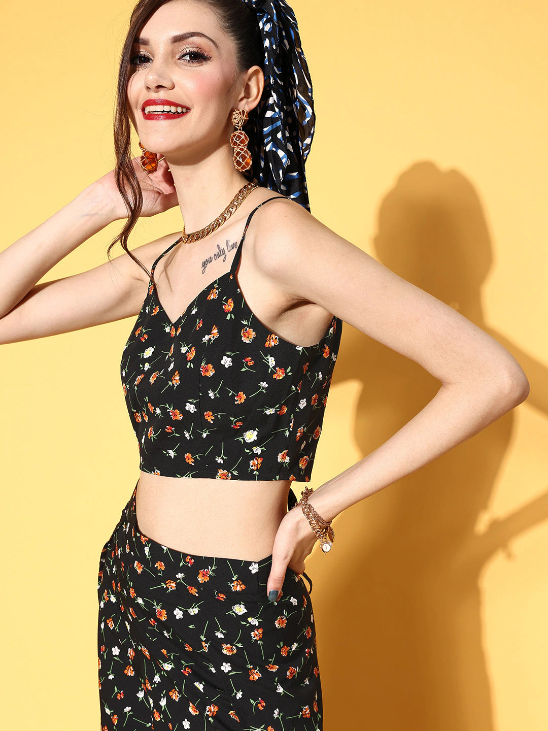 Berrylush Women Black & Orange Floral Printed V-Neck Crop Top & Side-Slit Trousers Co-Ord Set