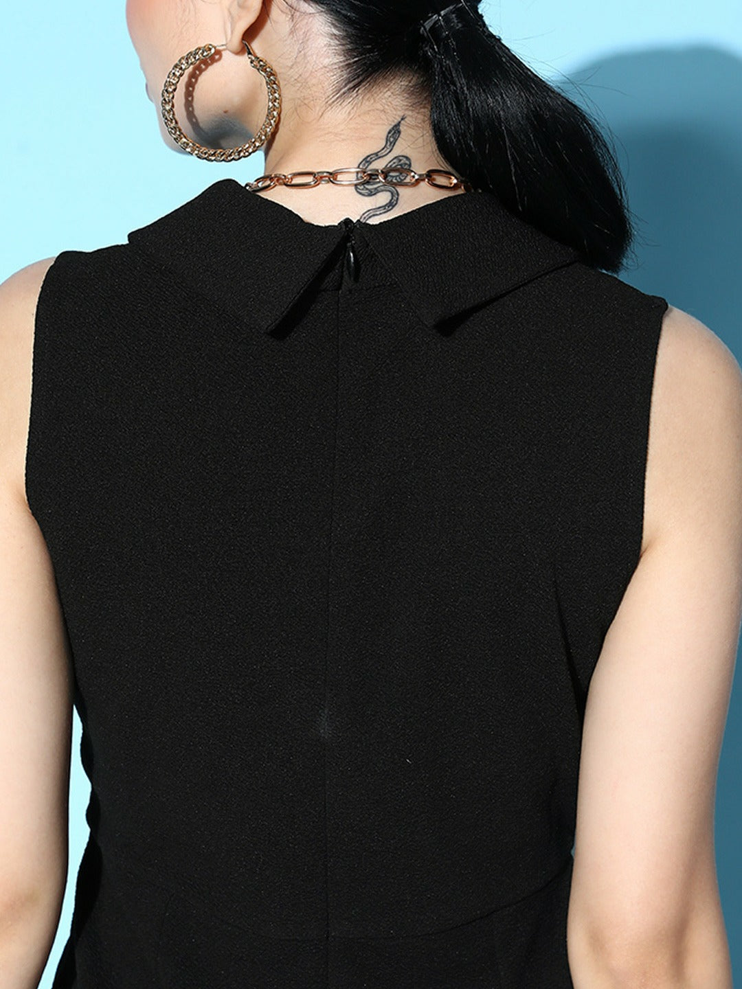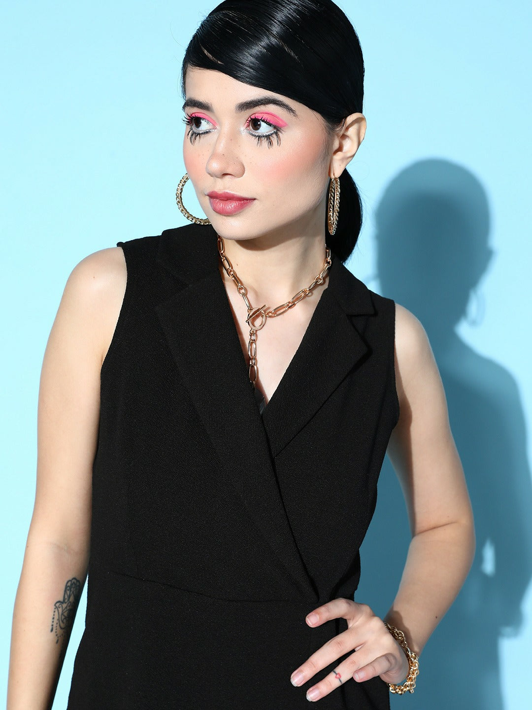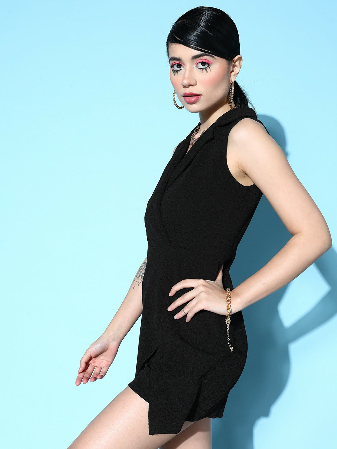Berrylush Women Solid Black Shawl Neck Sleeveless Wrap Mini Skort Romper