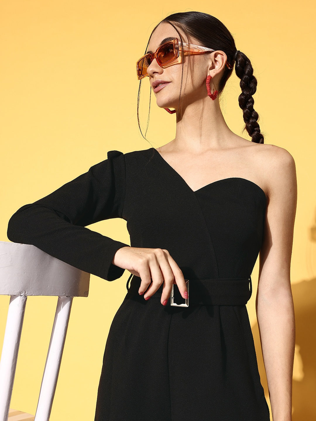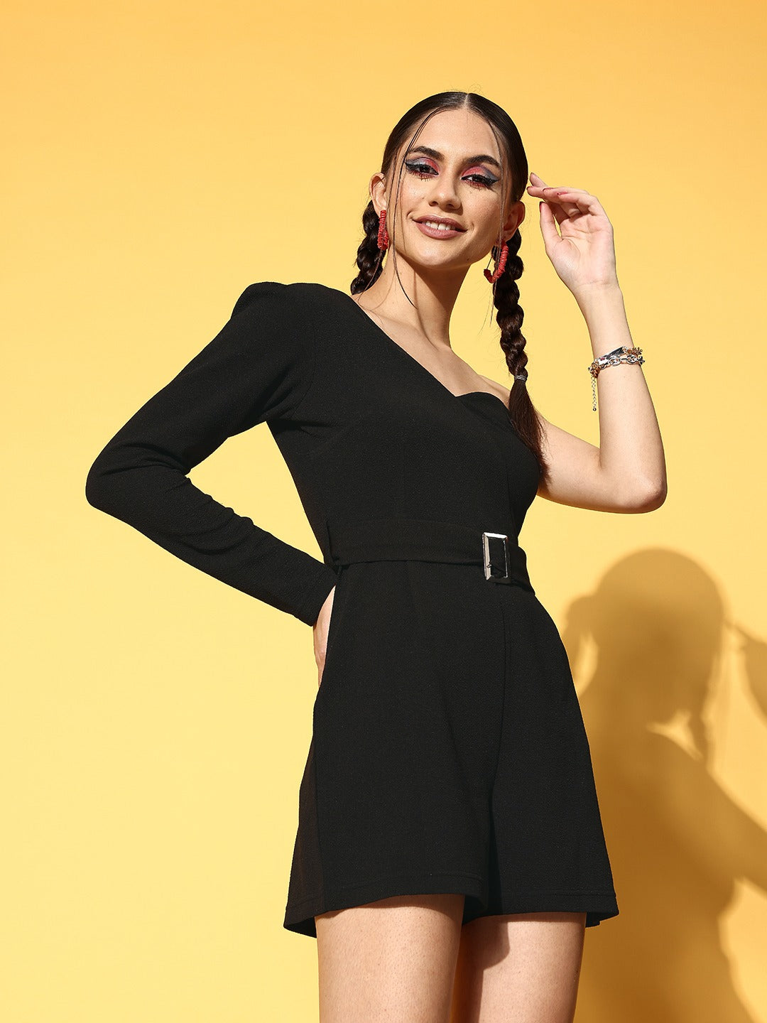 Bring out your bold and confident spirit with timeless statement pieces just like this stunning Solid Black One-Shoulder Belted Mini Jumpsuit designed by Berrylush. Showcasing a one-shoulder neck design that gives your neckline a fascinating asymmetric definition with an exotic feel. Rendered from high-quality polyester fabric that lends this jumpsuit uninterrupted breathability with total airflow and moisture-absorbing properties. In addition, the concealed zip closure put forward a functional design that offers this jumpsuit a secure fastening process with a refined sheen. Complete your party looks beautifully by wearing this jumpsuit with a pair of silver high-heels, minimalistic silver jewellery, and a chic clutch.