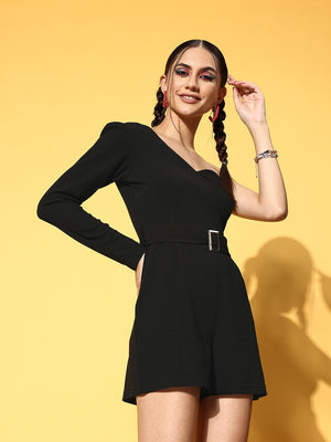 Berrylush Women Solid Black One-Shoulder Neck Long Sleeve Waist Belted Mini Jumpsuit