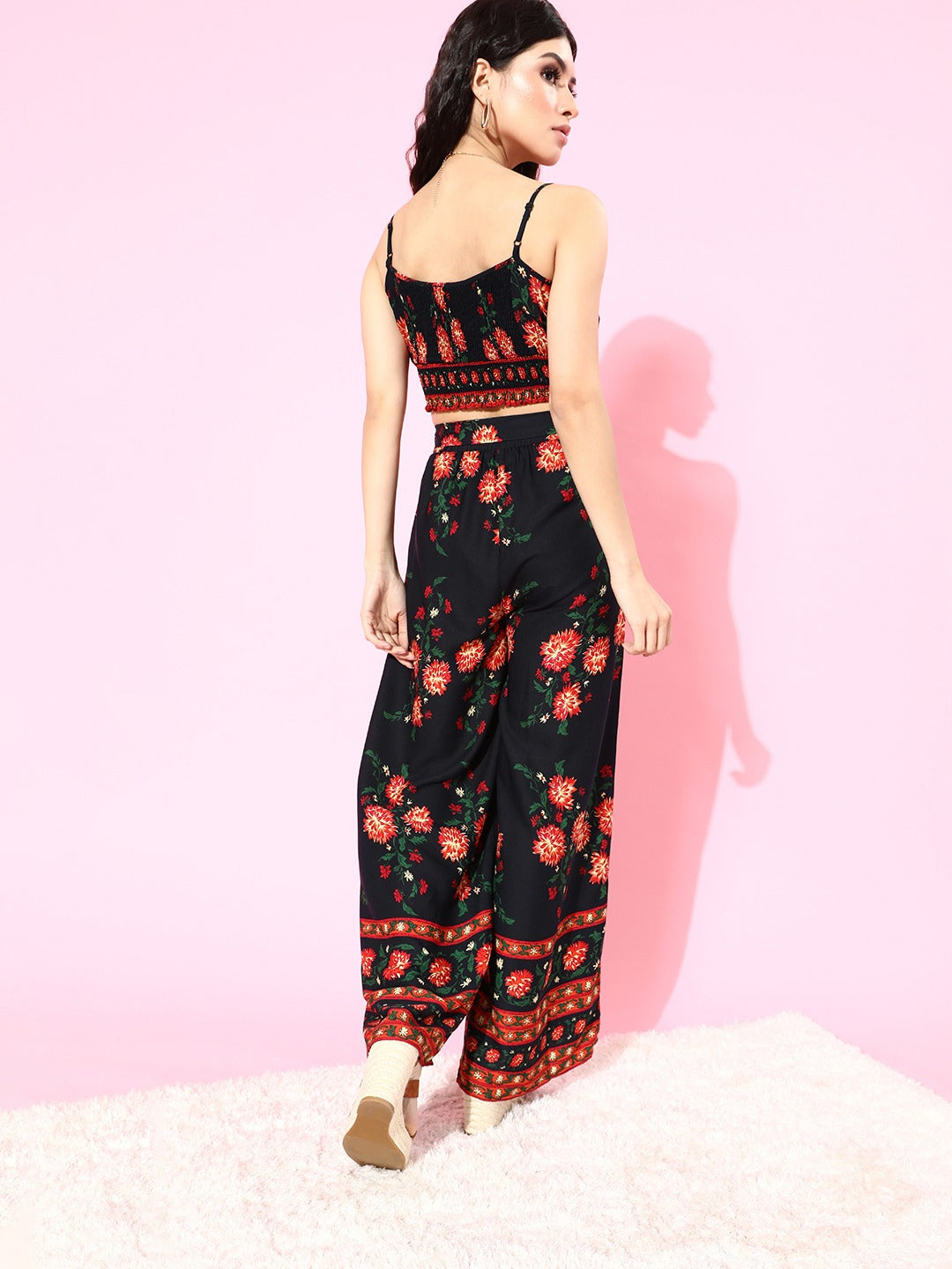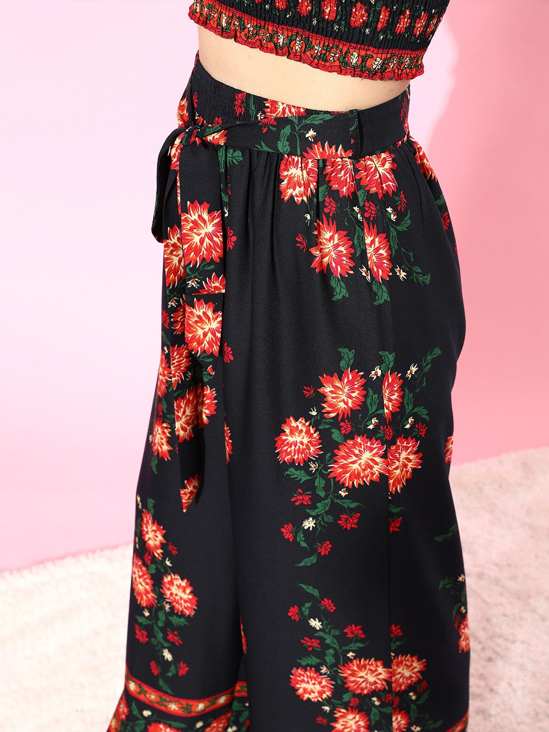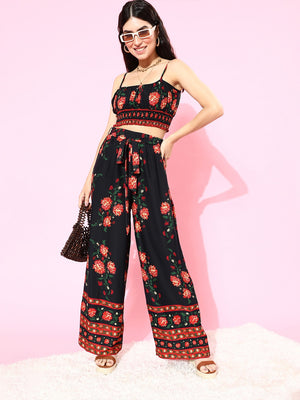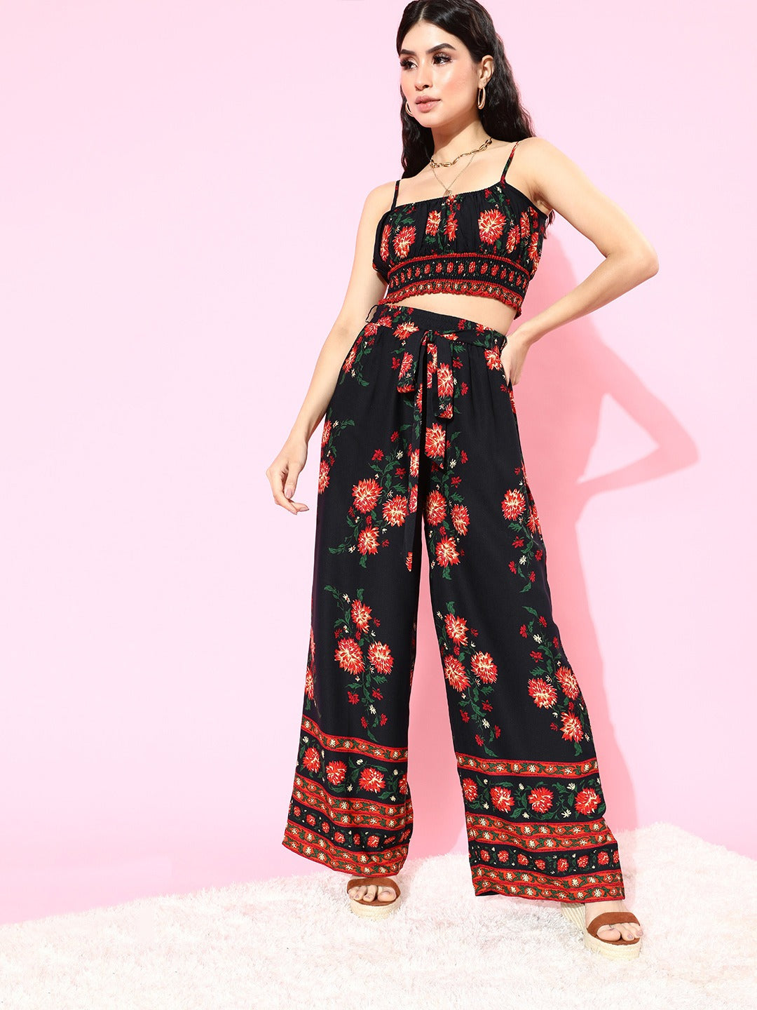 Berrylush Women Navy Blue & Red Floral Printed Cami Top & Trousers Set