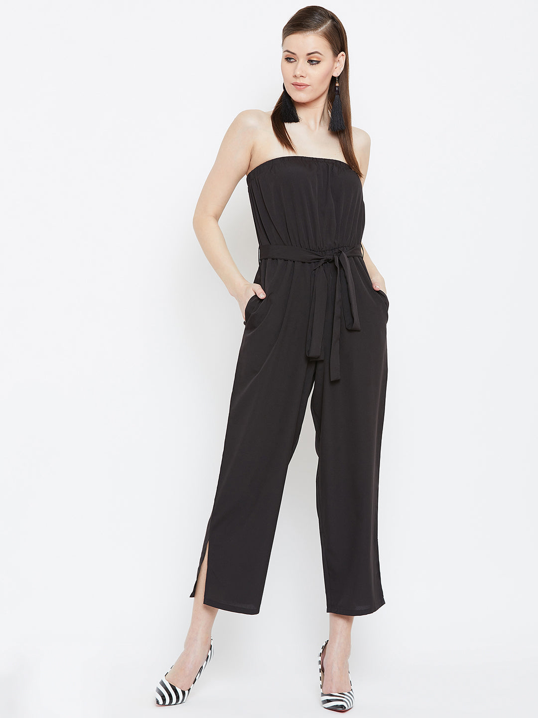 Berrylush Women Solid Black Off-Shoulder Waist Tie-Up Slited Jumpsuit