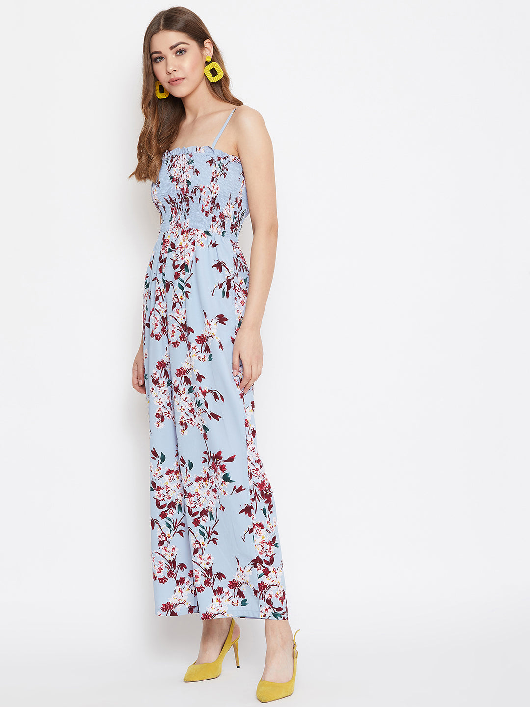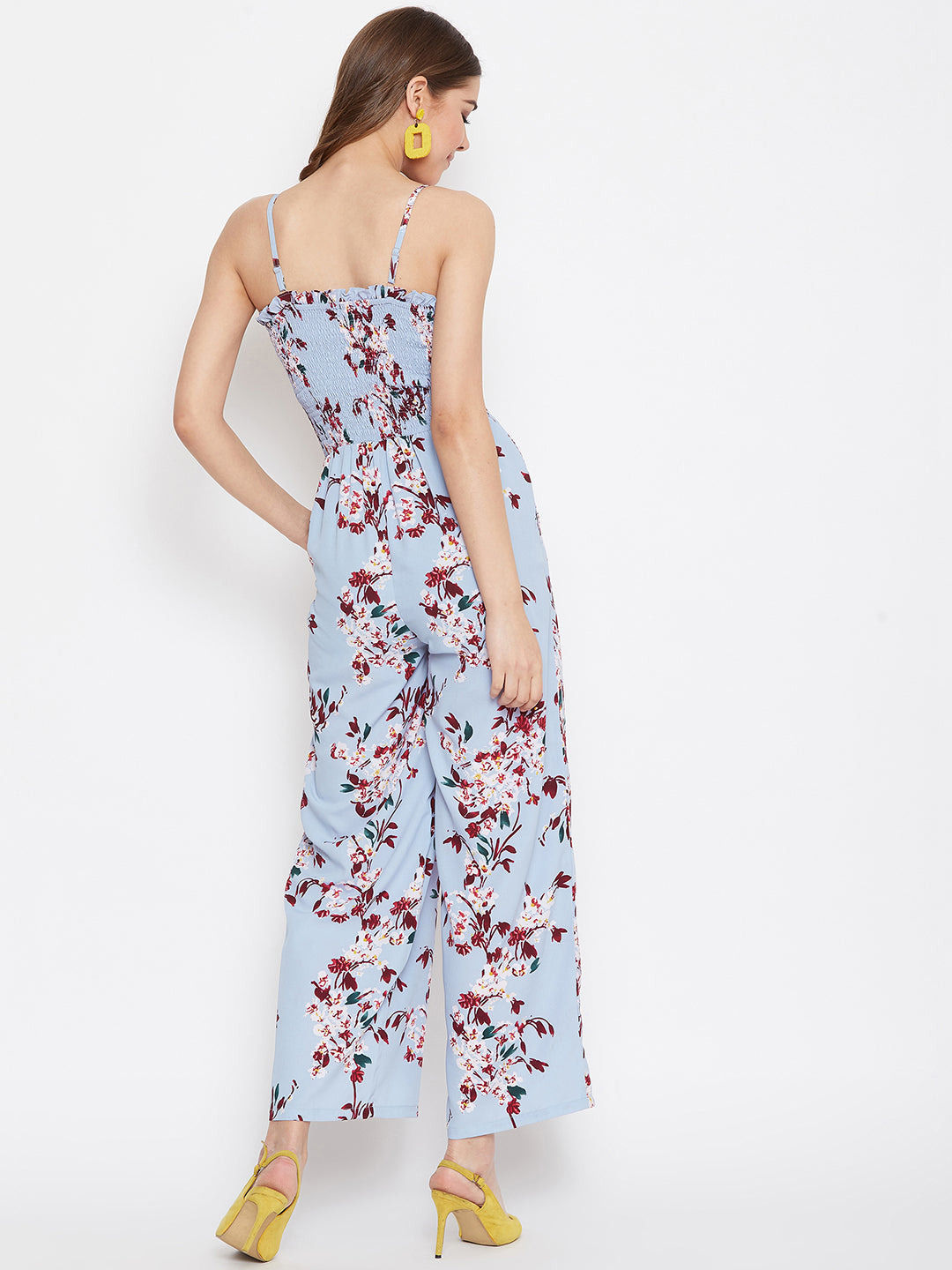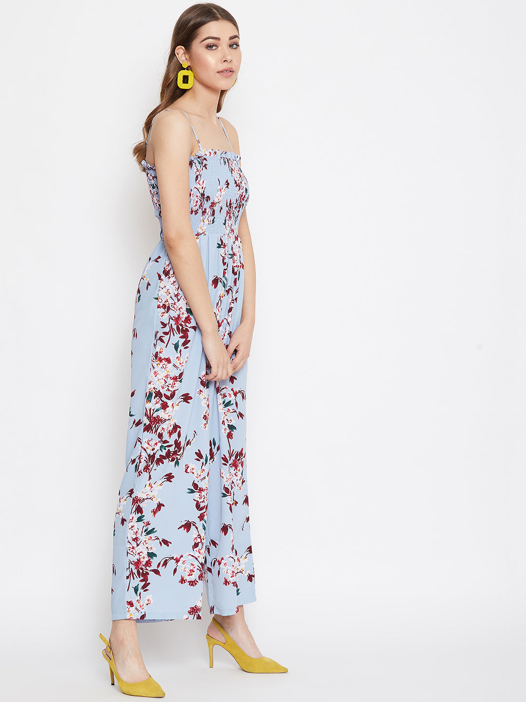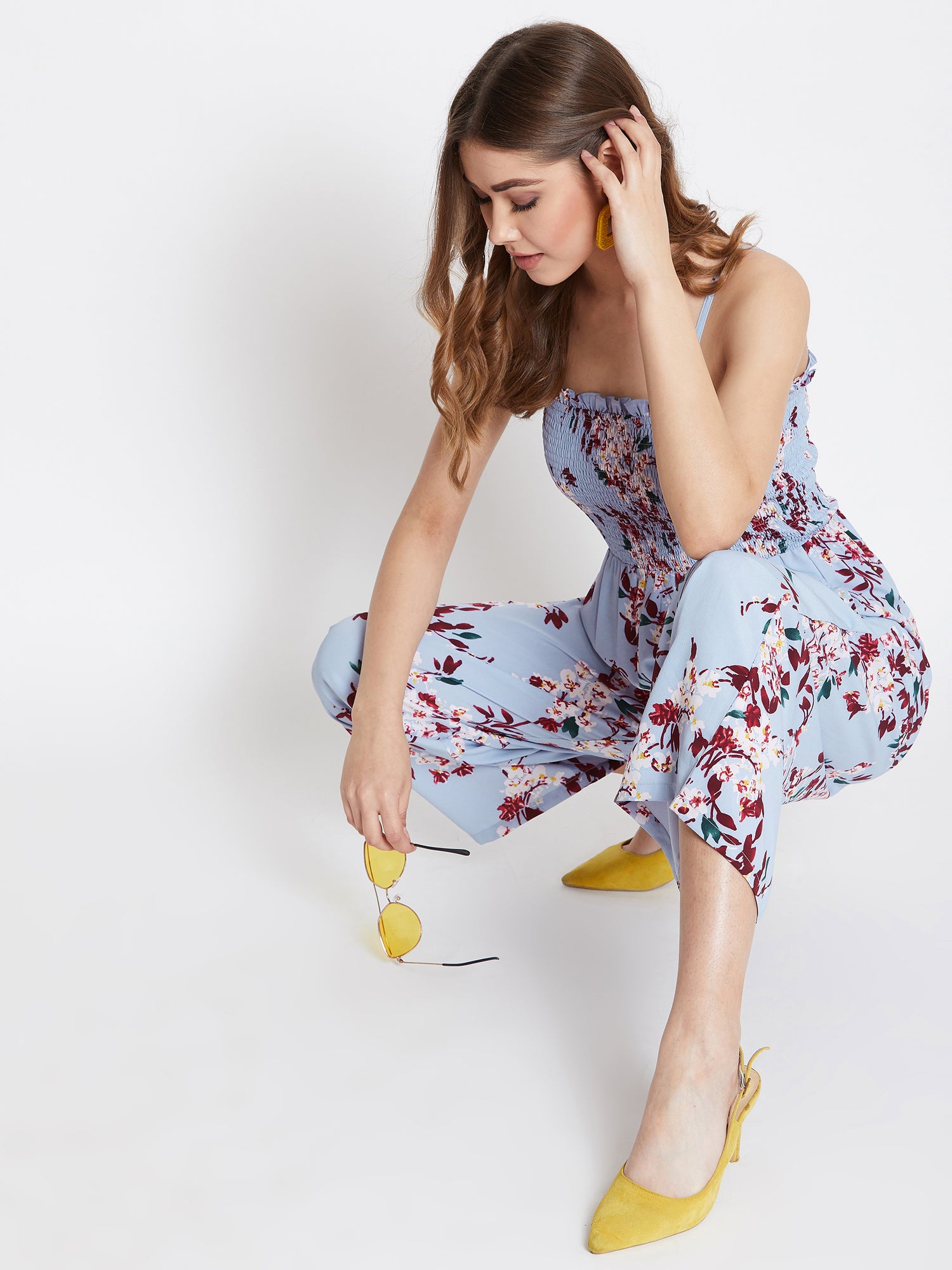 Berrylush Women Blue Floral Print Shoulder Strap Smocked Jumpsuit