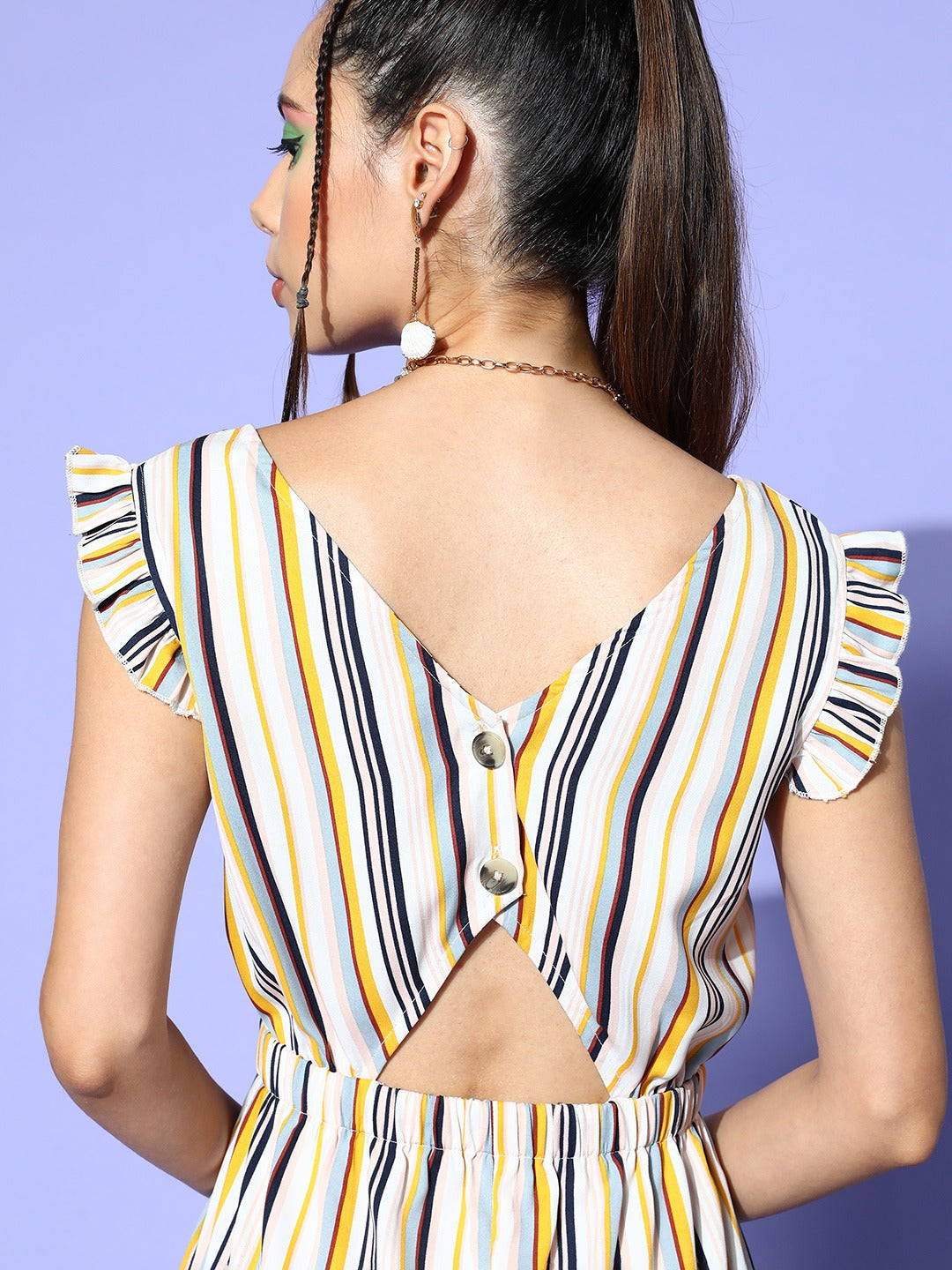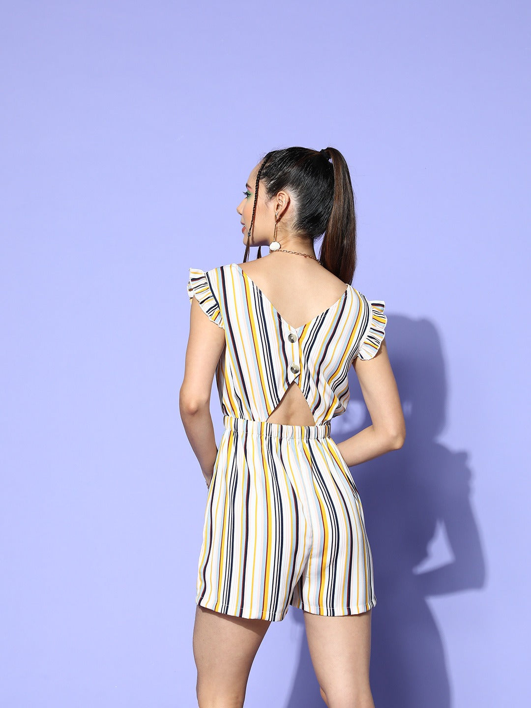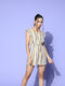 Berrylush Women White, Yellow, & Navy Blue Striped Pattern V-Neck Sleeveless Waist Tie-Up Ruffled Mini Jumpsuit