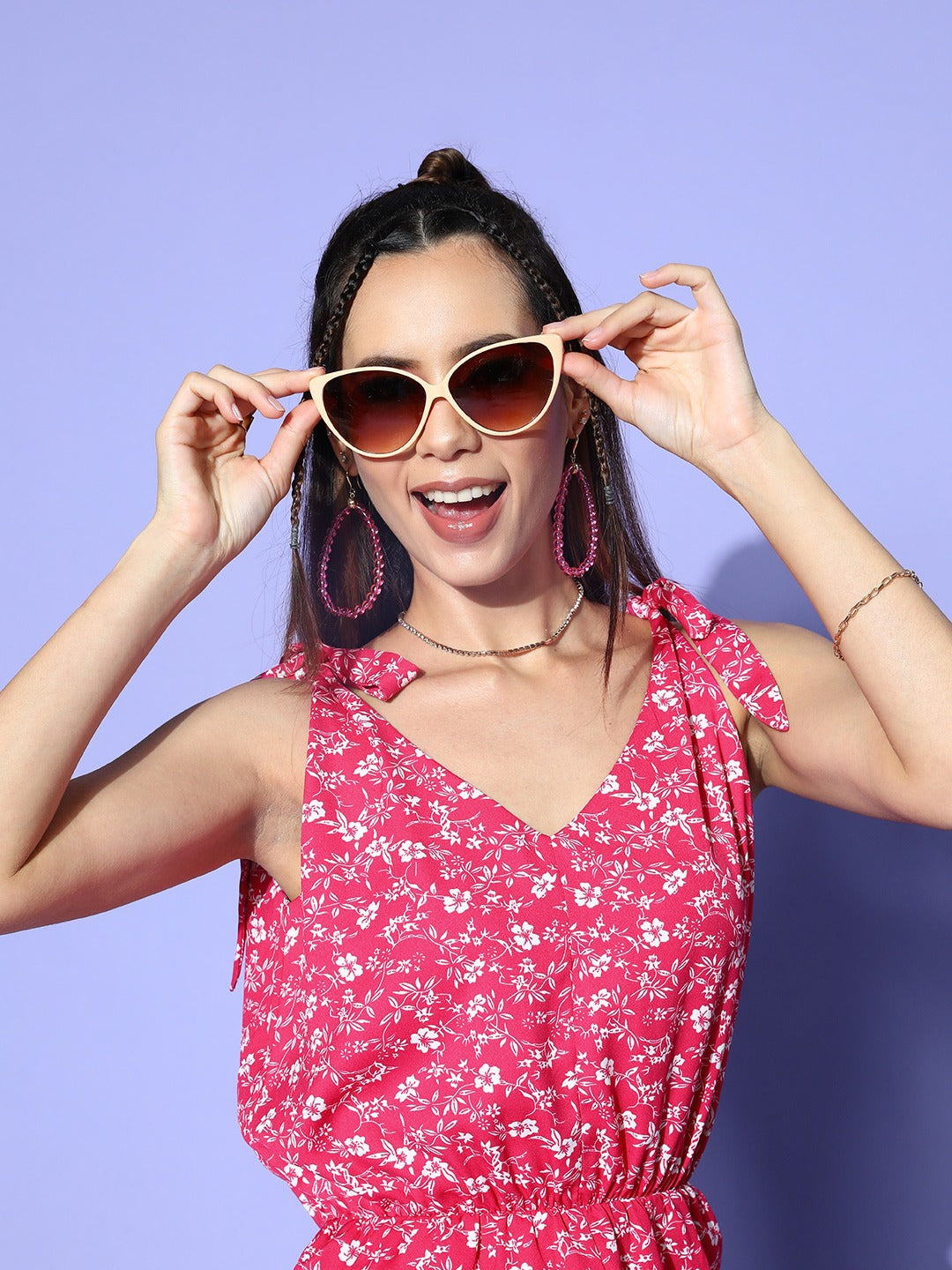 Berrylush Women Pink & White Floral Printed V-Neck Tie-Up Straps Sleeveless Gathered Mini Jumpsuit