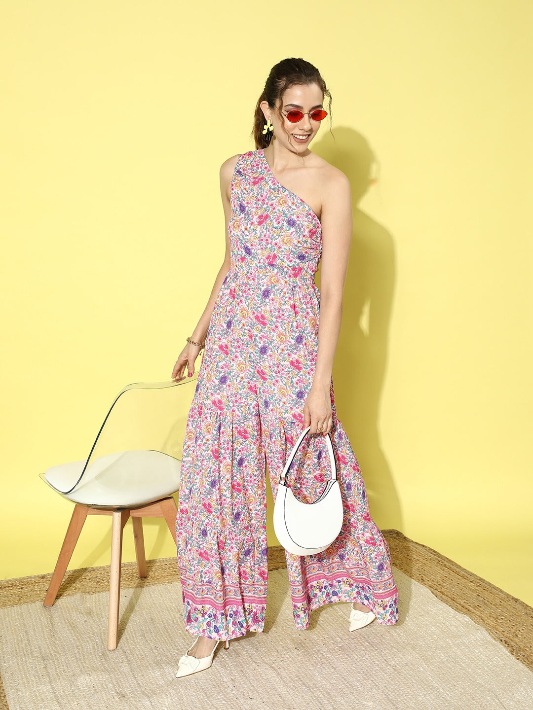 Berrylush Women Pink & Purple Floral Printed One-Shoulder Neck Sleeveless Wide-Leg Pleated Regular Jumpsuit