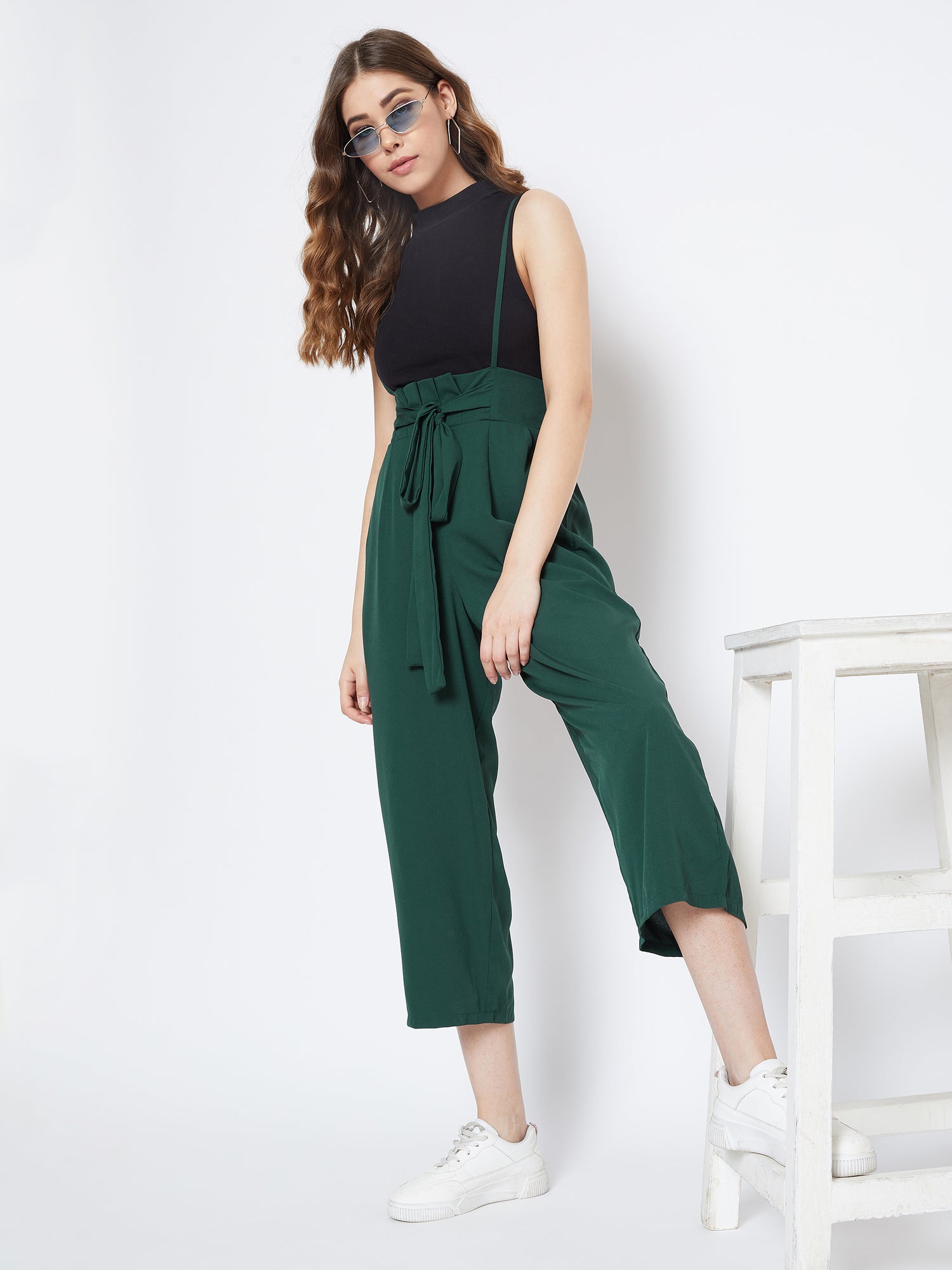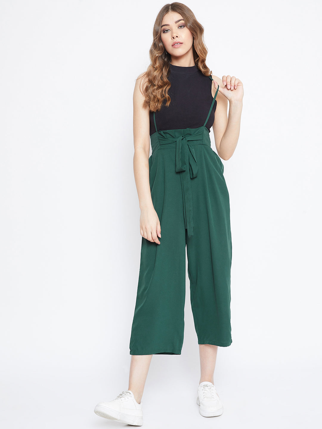 Berrylush Solid Green Smocked Back Tie-Up Capri Jumpsuit helps you to create a vacation-style staple. With its charming seamless green noodle straps, your tour will get stylish & comfortable support. Bring a trend that makes you be famous as a trendsetter, and for which you need to try this outfit. The tie-up detailing at the waist and smocked-back design offer a captivating appearance. For completing this exquisite look, match it with a pair of high-heeled ankle boots and a catchy pair of sunglasses you are all set for a cool trip; wear your extraordinary attitude and make everlasting memories. For making your voyage a never fading experience try this apparel from Berrylush and spread greenery wherever you go!