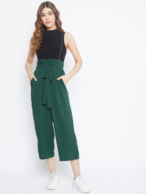 Berrylush Women Solid Green Smocked Back Tie-Up Capri Jumpsuit