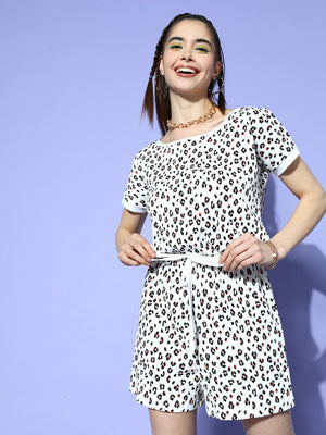 Berrylush Women White & Black Animal Printed Round Neck Tie-Up Waist Cotton Mini Jumpsuit