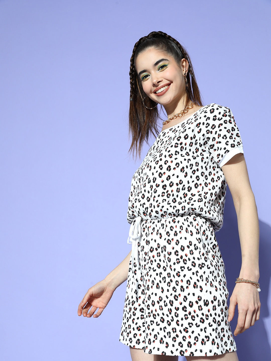 Stay casually cool yet chic at the same time this summer season by investing in this astonishing White Animal Printed Round Neck Cotton Mini Jumpsuit designed by Berrylush. Styled with a round neck design that gives your neckline a modest appearance and refined outline without exposing much skin. The short-regular sleeves offer your arms smart and appropriate coverage with uninterrupted movements. Comes with a two-pocket design that lends this jumpsuit amazing practical utility to hold onto your small belongings. Create a chic look for your weekend outing by wearing this jumpsuit with a pair of black boots, matching earrings, and a contrasting waist bag.