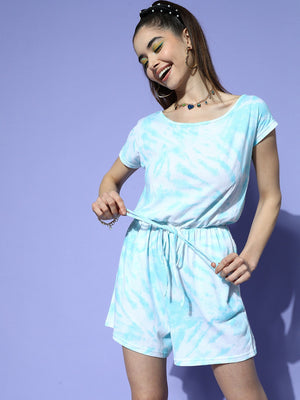 Berrylush Women Turquoise Blue & White Tie-Dye Printed Round Neck Two-Pocket Tie-Up Waist Cotton Mini Jumpsuit