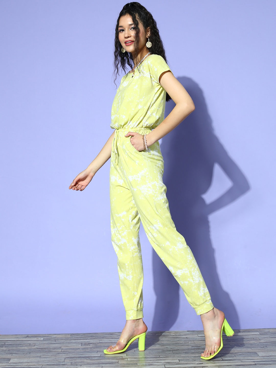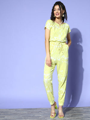 Conquer the world with your boho-chic and athleisure fashion statement by choosing this dazzling Yellow Tie-Dye Printed Round Neck Casual Basic Regular Jumpsuit from Berrylush. Beautifully designed with a majestic combination of yellow and white tie-dye print that gives this jumpsuit mesmerizing appearance with cool and artistic design. Flaunting waist tie-up surface styling that lends this jumpsuit a form-fitting silhouette with a cute decorative finish. In addition, the regular length offers your legs attractive and proper coverage to keep you cosy for a prolonged duration. Walk out of your house looking gorgeous on your next weekend trip by wearing this jumpsuit with matching heels, minimalistic pearl jewellery, and a sling bag.