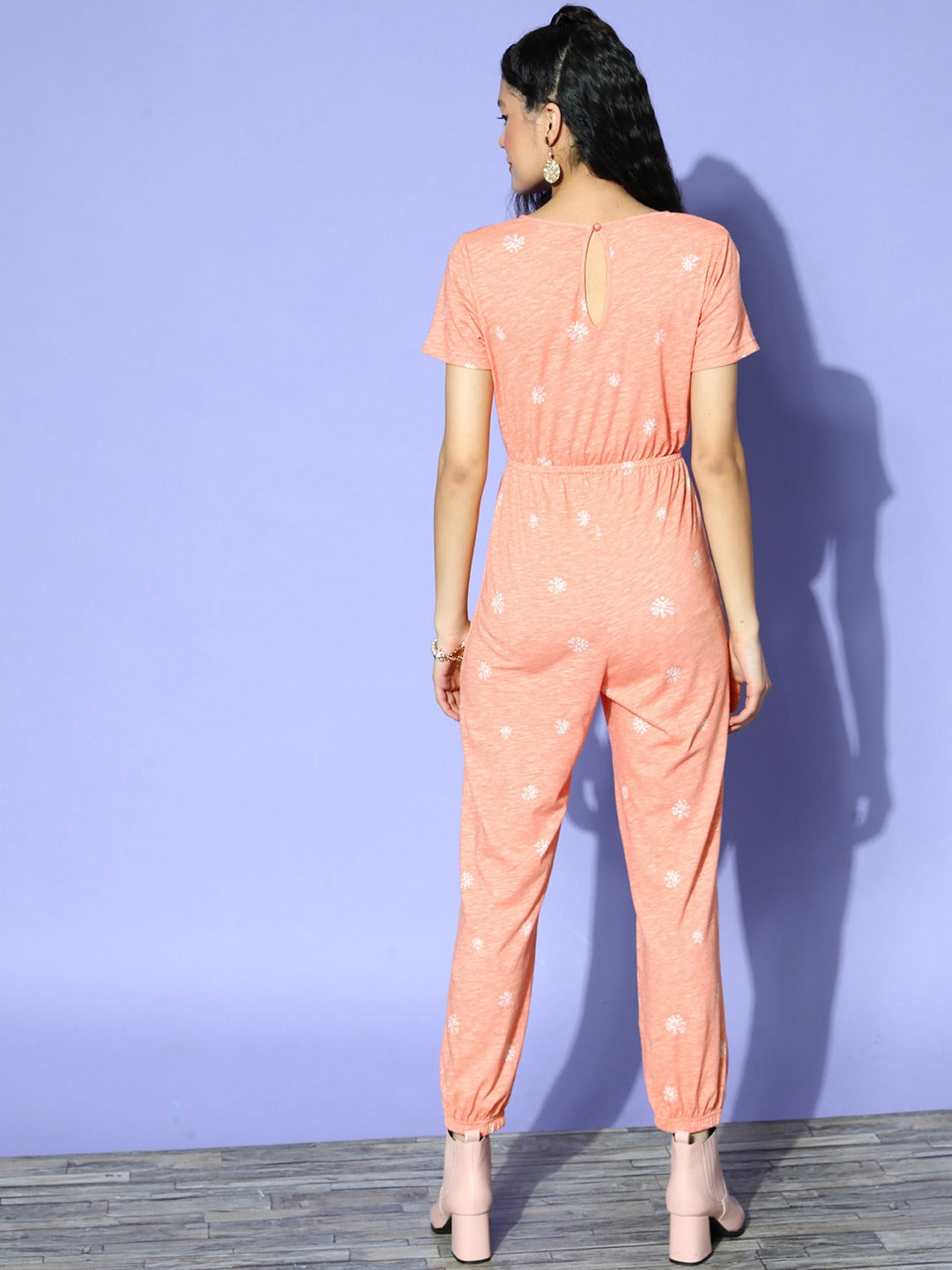 Be a canvas of living art and creativity by imbuing cinematic charm to your casual closet with this adorable Pink & White Abstract Printed V-Neck Basic Regular Jumpsuit from Berrylush. Adorned with a pretty V-neck design that gives your neckline an elegant vertical and taller impression. Designed with short-regular sleeves that lend your arms suitable and enticing coverage without any discomfort. The basic style makes this jumpsuit appear more stylish and sophisticated with a sleek finish. Wear this jumpsuit with your favourite sandals, floral stud earrings, and a chic shoulder bag to get a majestic look for any casual occasion.