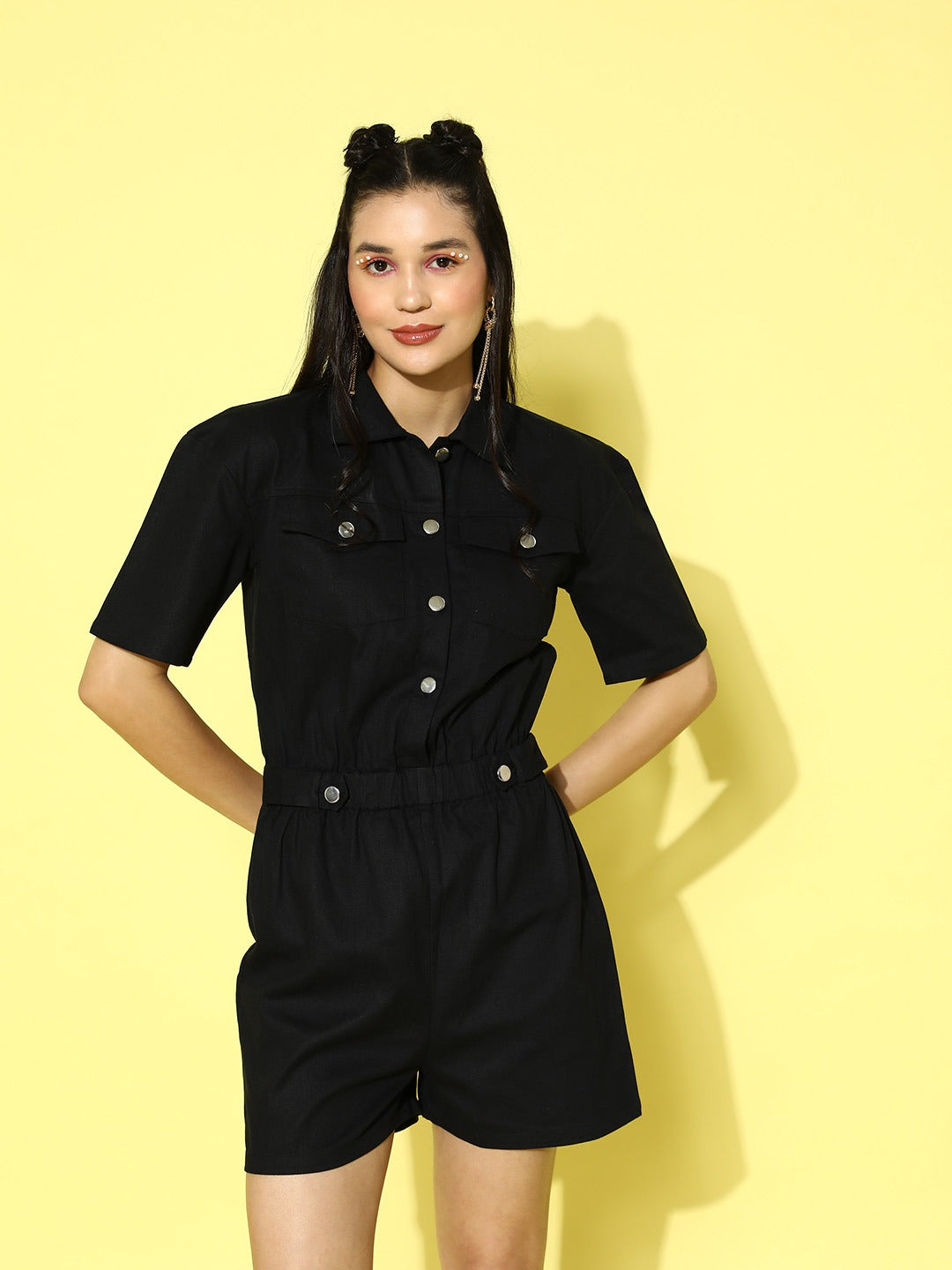 Define your personality and mood with bold colours just like this mesmerizing Solid Black Shirt Collar Neck Button-Up Cotton Gathered Mini Playsuit designed by Berrylush. The amusing duo of black shade and a solid pattern depicts your passionate side and gives off a chic vibe. Flaunting the gathered styling to give this playsuit an alluring and enticing look. Moreover, this playsuit comes with a button closure that gives you a curve-defining and convenient silhouette as per your comfort. Hang out with your friends at night with a stylish look by wearing this playsuit with a pair of caged heels, shimmery hoop earrings, and a sling bag.