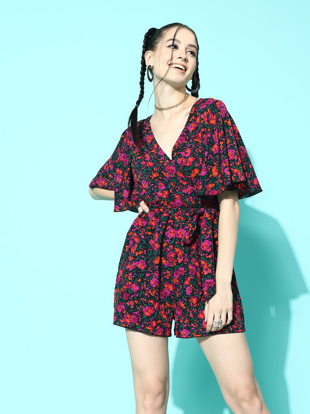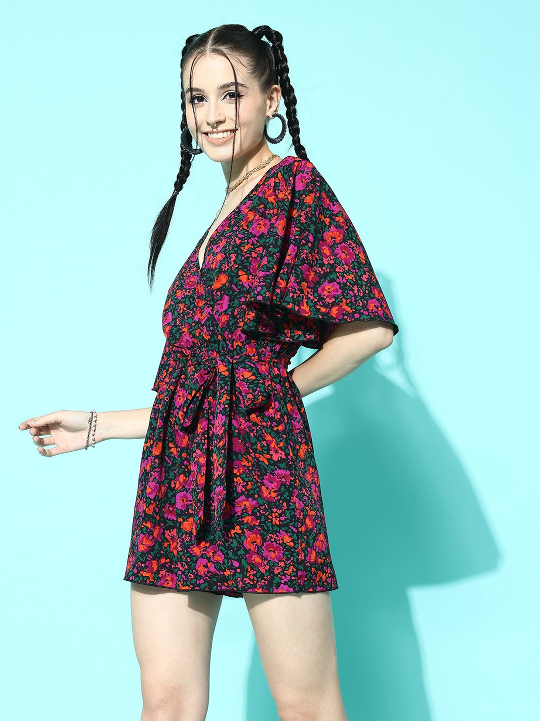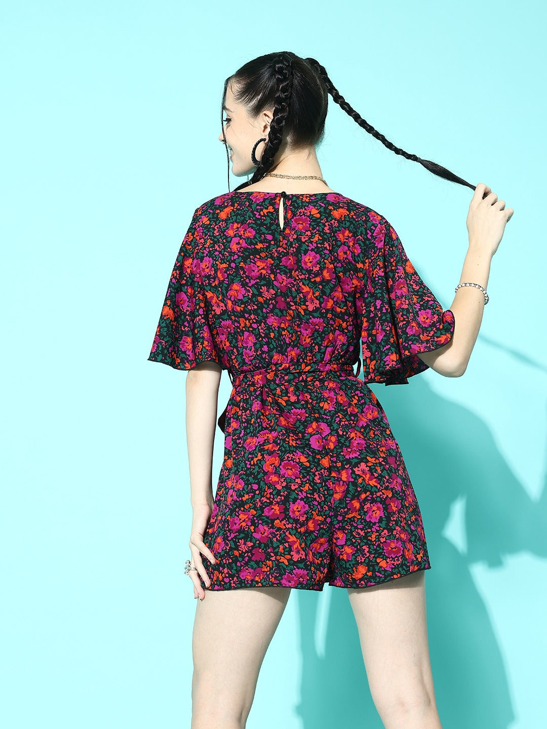 Looking for something casually classy and chic casual wear, then the best option for you is this gorgeous Purple & Green Floral Printed V-Neck Two-Pocket Tie-Up Waist Mini Jumpsuit designed by Berrylush. Beautifully decorated with a purple and green floral print that gives this jumpsuit a cinematic appearance with timeless style notes. Detailed with waist tie-up surface styling that offers this jumpsuit an additional fitting feature with a cute decorative finish. Comes with two pockets that let you carry your essentials conveniently. Get a smart look for any occasion by partnering this jumpsuit with a matching pair of loafers, minimalistic golden earrings, and a sassy handbag.