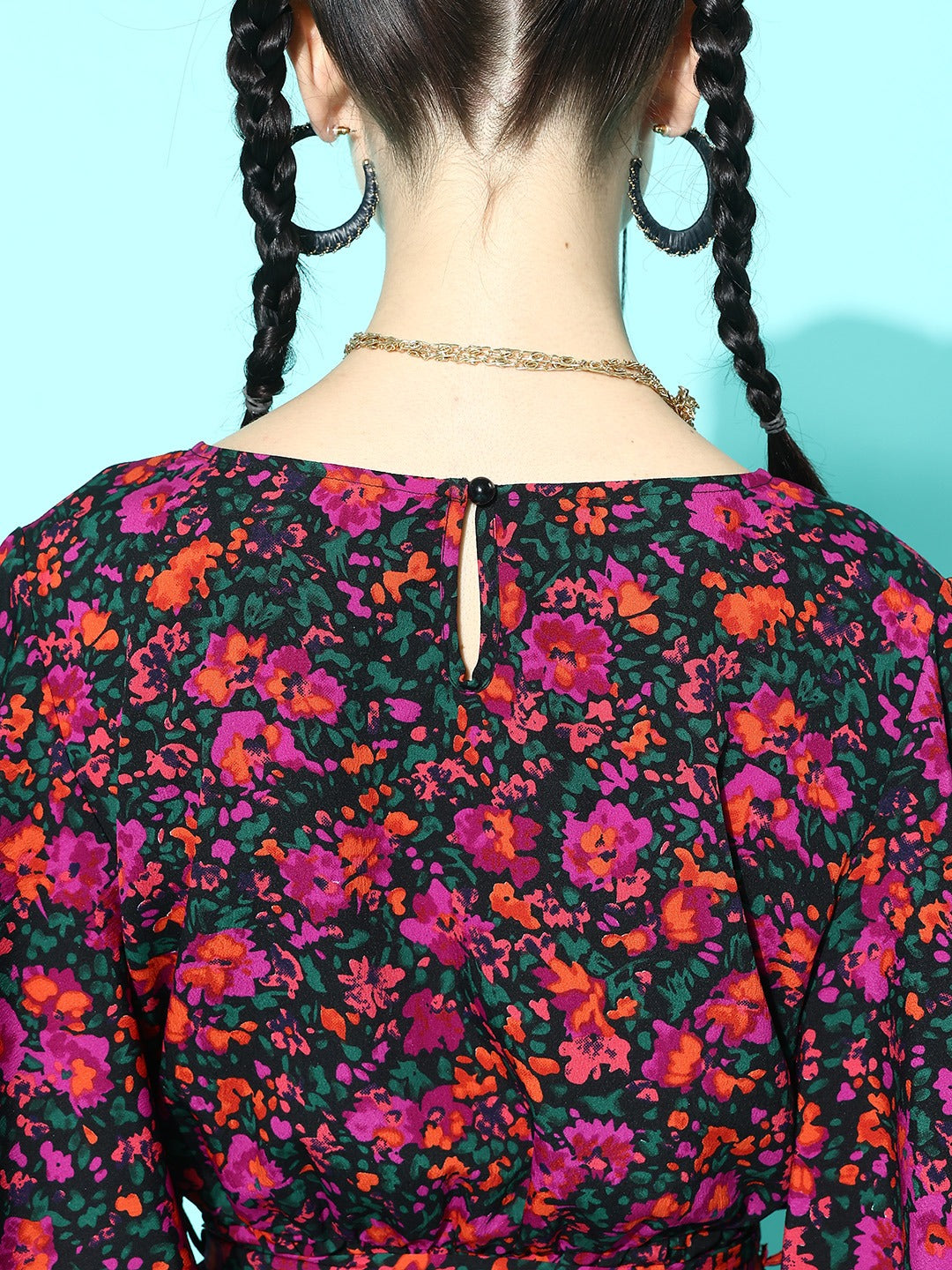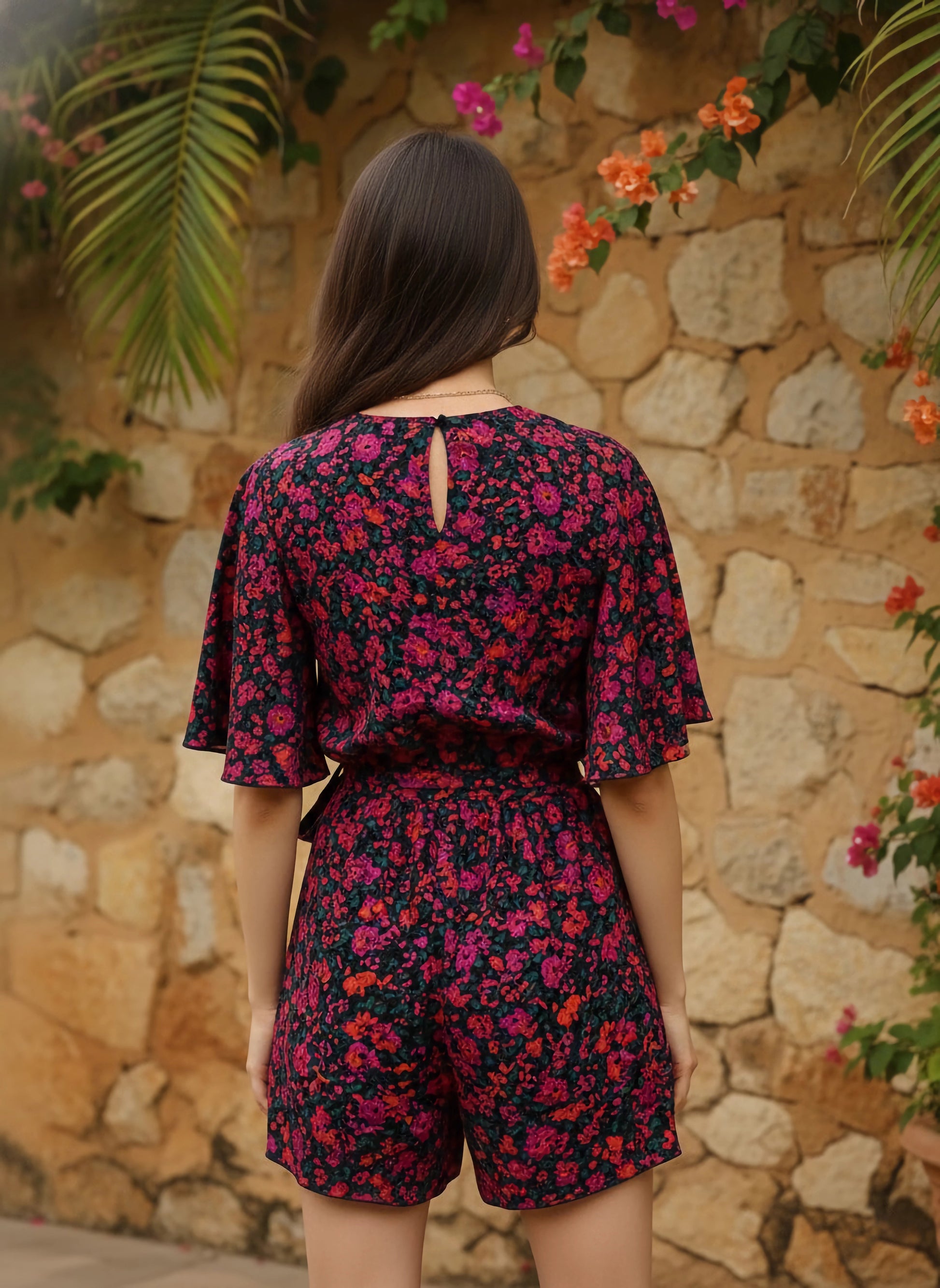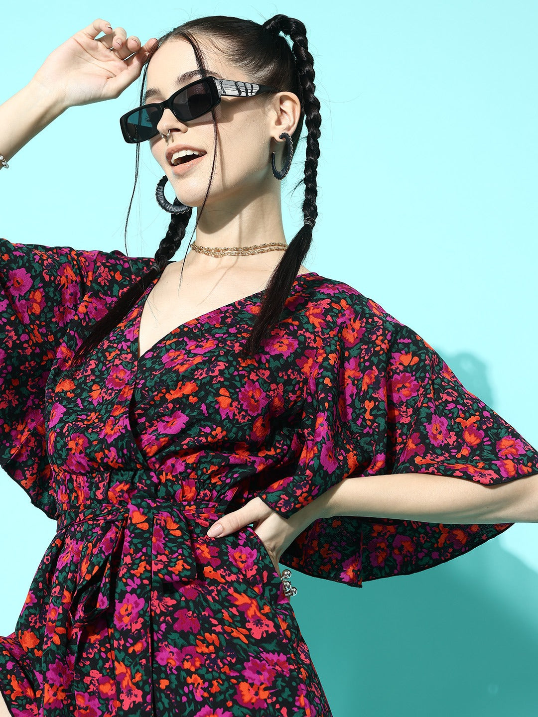 Looking for something casually classy and chic casual wear, then the best option for you is this gorgeous Purple & Green Floral Printed V-Neck Two-Pocket Tie-Up Waist Mini Jumpsuit designed by Berrylush. Beautifully decorated with a purple and green floral print that gives this jumpsuit a cinematic appearance with timeless style notes. Detailed with waist tie-up surface styling that offers this jumpsuit an additional fitting feature with a cute decorative finish. Comes with two pockets that let you carry your essentials conveniently. Get a smart look for any occasion by partnering this jumpsuit with a matching pair of loafers, minimalistic golden earrings, and a sassy handbag.
