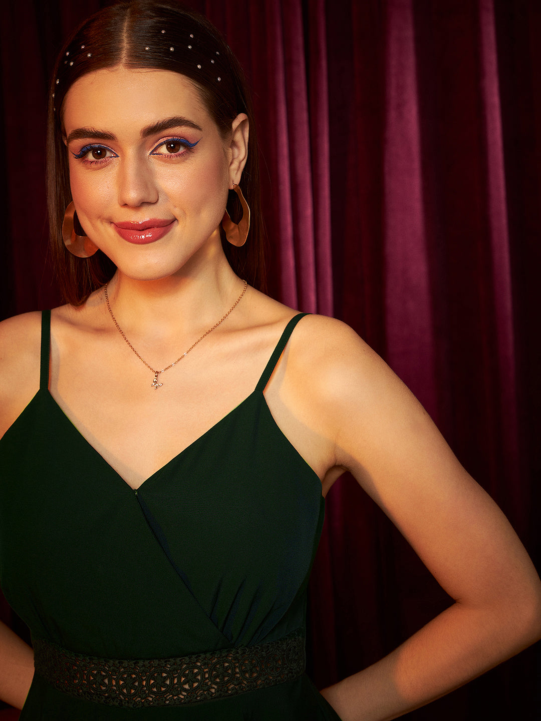 Introducing the Berrylush Solid Green V-Neck Sleeveless Waist Lace Inserts Zipper-Up Layered Mini Jumpsuit - a stunning ensemble crafted for the bold and beautiful. This exquisite piece, perfect for any party occasion, boasts a deep V-neck and sleeveless design that seamlessly flatters your silhouette. The mini garment length paired with a flared hemline accentuates your legs, making you stand taller among your peers. Constructed from high-quality polyester in a rich green hue, it promises both comfort and durability without compromising style. Intricate lace inserts add an elegant touch of femininity to this sophisticated outfit while its layered detailing ensures you'll capture everyone's attention. Designed with practicality in mind, it features a convenient zipper closure ensuring ease of wear without sacrificing elegance or style—true to Berrylush’s commitment to fashion-forward designs that empower women through their wardrobe choices: opaque transparency means confidence in every step!