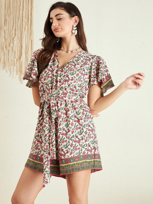 Berrylush Women Pink & Green Floral Printed V-Neck Flutter Sleeves Waist Tie-Up Pleated Mini Playsuit